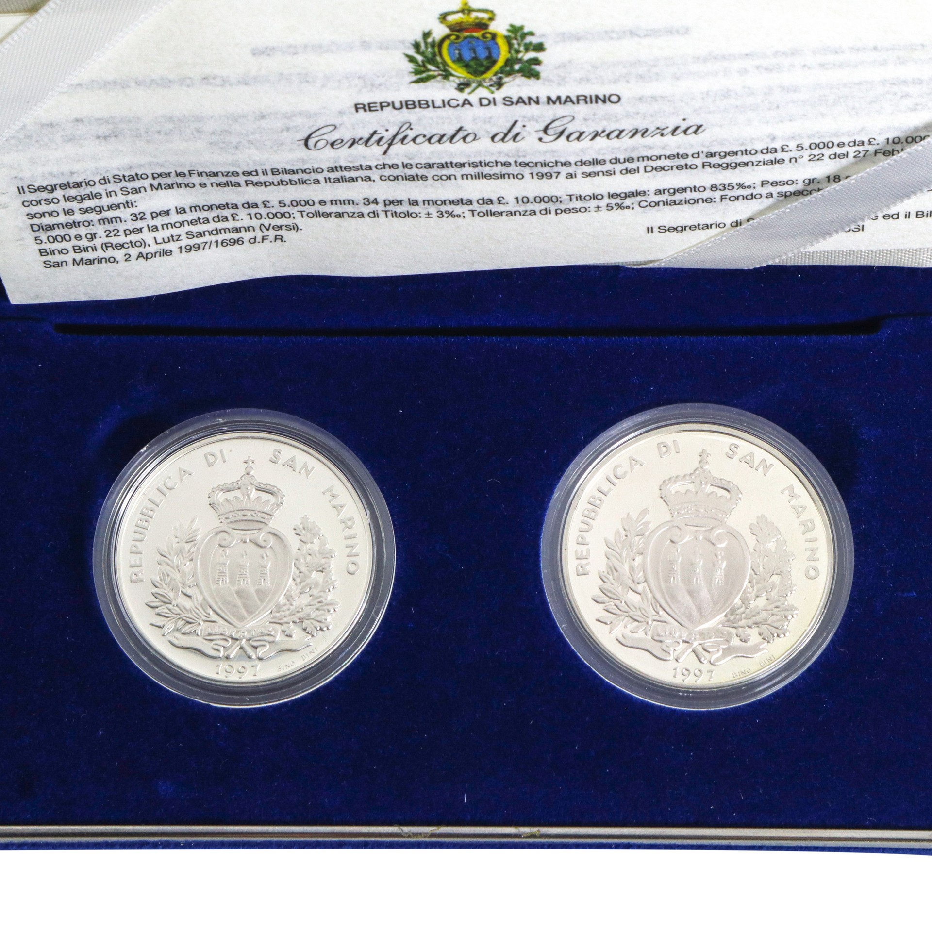 Grandi navigatori Giovanni Caboto e Vasco Da Gama, monete celebrative, 1997 Titolo legale argento 835% L.5000: GR.18 diametro mm. 32 L.10000: GR.22 diametro mm. 34 REPUBBLICA DI SAN MARINO