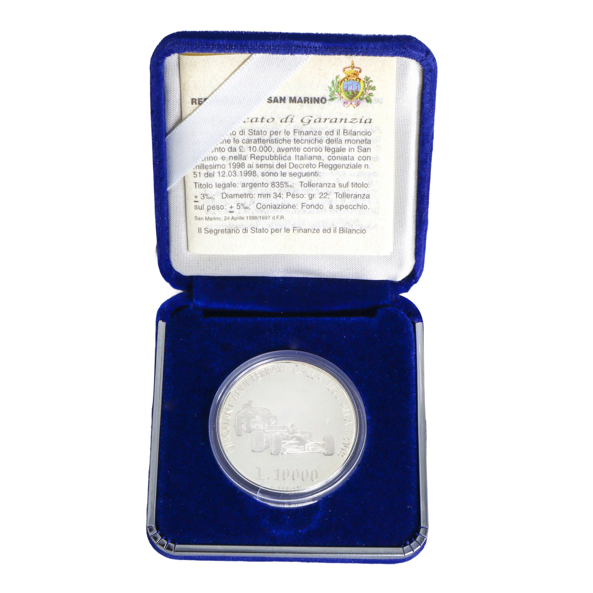 Moneta d'argento celebrativa "50 anni Ferrari", 1998 Titolo argento 835% L 10000: GR. 22 diametro mm. 34 REPUBBLICA DI SAN MARINO