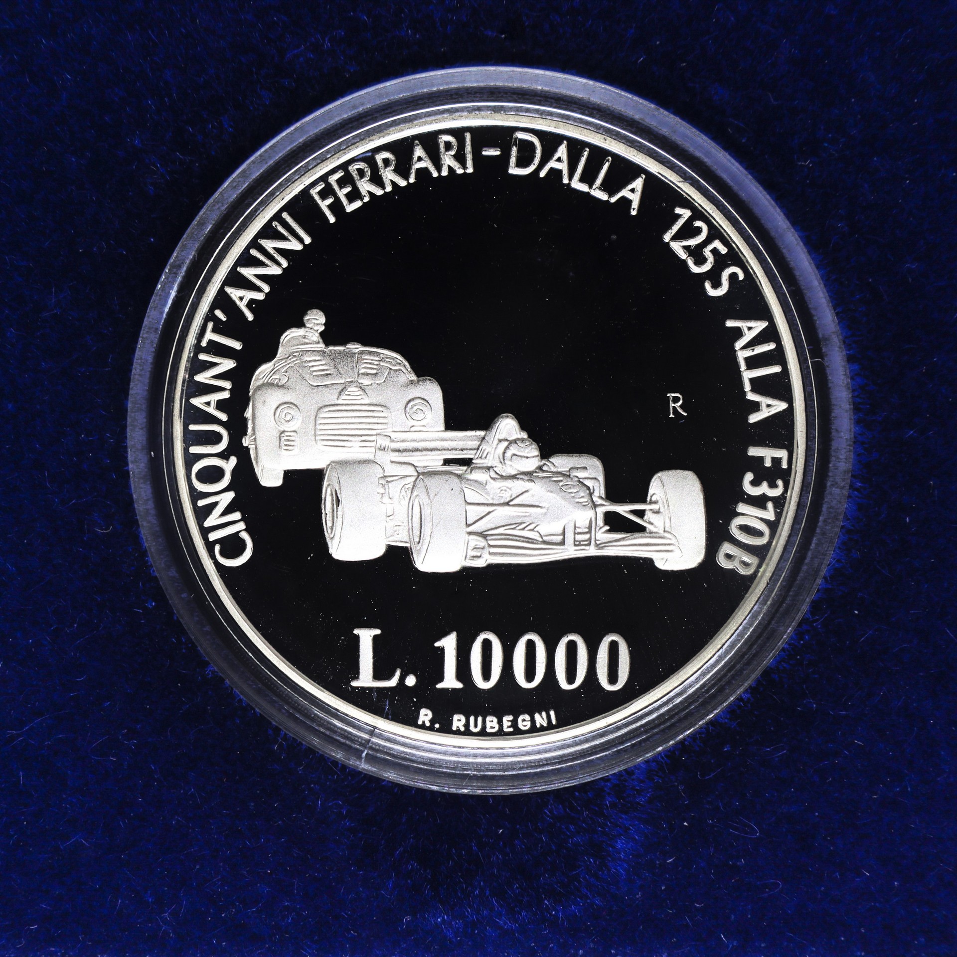 VERSO MONETA: Due modelli di Ferrari 125 S F 310 B contornati dalla legenda "CINQUANT'ANNI FERRARI DALLA 125 S ALLA F 310 B" L.10000 R. RUBEGNI
