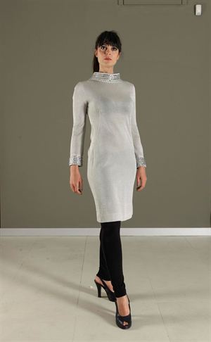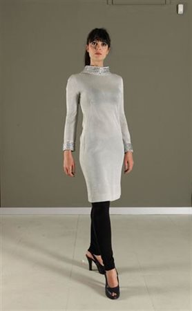 LANVIN Abito in lamè argentato a collo e bordo manica alto ricamato con paillettes argentate, anni '60 Tg. M LANVIN 1960's silver lamè cocktail dress embroidered with silver paillettes on collar a cuffs size: M