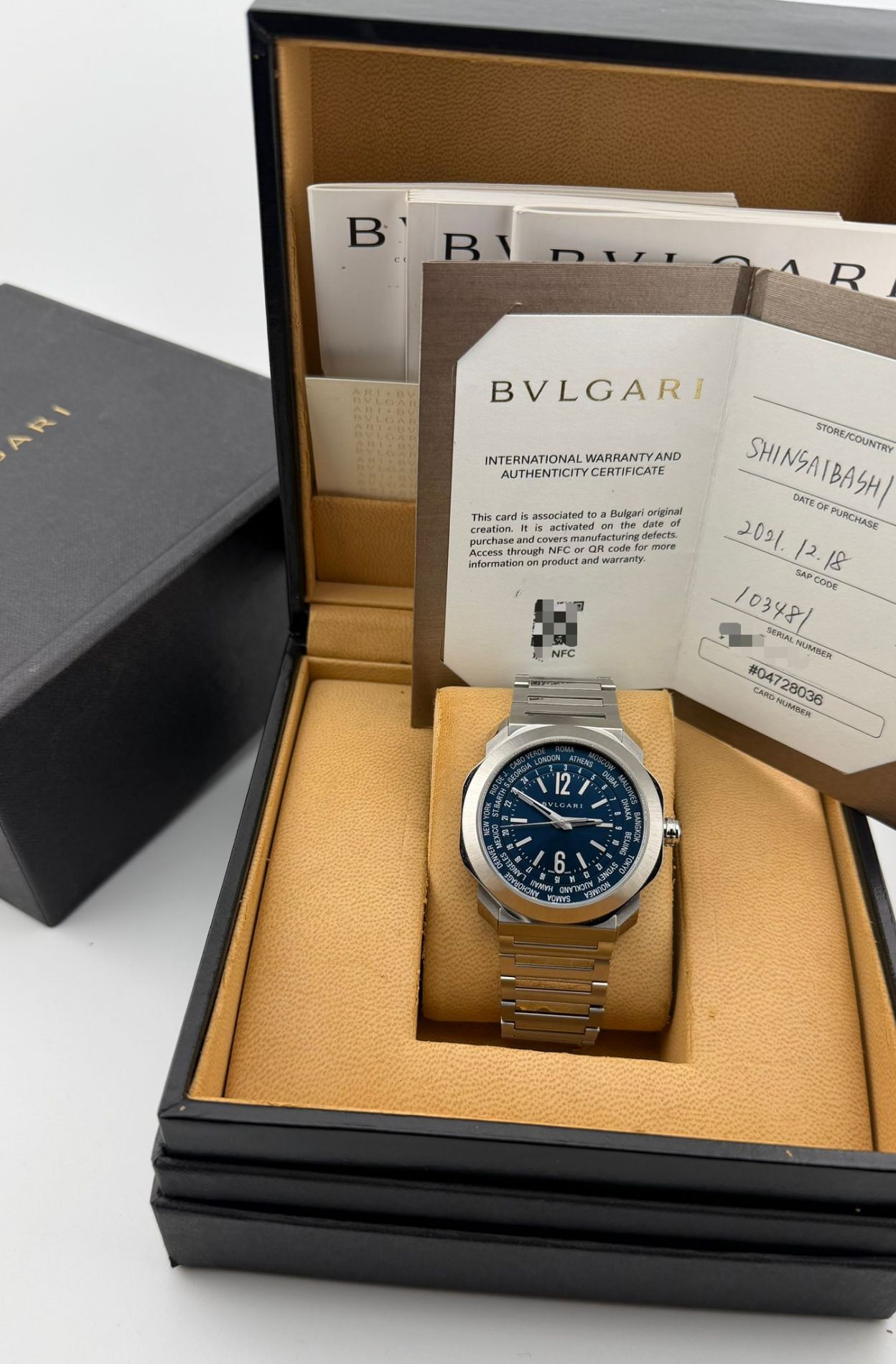 MARCHIO: Bulgari MODELLO: Octo Roma Worldtimer REFERENZA: 103481 NUMERO SERIALE: BVIPXXXXX MATERIALE CASSA: Acciaio DATA DI ACQUISTO: 2021/12/18 DIAMETRO: 41mm BRACCIALE: Acciaio MOVIMENTO: Automatico COLORE QUADRANTE: Blu MATERIALE VETRO: Vetro Zaffiro CORREDO: documenti originali Bulgari, no box - COMMISSIONE D’ASTA 25%