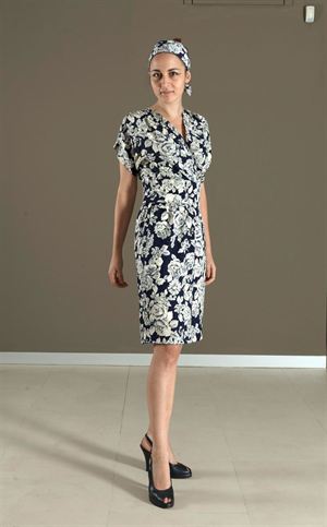 YSL LINEA RIVE GAUCHE Abito in seta da giorno in stampa floreale avorio su fondo blu, scollatura a V, fusciacca e banda per capelli, anni '80 Tg. 40 YSL LINEA RIVE GAUCHE 1980's silk , V-neck day dress with blue and ivory floral print and headband Italian size: 40