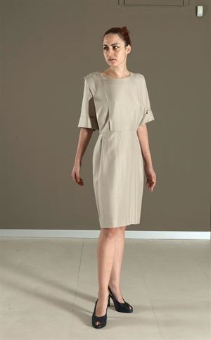 YSL LINEA RIVE GAUCHE Abito da giorno in seta ecru manica a gomito con risvolto, taglio in vita e spalla leggermente imbottita, chiusura sulla schiena con cerniera e sei bottoni, anni '80 Tg. M YSL / RIVE GAUCHE 1980's silk ecru day dress with, cuffed elbow length sleeves, seam at waist, slightly padded shoulders and back zip with 6 buttons size: M