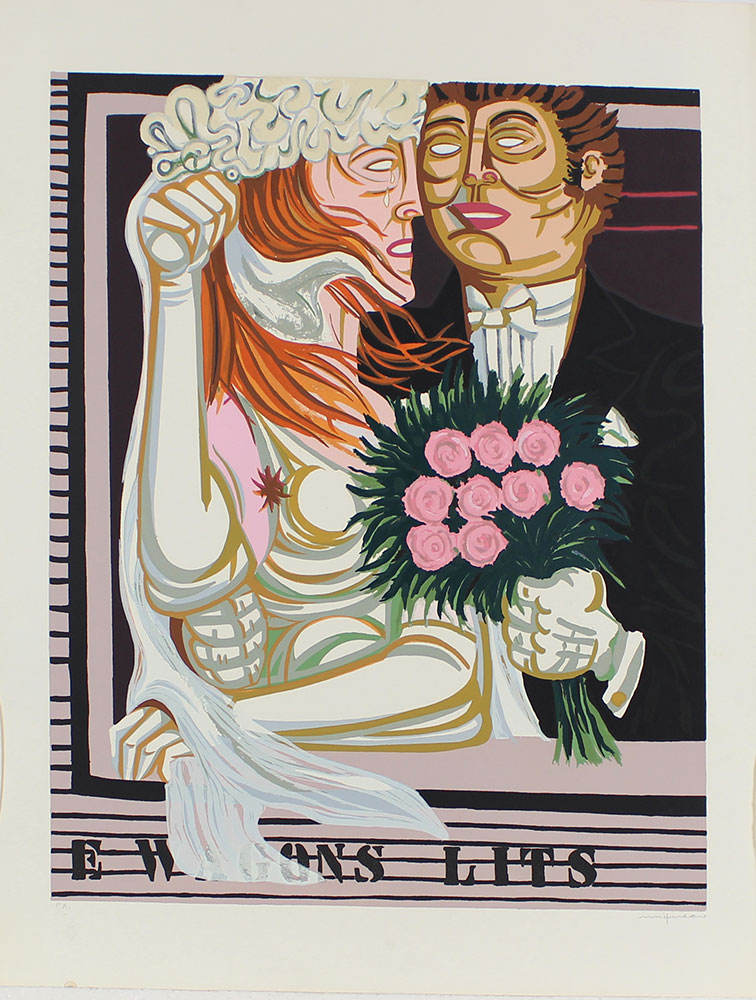 AA.VV. cartella contenente 4 litografie di Alberto Sughi, Ernesto Treccani, Giuseppe Migneco e Antonio Ialenti litografie su carta (l'opera di Migneco è una serigrafia), cm. 70x50 - 70x50 - 75x60 - 60x45, es. 78/125 - 51/100 - P.A. - P.A. firmate in basso a destra, la serigrafia di Migneco presenta un timbro a secco "E" in basso a sinistra e un timbro con i dati dell'opera e il titolo "Viaggio di Nozze" al retro senza cornici