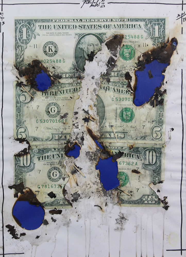 Hide Peter Negazione, 2013 tecnica mista, fiammiferi, banconote stampate e...