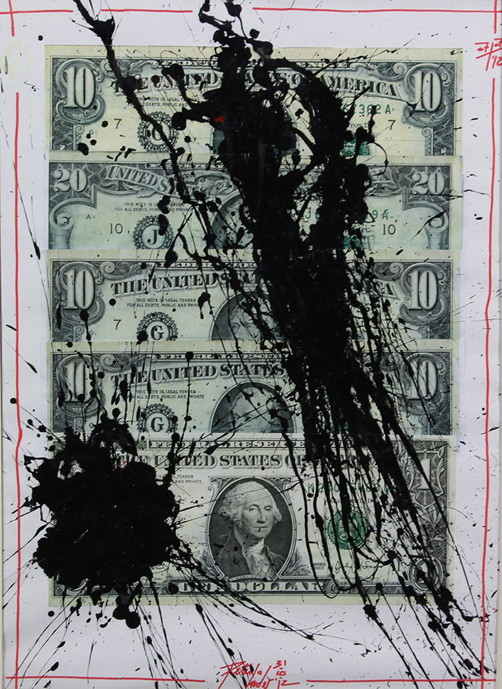 Hide Peter Petrolio, 2012 tecnica mista e banconote stampate su carta, cm. 70x50 firmata e datata in basso al centro, datata in alto a destra, certificato di autenticità e di archiviazione dell'artista su fotografia