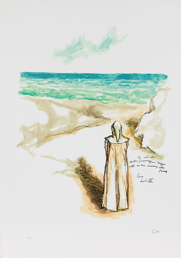 Guttuso Renato Dante, Divina Commedia Purgatorio C. III serigrafia su carta, cm. 70x50, es. 23/150 firmata in basso a destra, certificato di autenticità e garanzia dell'Istituto Poligrafico d'Arte Italiano di Roma senza cornice