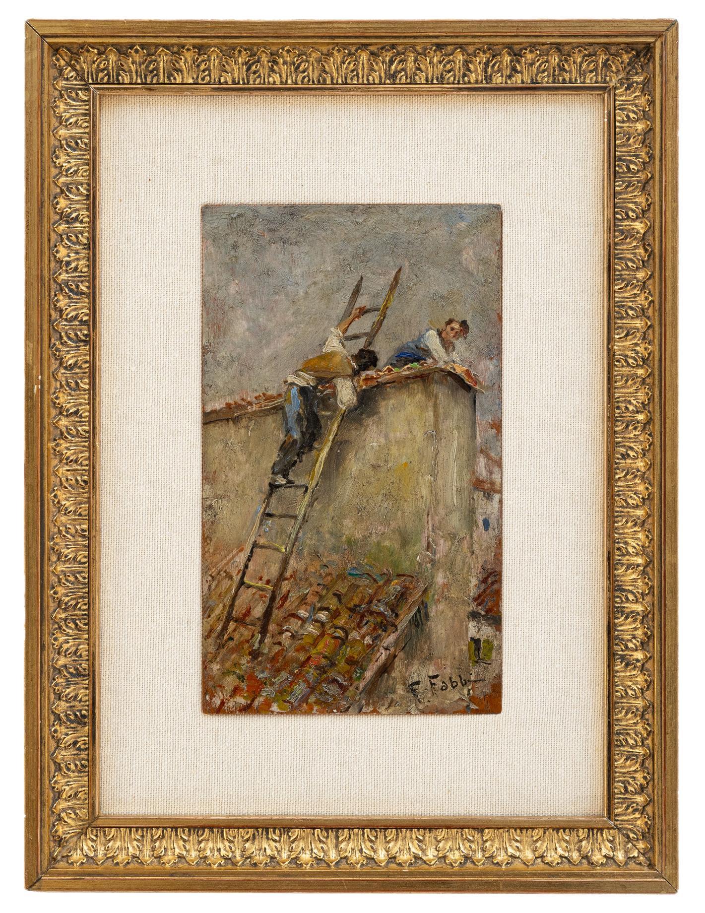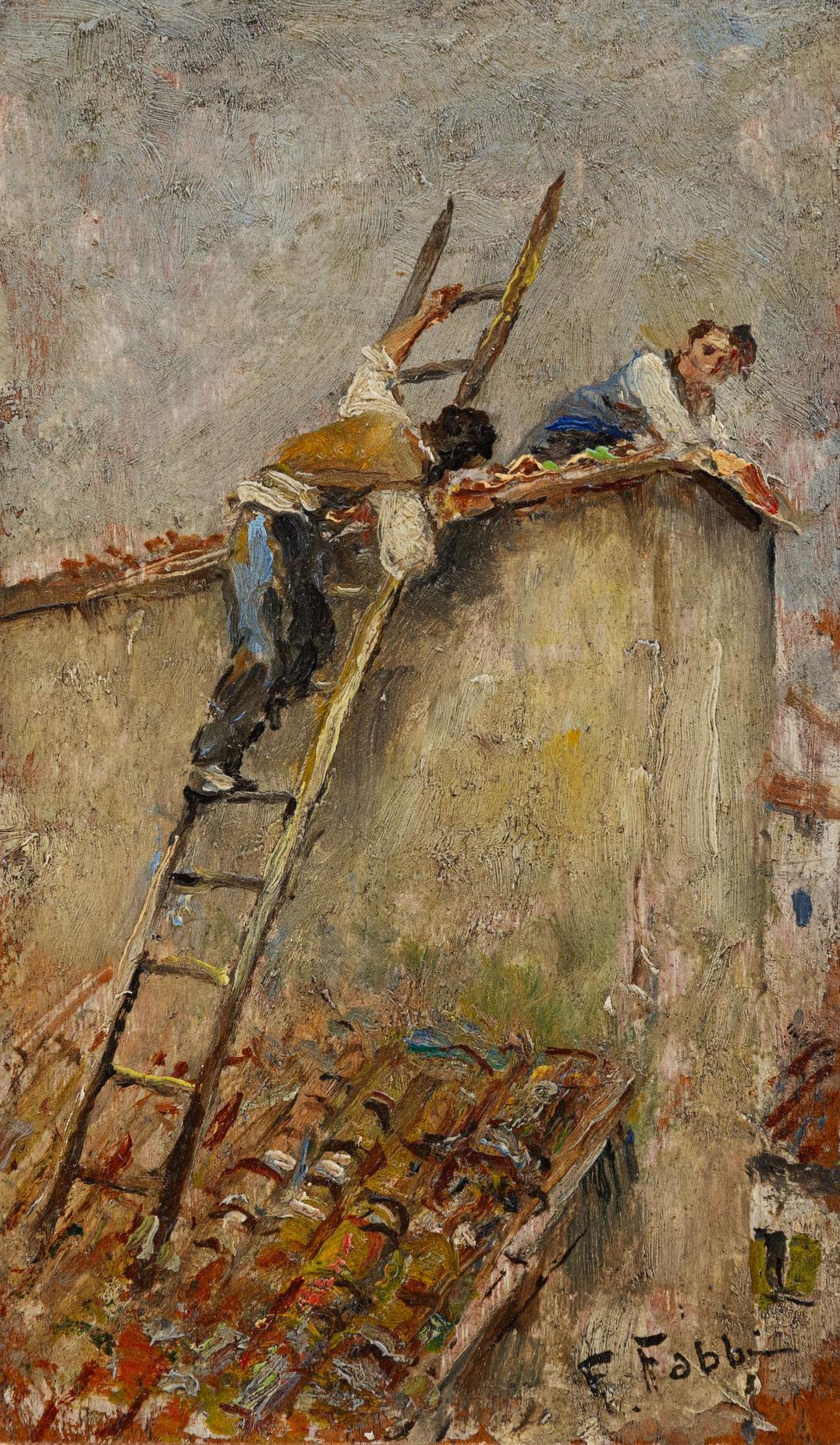 - Fabio Fabbi nacque a Bologna il 18 luglio 1861, figlio di Giuseppe ed Emilia Negri. Nel 1876, ottenne "onorevoli menzioni" in varie discipline presso la Reale Accademia di Belle Arti di Bologna, tra cui scultura statuaria, ritratto dal vero, elementi di figura e copia da stampa (Stivani-Borgogelli, 1981). Dopo aver completato i suoi studi, si trasferì a Firenze, dove frequentò i corsi di scultura all'Accademia di Belle Arti sotto la guida di Augusto Rivalta.Nel 1880 si diplomò e nel 1883 vinse il premio governativo dell'Accademia di Firenze per il bassorilievo dal titolo "Una questione d'onore." Nel 1886 iniziò una serie di viaggi in Egitto e altri paesi del Mediterraneo che influenzarono significativamente la sua produzione artistica. Fabbi si distinse come rappresentante della corrente pittorica orientalista, seguendo l'estetica verista di Alberto Pasini e sperimentando un eclettismo accademico.Tra le opere di Fabbi, poche sono di facile reperimento, ma tra queste ricordiamo "Moschea" e "Quattro torri." Partecipò a varie mostre, esponendo dipinti come "Un terrazzo ad Alessandria" nel 1888 e vincendo premi all'Esposizione Internazionale di Monaco per i dipinti "La vendita di una schiava" e "I sette peccati mortali."Negli anni successivi, Fabbi si dedicò anche a dipinti di soggetto religioso, presentando opere come "Annunciazione" e "Cristo deriso." Mantenne rapporti vivaci con l'Emilia, collaborando con il fratello Alberto in opere come "S. Giovanni decollato" e "Sacro Cuore con s. Antonio abate e s. Antonio Maria Zaccaria."Nel corso della sua carriera, Fabbi ricevette riconoscimenti, tra cui la nomina a professore a Firenze nel 1893, l'accademia a Bologna nel 1894 e il titolo di Cavaliere della Corona d'Italia nel 1898. Nel 1936, si trasferì da Bologna a Casalecchio di Reno, dove morì il 24 settembre 1945.Fabbi non solo eccelleva come pittore ma si distinse anche come illustratore, contribuendo a più di cento volumi, tra cui classici della letteratura e romanzi d'avventura. Illustrò anche per la rivista Fiammetta nel 1896 e nel 1936 presentò modelli di medaglie alla Mostra Internazionale del Sempione di Milano. Nel 1911, partecipò all'Esposizione d'arte cristiana moderna di Parigi.Il fratello di Fabbi, Alberto, nacque il 20 settembre 1858, seguendo un percorso artistico simile. Ritrattista e illustratore, partecipò alle esposizioni di belle arti a Bologna e si distinse nel gruppo di disegnatori satirici bolognesi. Morì il 21 maggio 1906 a Bologna.
