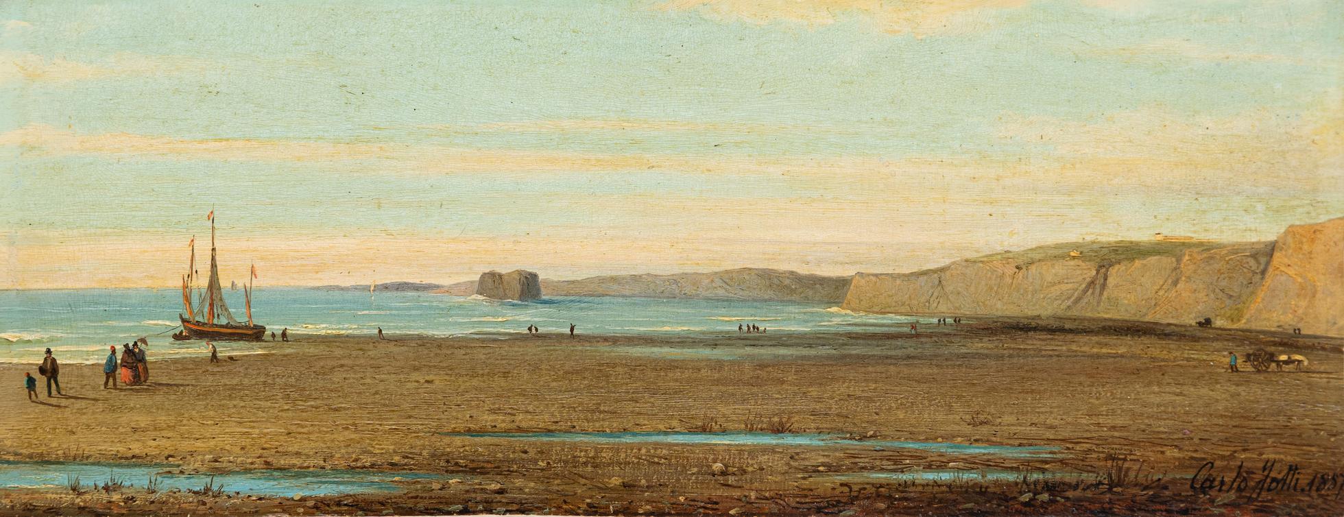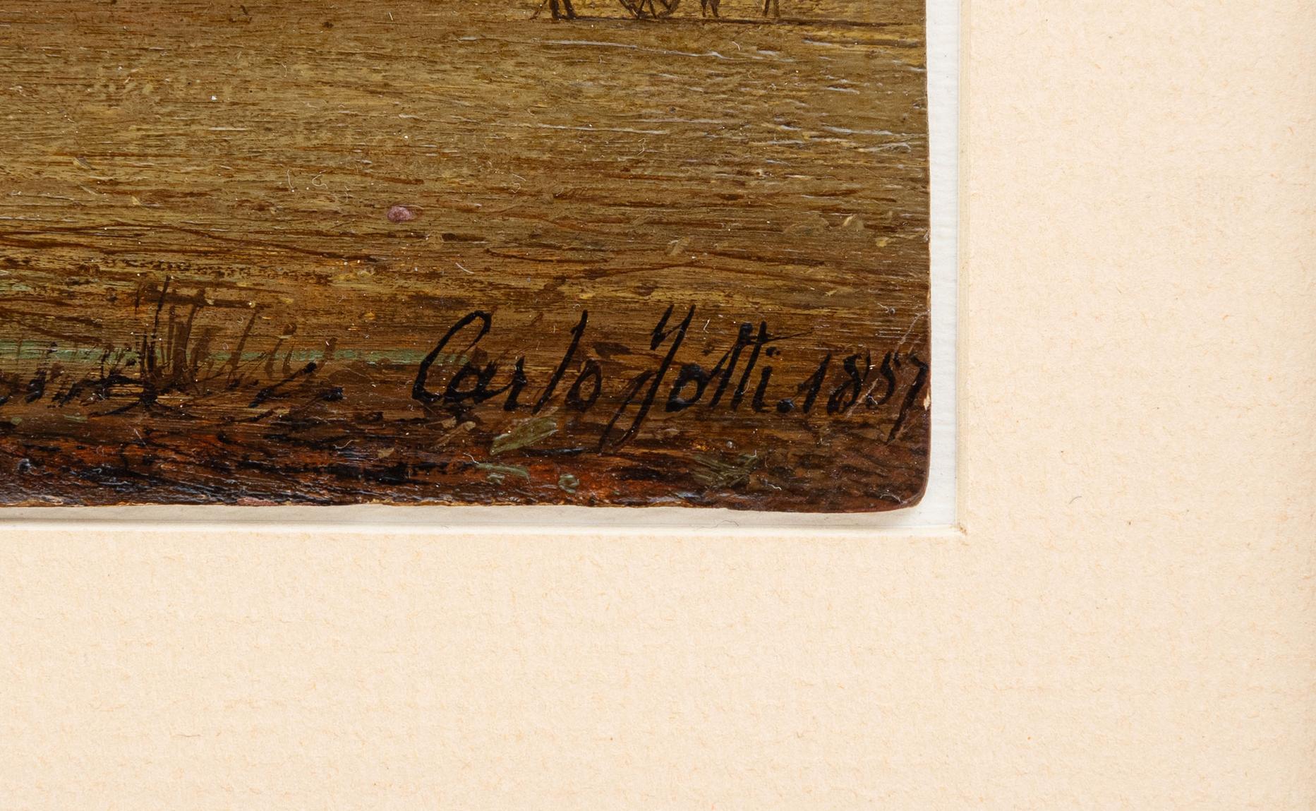 - Carlo Jotti nacque a Milano il 29 marzo 1826 e si formò artisticamente presso l'Accademia di Brera, dove ebbe come maestri Luigi Sabatelli e Giuseppe Bisi. Inizialmente orientato verso la pittura storica di stampo accademico sotto l'influenza di Sabatelli, successivamente si avvicinò al paesaggismo grazie all'insegnamento di Bisi, sviluppando una visione realistica basata sull'osservazione diretta della natura. Questo approccio lo inserì nel gruppo dei paesaggisti lombardi, noti per l'attenzione alla luce e ai colori.A partire dal 1847, Jotti partecipò assiduamente alle mostre di Milano, Torino, Genova e Venezia, esponendo opere che ritraevano scorci del Lago Maggiore, del Lago di Como, della Riviera Ligure di Ponente e di altre località italiane come il Lazio e la Campania. Tra i suoi lavori più noti si annoverano "Monte Rosa", "Madonna del Monte", "Pescarenico (Lecco)" e "Acquedotto". La sua pittura si distingue per una rappresentazione vigorosa e appassionata del vero, con una particolare sensibilità verso le atmosfere e i dettagli del paesaggio italiano.Carlo Jotti morì a Milano il 21 giugno 1905. Le sue opere sono conservate in diverse collezioni, tra cui la Galleria d'Arte Moderna di Milano, testimoniando il suo contributo significativo alla pittura paesaggistica dell'Ottocento italiano.