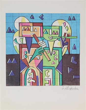 Kodra Ibrahim Suonatori riproduzione fotolitografica su carta, cm. 30x23,5, es. 1120/5000 firmata in basso a destra, eseguita per il n. 42 di BolaffiArte, timbro a secco Giulio Bolaffi Editore di Torino in basso a sinistra senza cornice