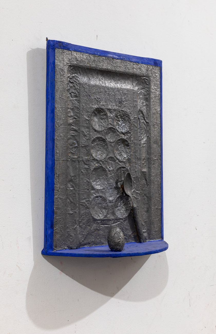 Tempera, piombo, cucchiaio e uovo di legno su legno