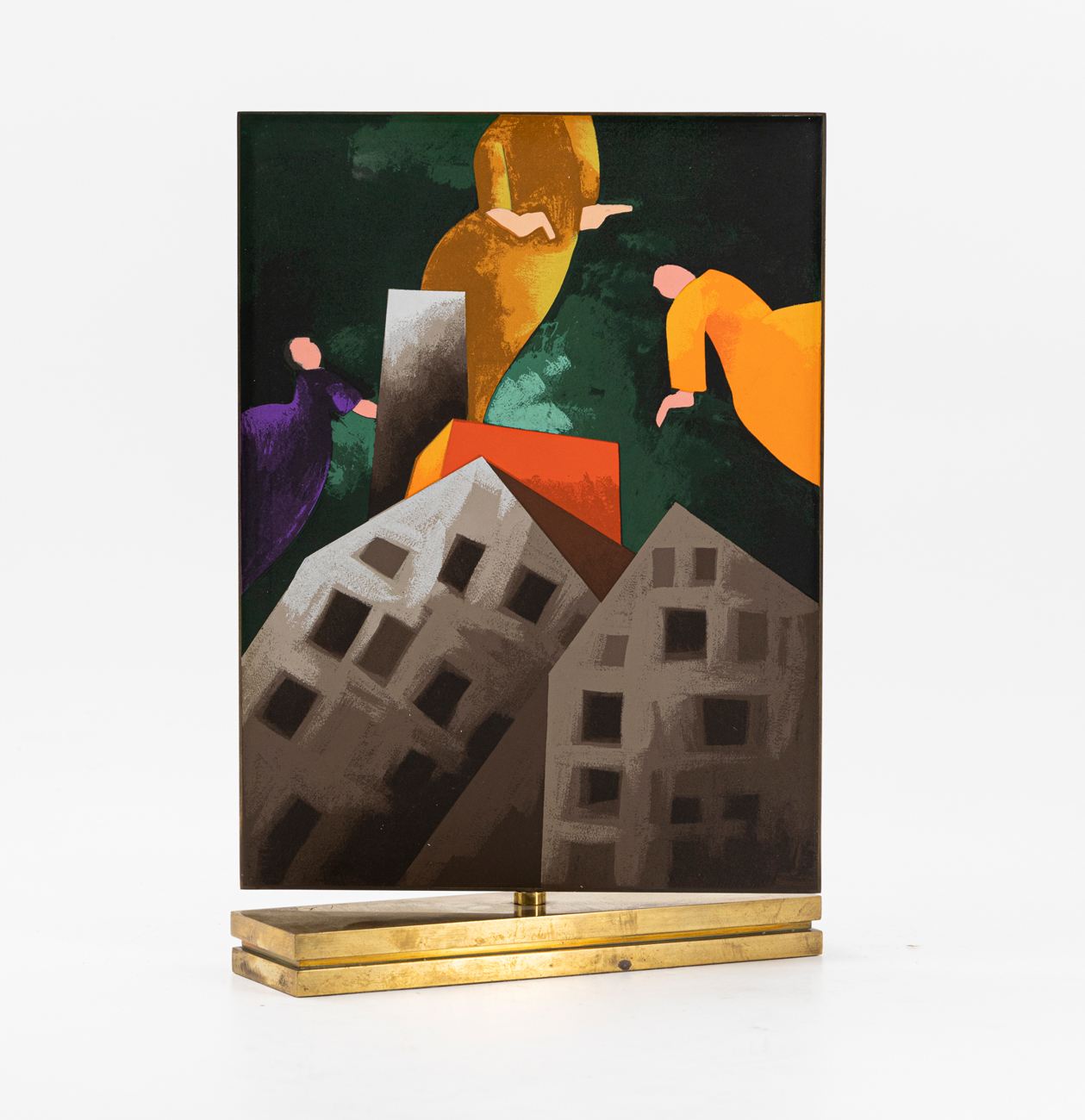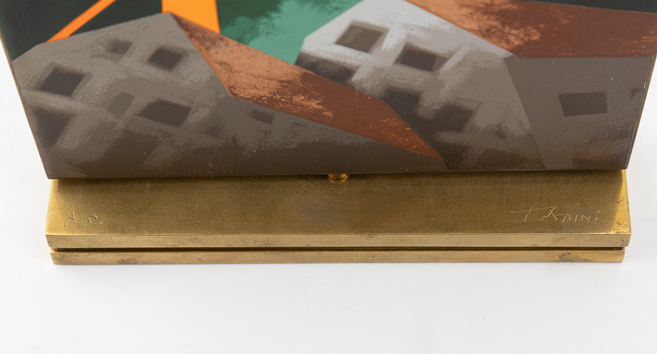 Multiplo realizzato in serigrafia a più colori su piastra di ottone (fronte e retro) poggiante su piedistallo