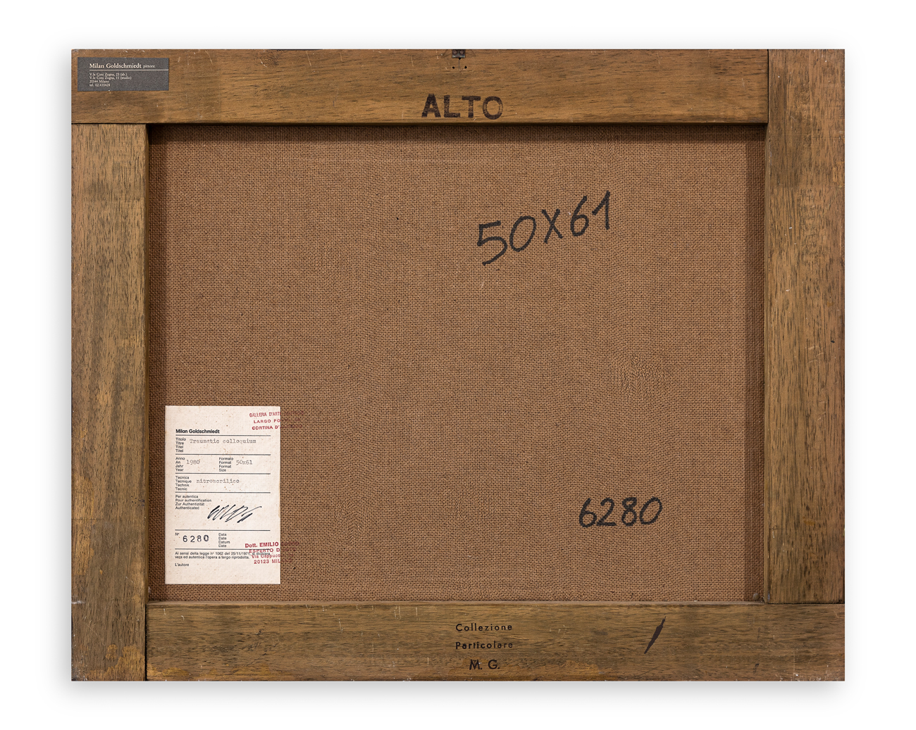 Timbro ed etichetta dell'Artista, recante firma, titolo, tecnica, misure, datazione e numero di repertorio, al retro