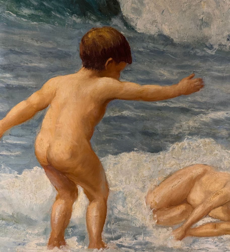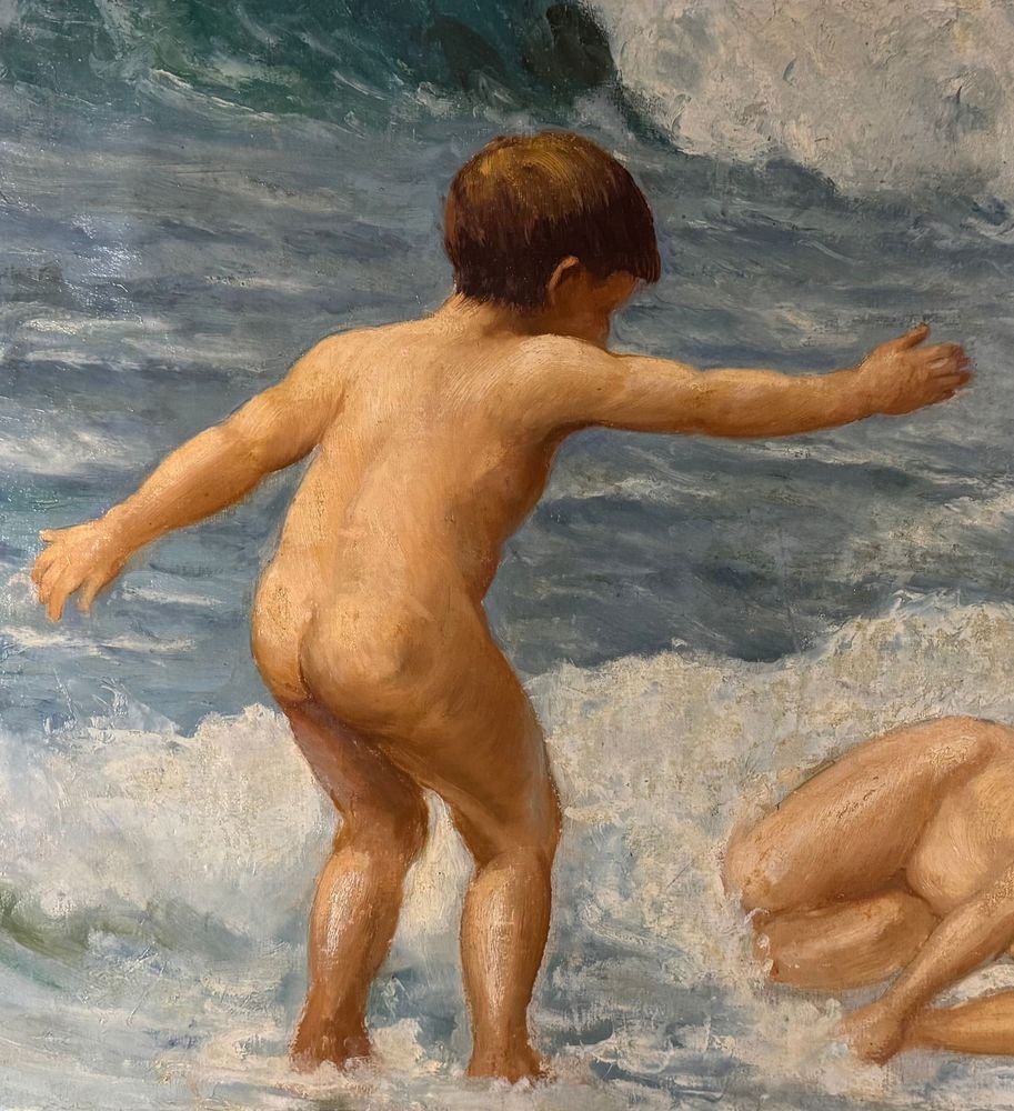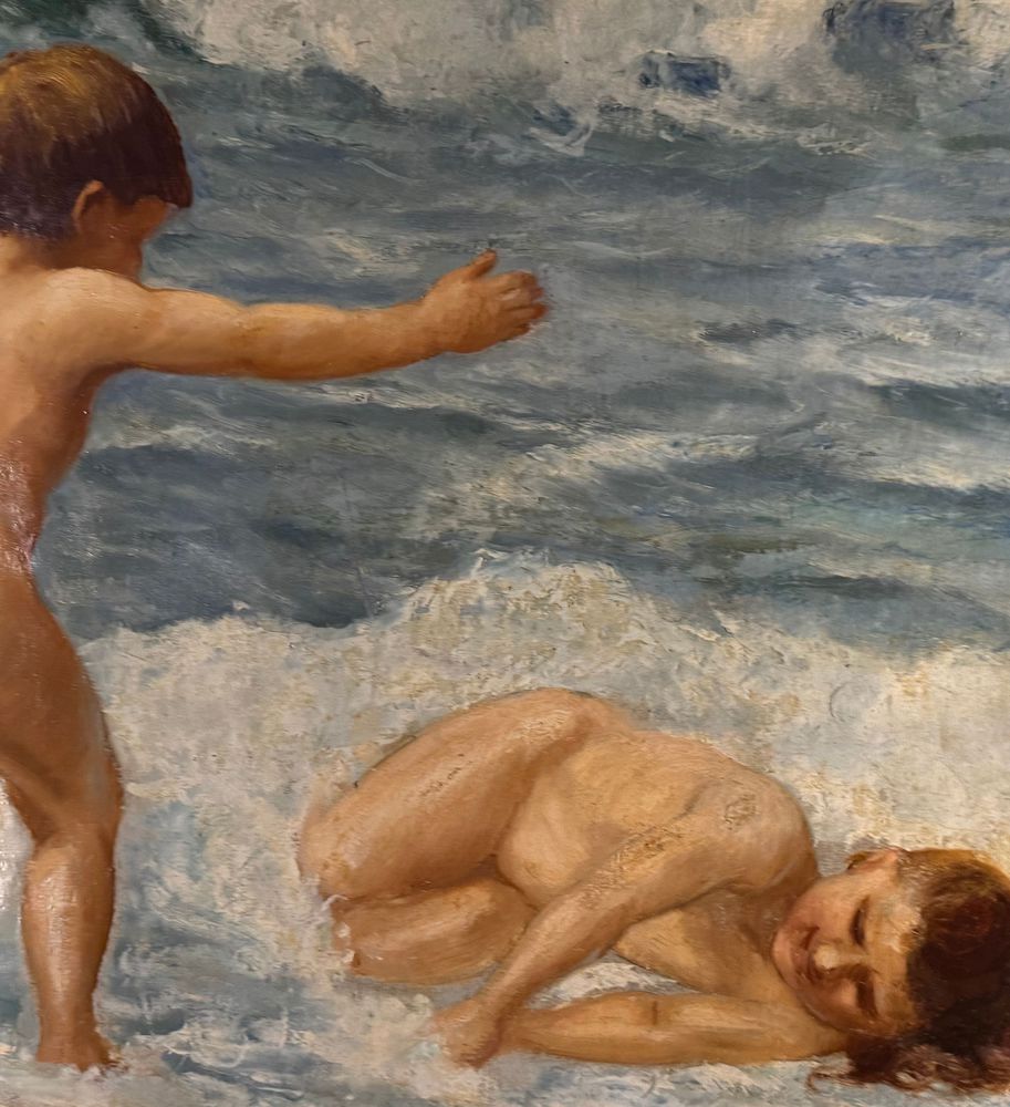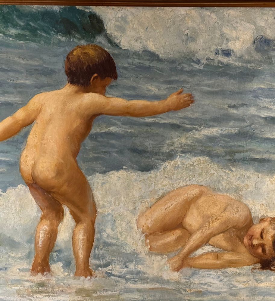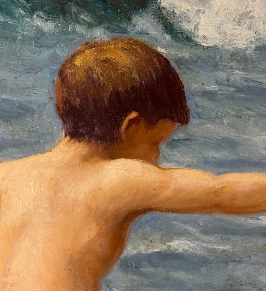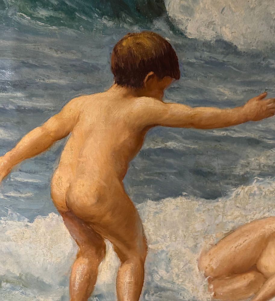 Dipinto olio su tela, periodo inizio del XX secolo, scuola Italiana, raffigurante Giochi di bambini sul mare. Dimensioni compreso cornice: 132x98 cm. Dimensioni interno cornice: 119x85 cm. Firmato in basso a destra A.Rollo. Opera in buone condizioni e di eccellente qualità artistica.