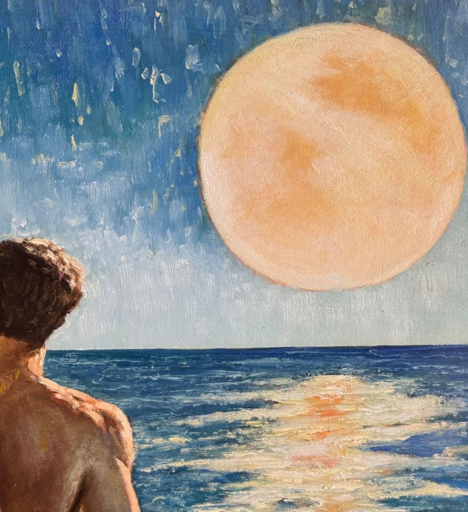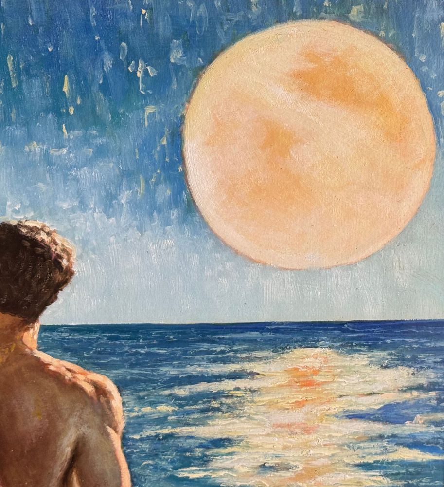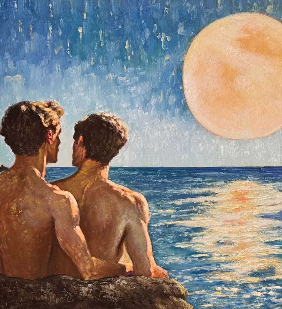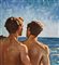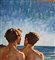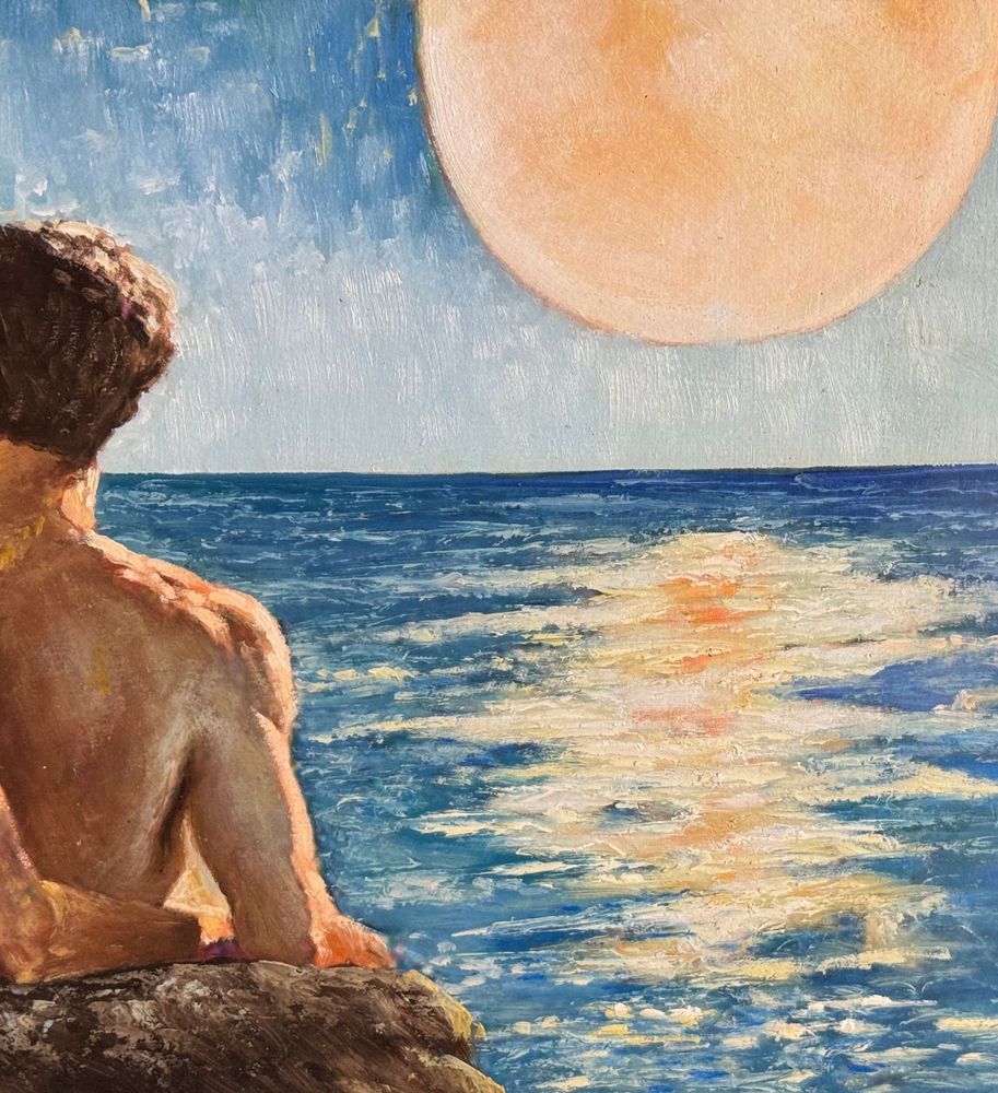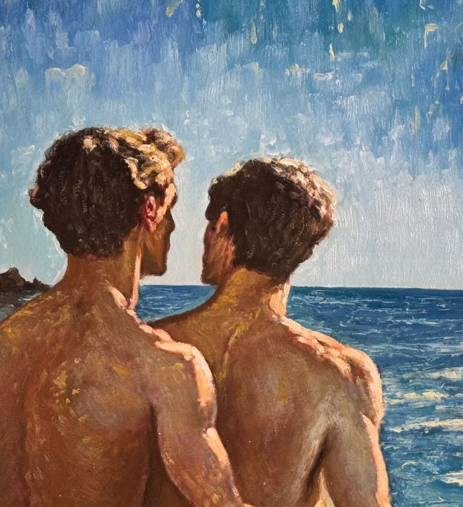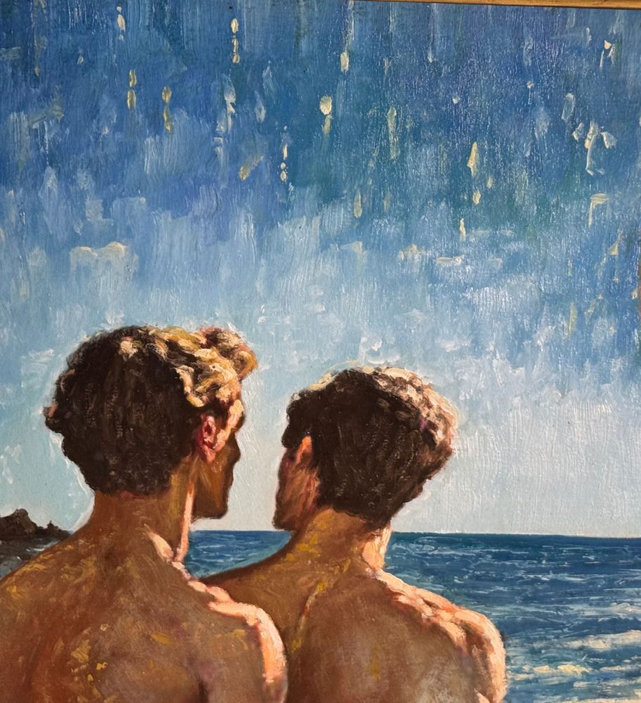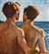 Dipinto olio su pannello, periodo XX secolo, scuola Italiana raffigurante Due figure maschili a torso nudo su marina all'alba. Dimensioni compreso cornice: 57x54 cm. Dimensioni interno cornice: 37x34 cm. Da artista anoanimo. Opera in buone condizioni.