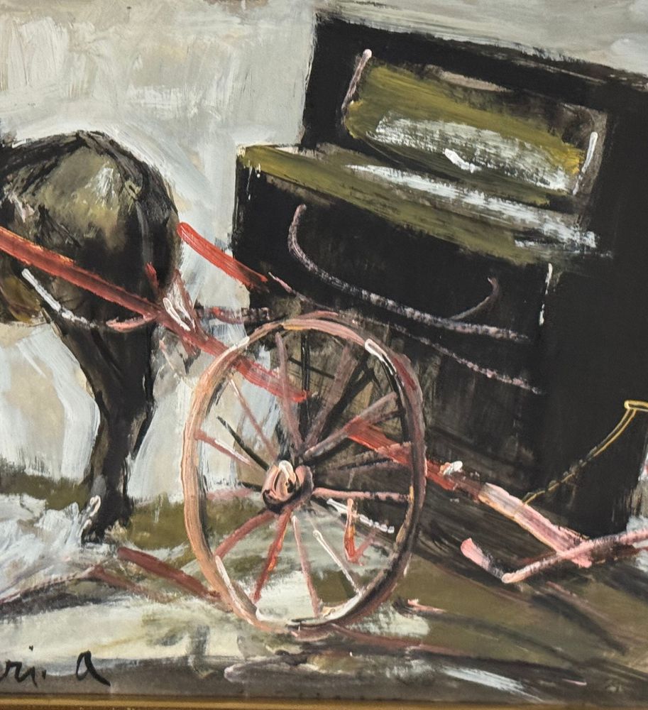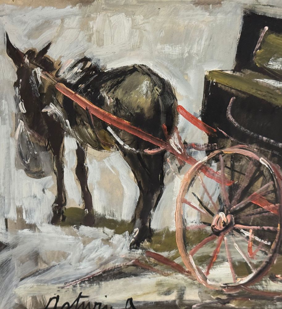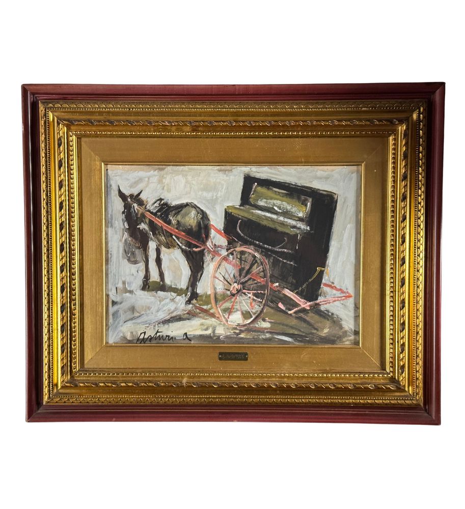 Dipinto olio su pannello, periodo XX secolo, scuola Italiana, raffigurante Carrozzella con pianino. Dimensioni compreso cornice: 57x46 cm. Dimensioni interno cornice: 35x25 cm. Firmato in basso a sinistra Antonio Asturi. Opera in buone condizioni.