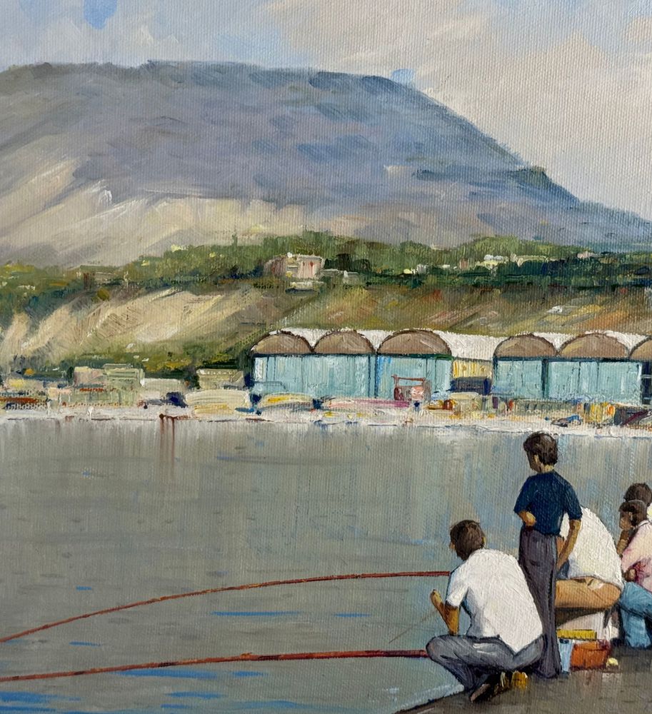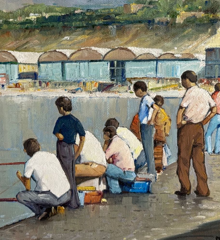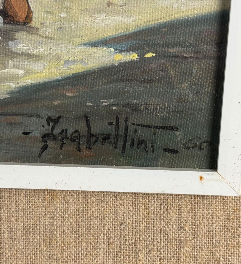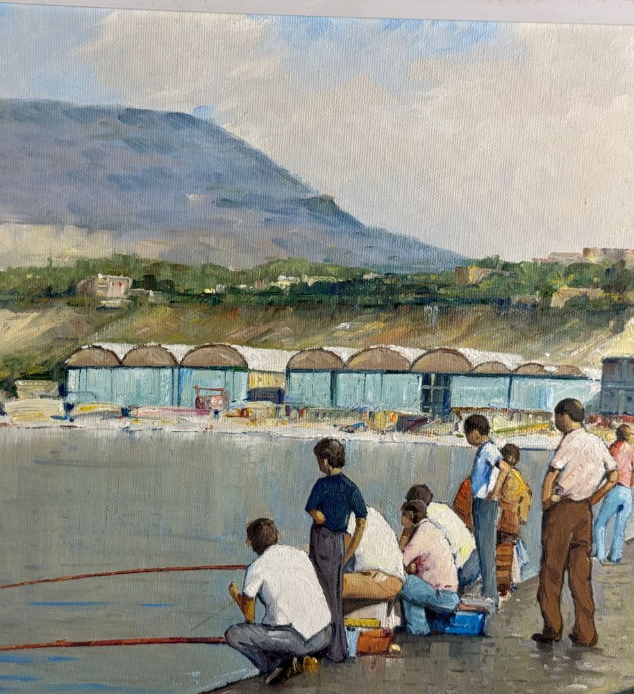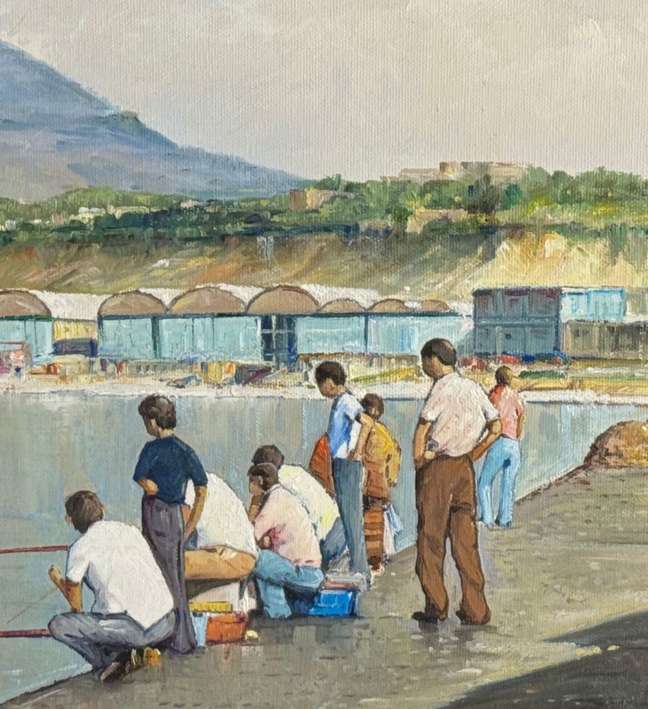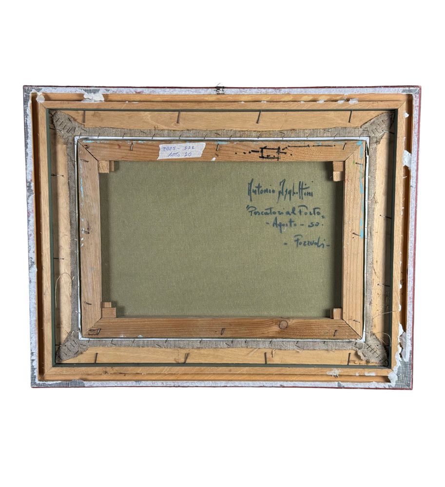 Dipinto olio su tela, periodo XX secolo, scuola Italiana, raffigurante Pescatori al porto. Dimensioni compreso cornice: 68x53 cm. Dimensioni interno cornice: 35x50 cm. Firmato a destra e autentica sul retro da artista non identificato. Opera in buone condizioni.