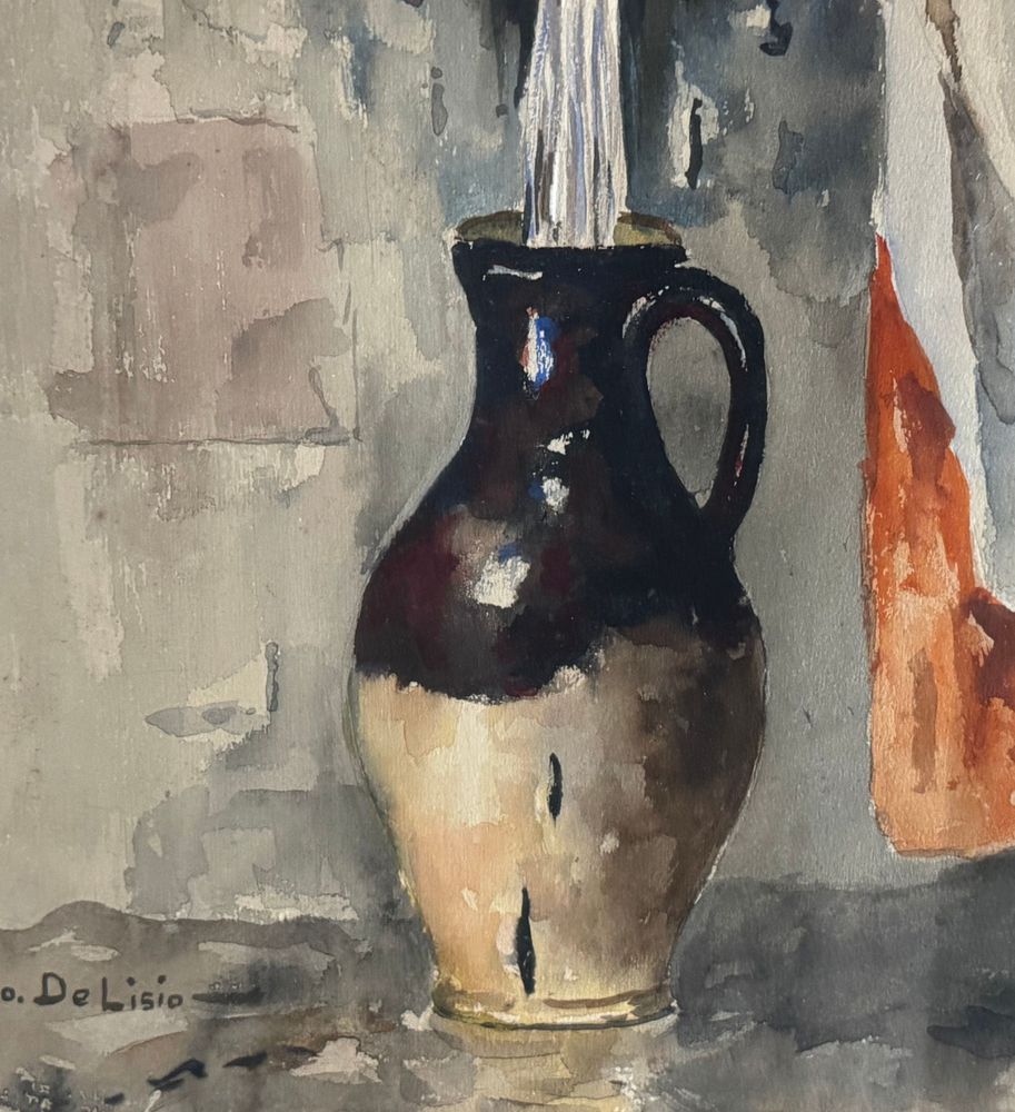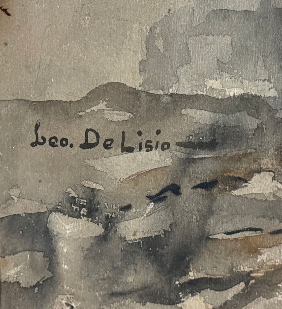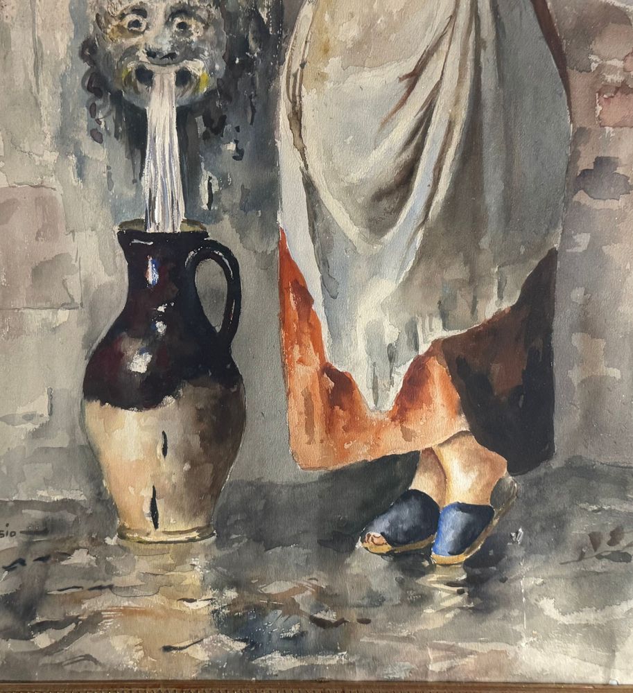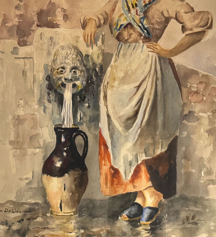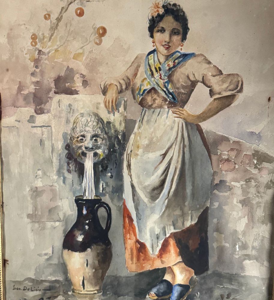Acquerello su carta, periodo XX secolo scuola italiana raffigurante Giovane donna alla fontana. Dimensioni compreso cornice: 64x83 cm. Dimensioni interno cornice: 45x65 cm. Firmato in basso a sinistra Leonardo De Lisio. Opera in buone condizioni con lievi segni di vissuto come da foto allegate. Cornice da restaurare.