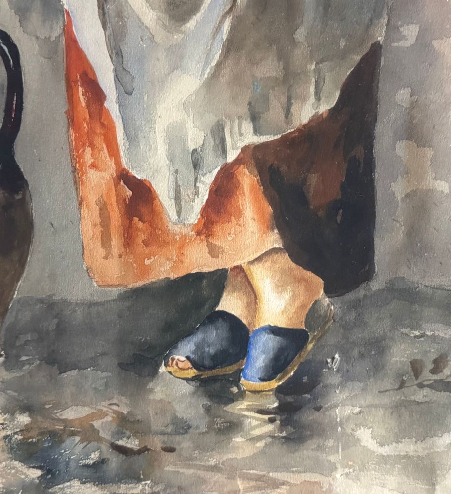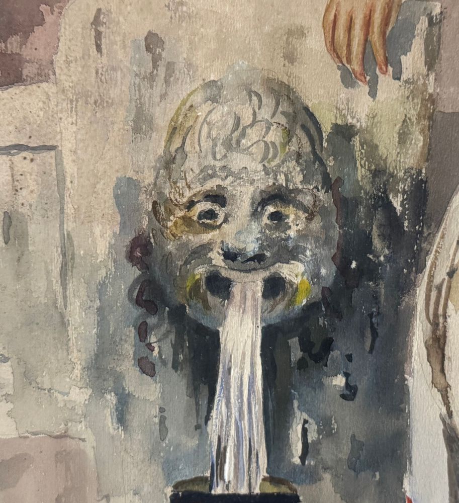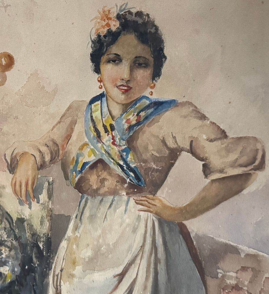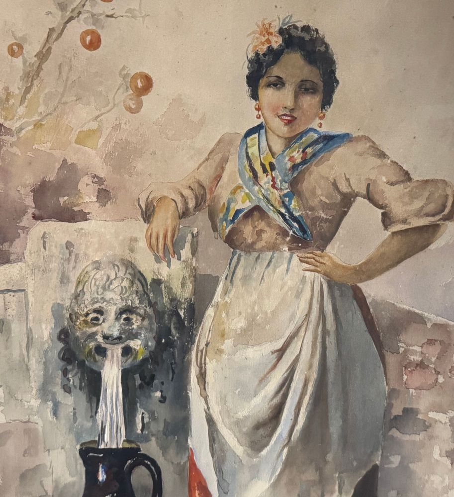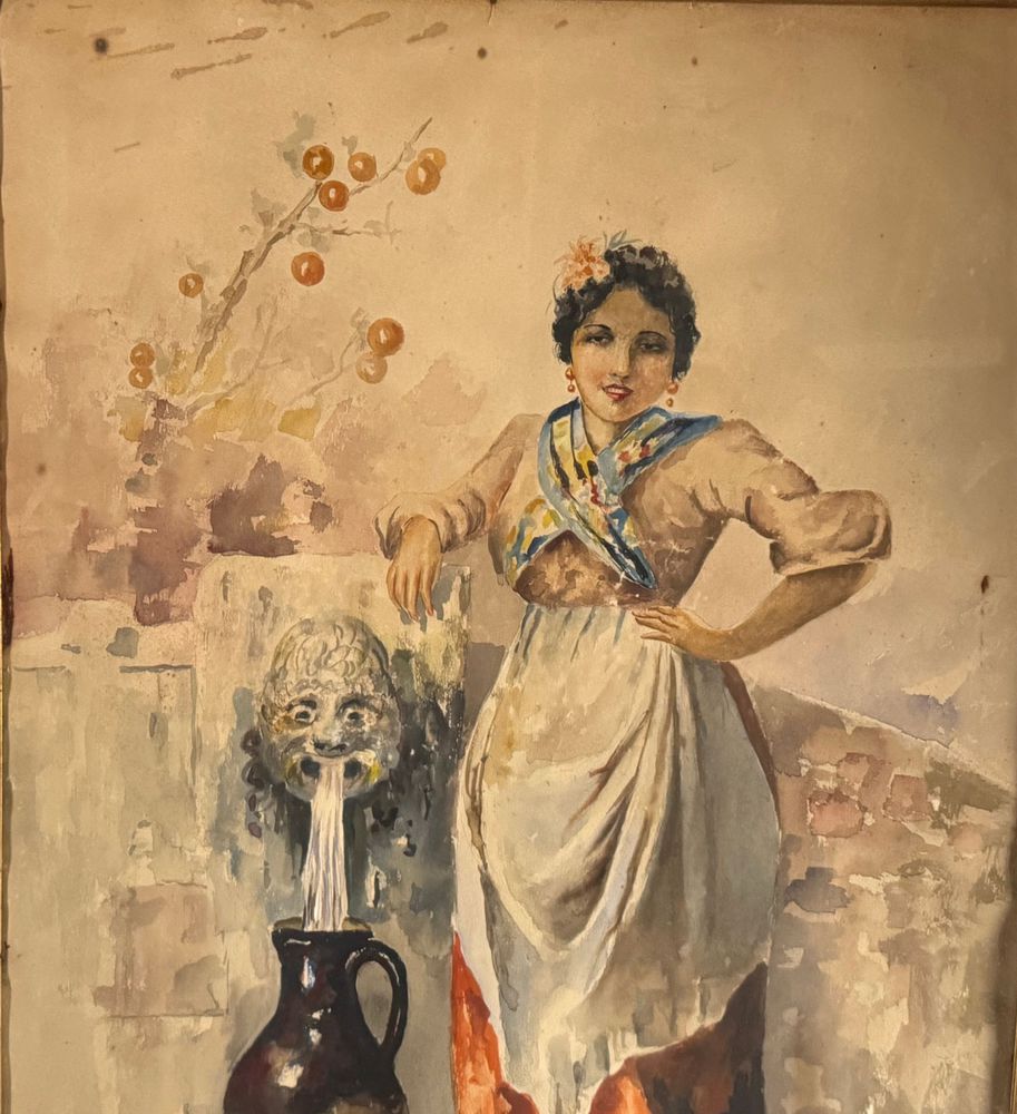 Acquerello su carta, periodo XX secolo scuola italiana raffigurante Giovane donna alla fontana. Dimensioni compreso cornice: 64x83 cm. Dimensioni interno cornice: 45x65 cm. Firmato in basso a sinistra Leonardo De Lisio. Opera in buone condizioni con lievi segni di vissuto come da foto allegate. Cornice da restaurare.