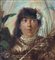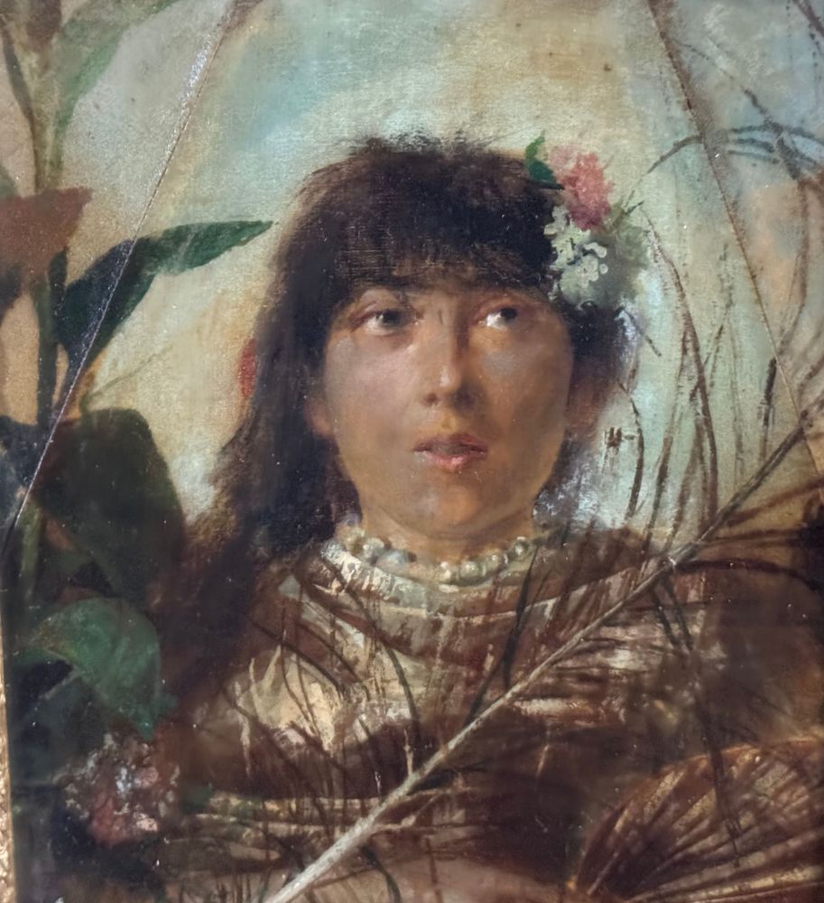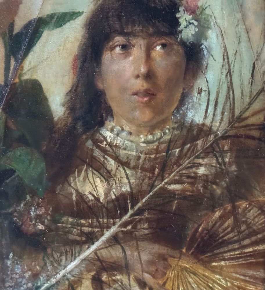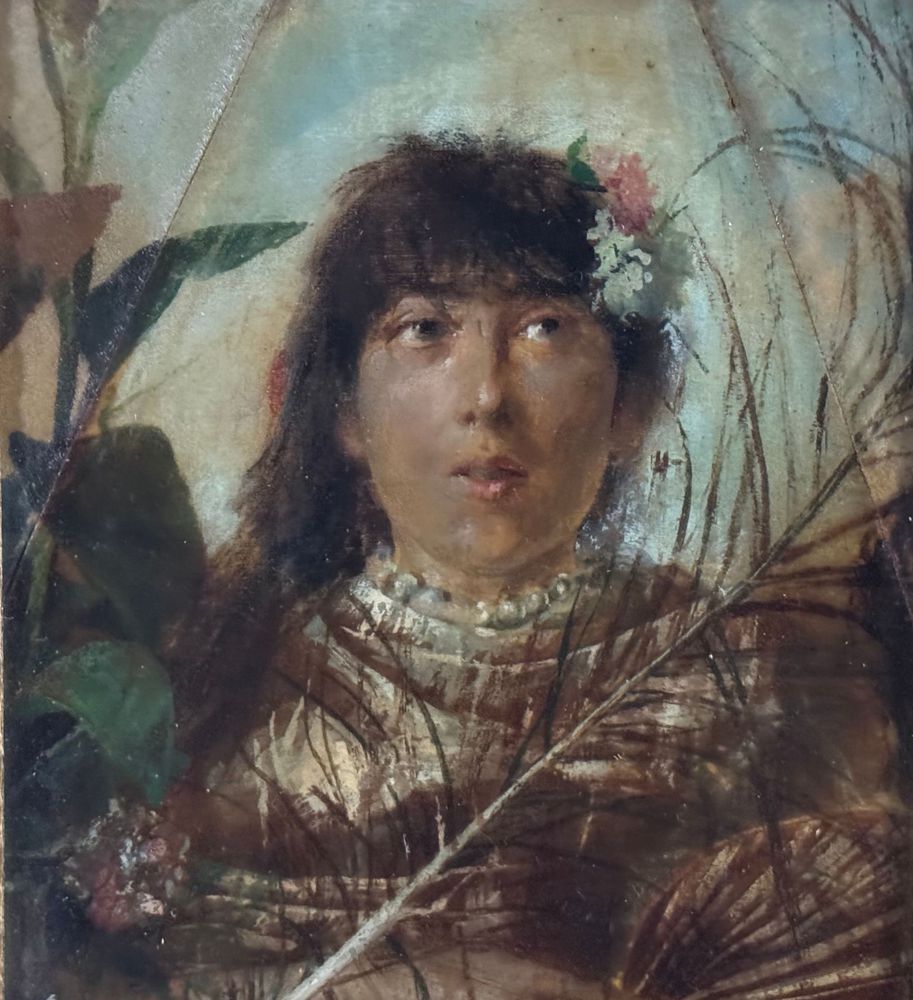 Dipinto olio su tela, applicata su pannello, periodo XIX secolo, scuola Italiana, raffigurante Donna con palma. Dimensioni compreso cornice: 48x53 cm. Dimensioni interno cornice: 21,5x28 cm. Firmato in basso a destra E. Cercone 1898. Opera in discrete condizioni, da segnalare due tagli alla tela nella parte alta, sinistra e destra.