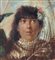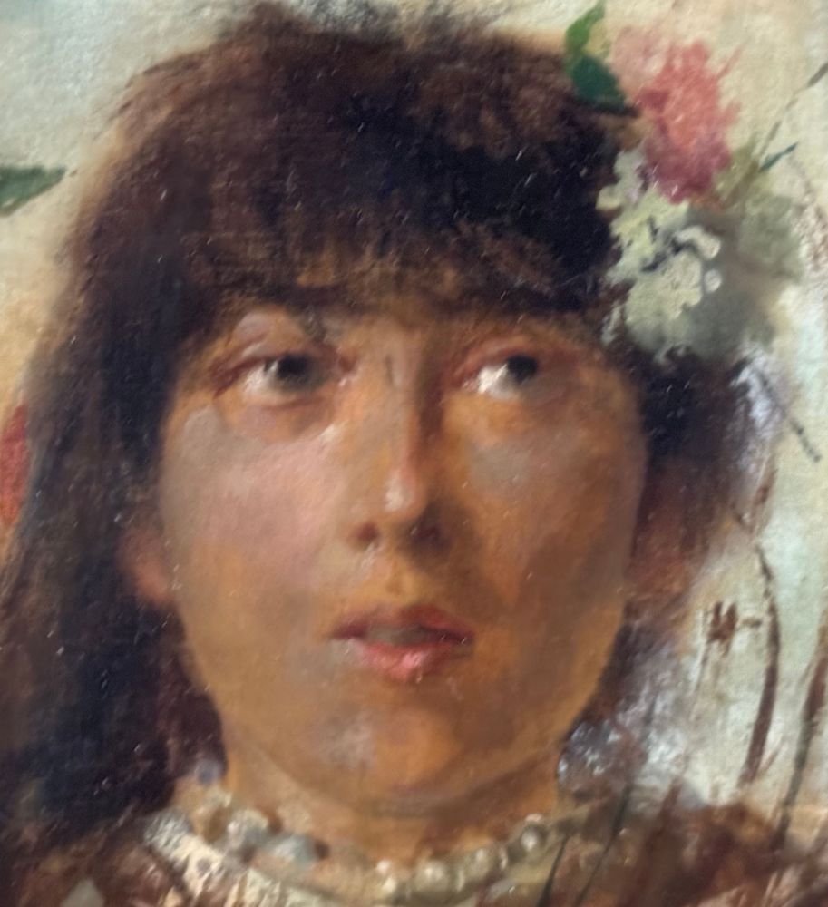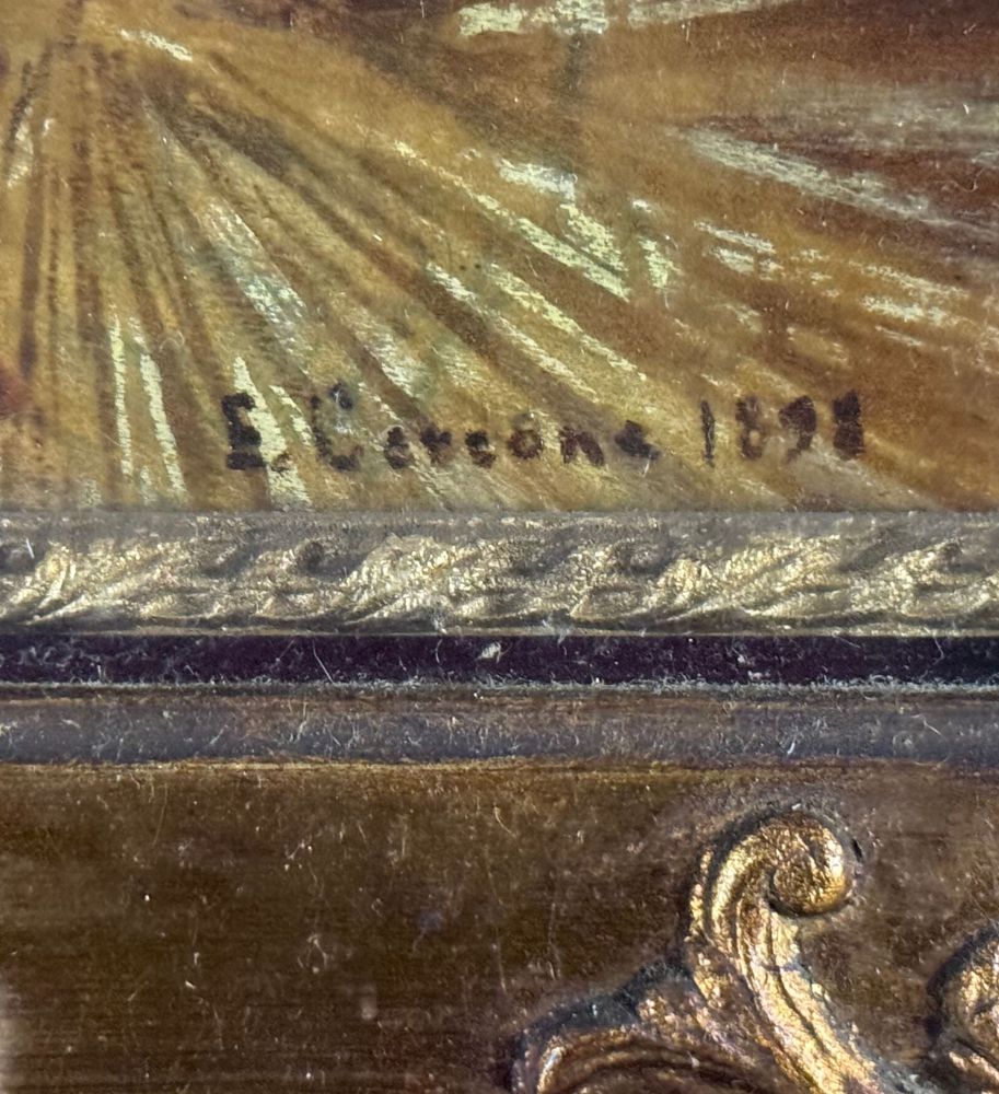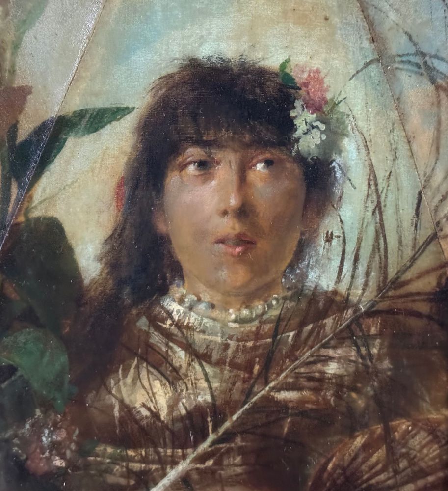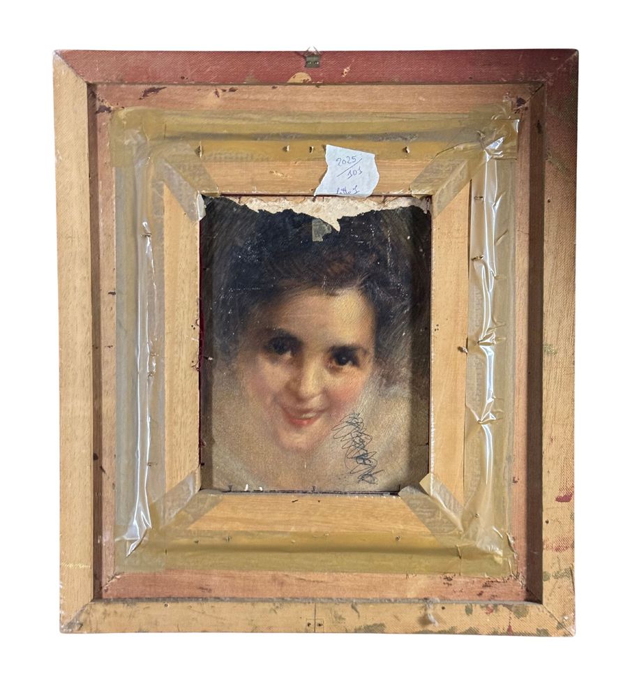 Dipinto olio su tela, applicata su pannello, periodo XIX secolo, scuola Italiana, raffigurante Donna con palma. Dimensioni compreso cornice: 48x53 cm. Dimensioni interno cornice: 21,5x28 cm. Firmato in basso a destra E. Cercone 1898. Opera in discrete condizioni, da segnalare due tagli alla tela nella parte alta, sinistra e destra.