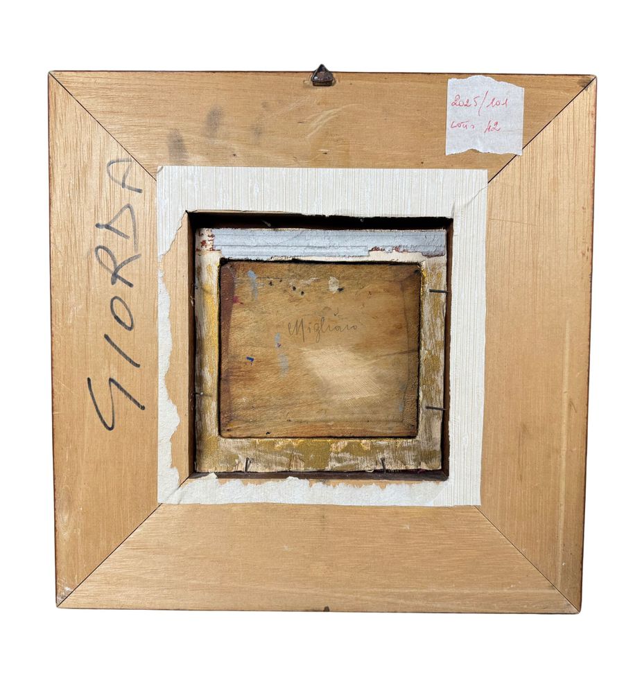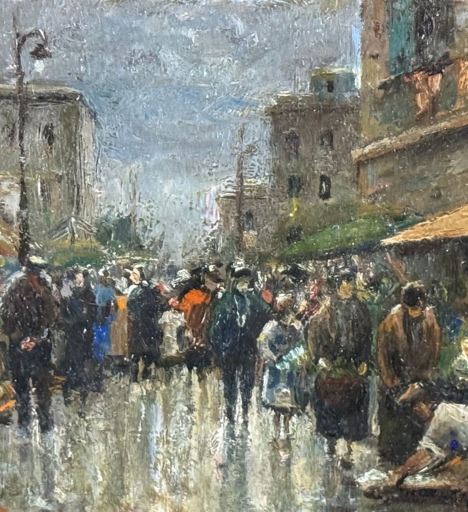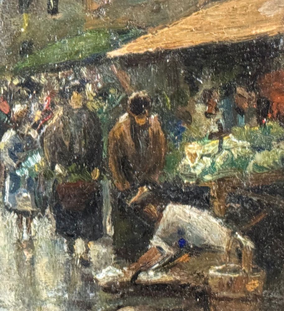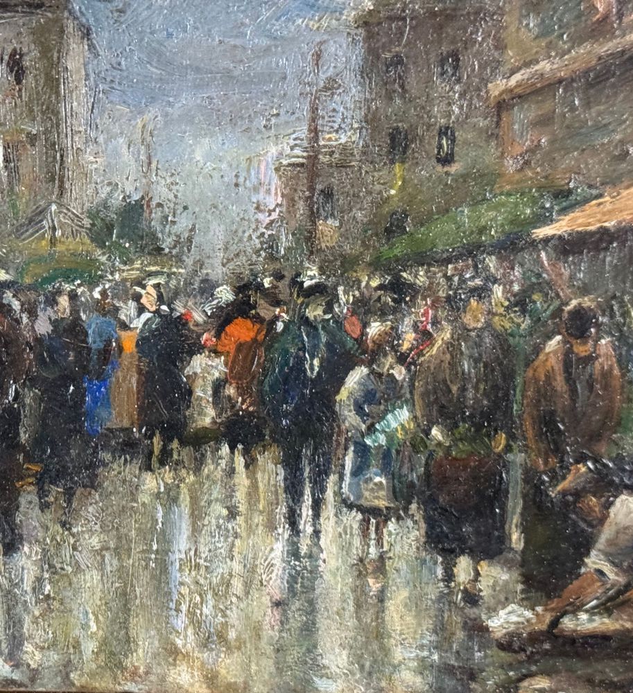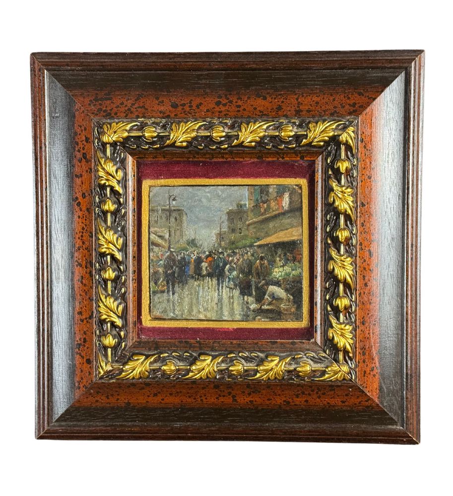 Dipinto olio su tavola, periodo XX secolo, scuola Italiana, raffigurante Scena di mercatino con personaggi. Dimensioni compreso cornice: 35x35 cm. Dimensioni interno cornice: 14x12 cm. Traccia di firma in basso a sinistra Vincenzo Migliaro. Opera in buone condizioni.