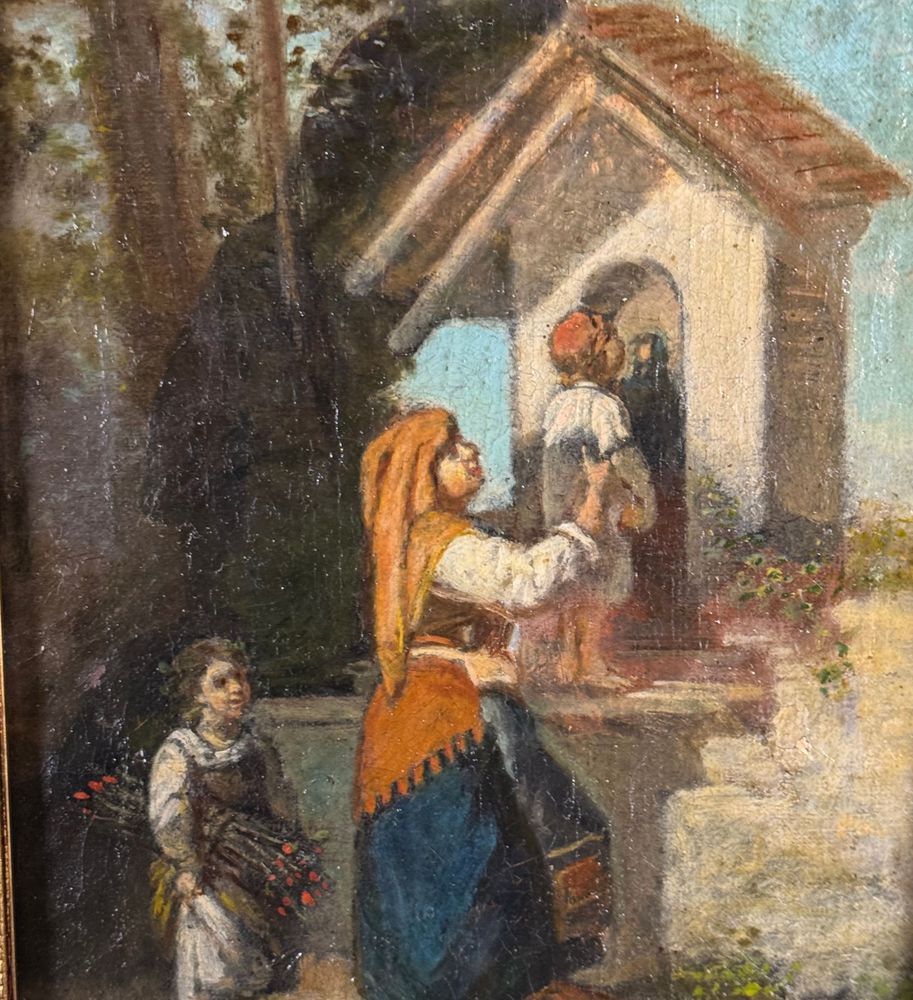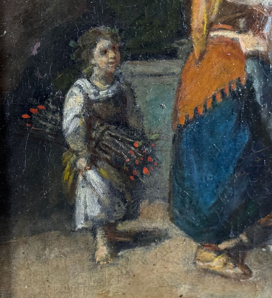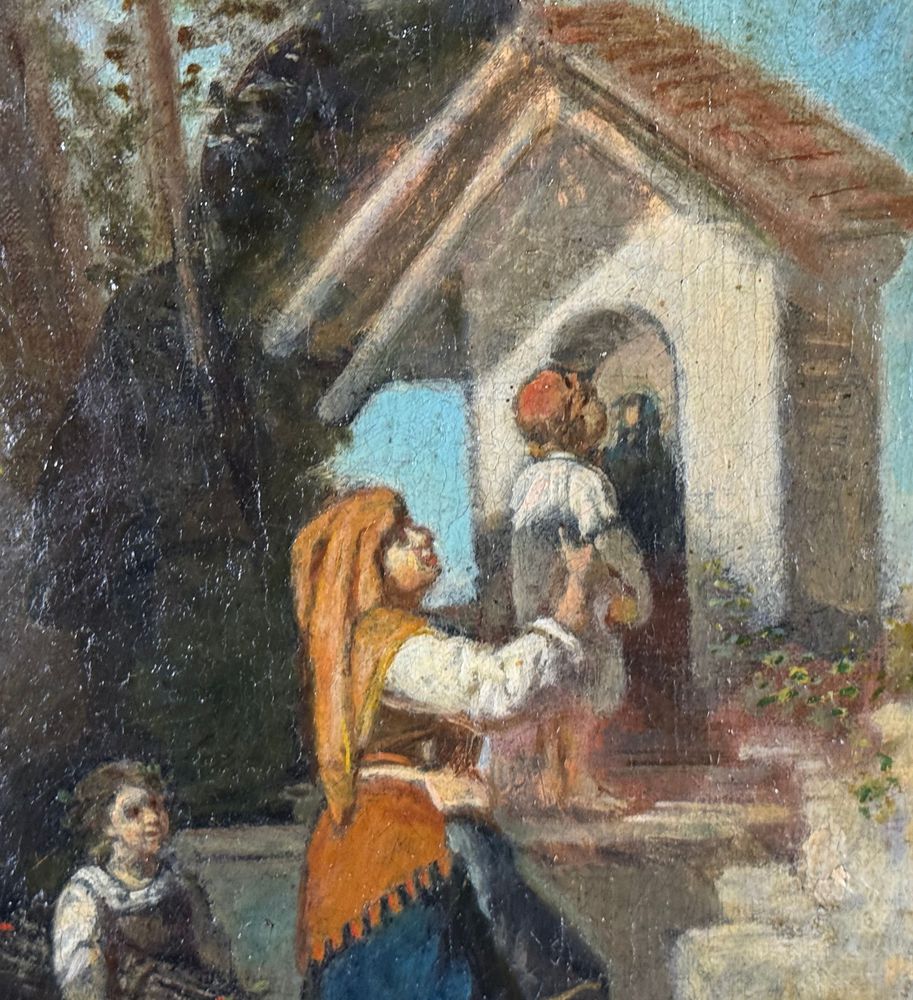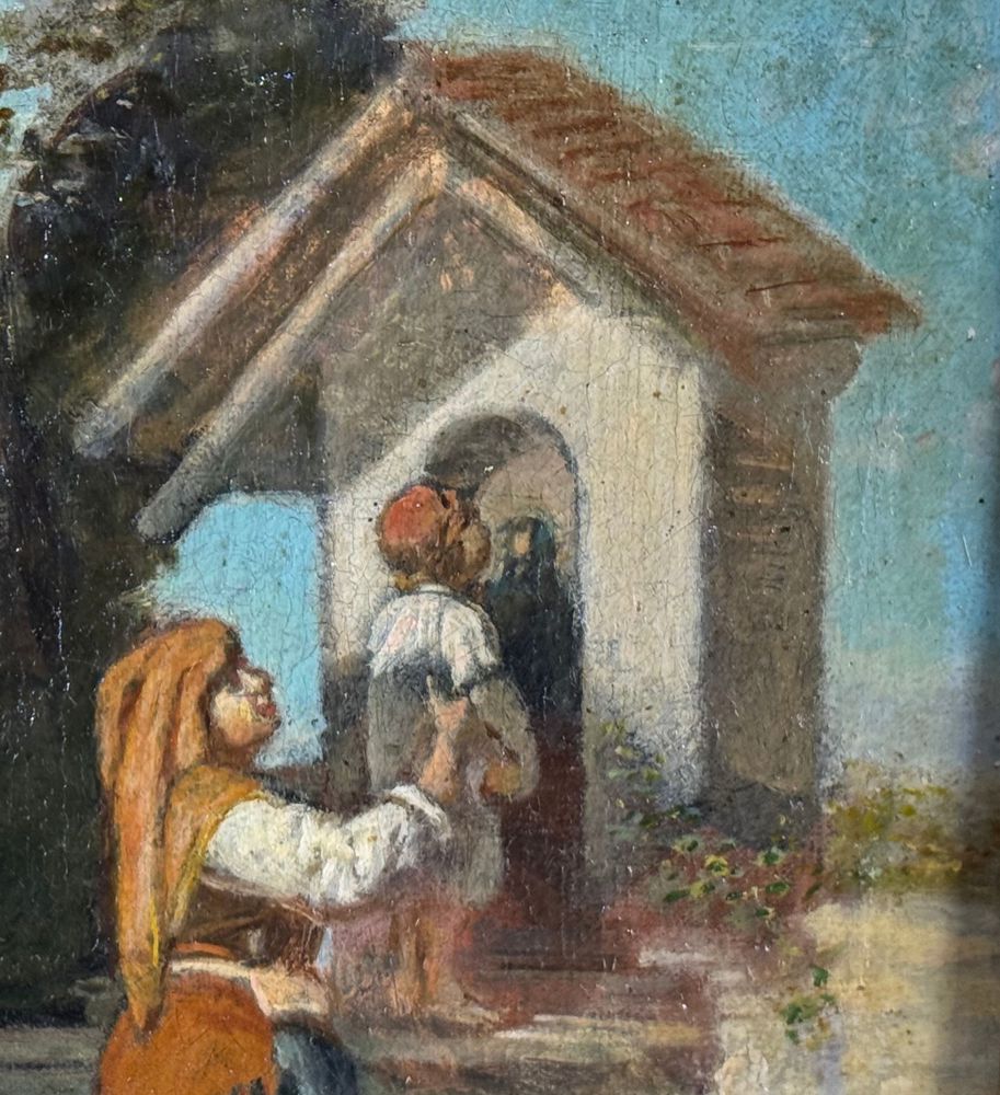 Dipinto olio su tela, periodo XIX/XX secolo, scuola Italiana, raffigurante Personaggi in visita alla cappella. Dimensioni compreso cornice: 39x51 cm. Dimensioni interno cornice: 23x36 cm. Firmato in basso a sinistra Simonetti ( 1843). Opera in buone condizioni e di ottima qualità artistica. Con lievi segni di vissuto come da foto allegate.