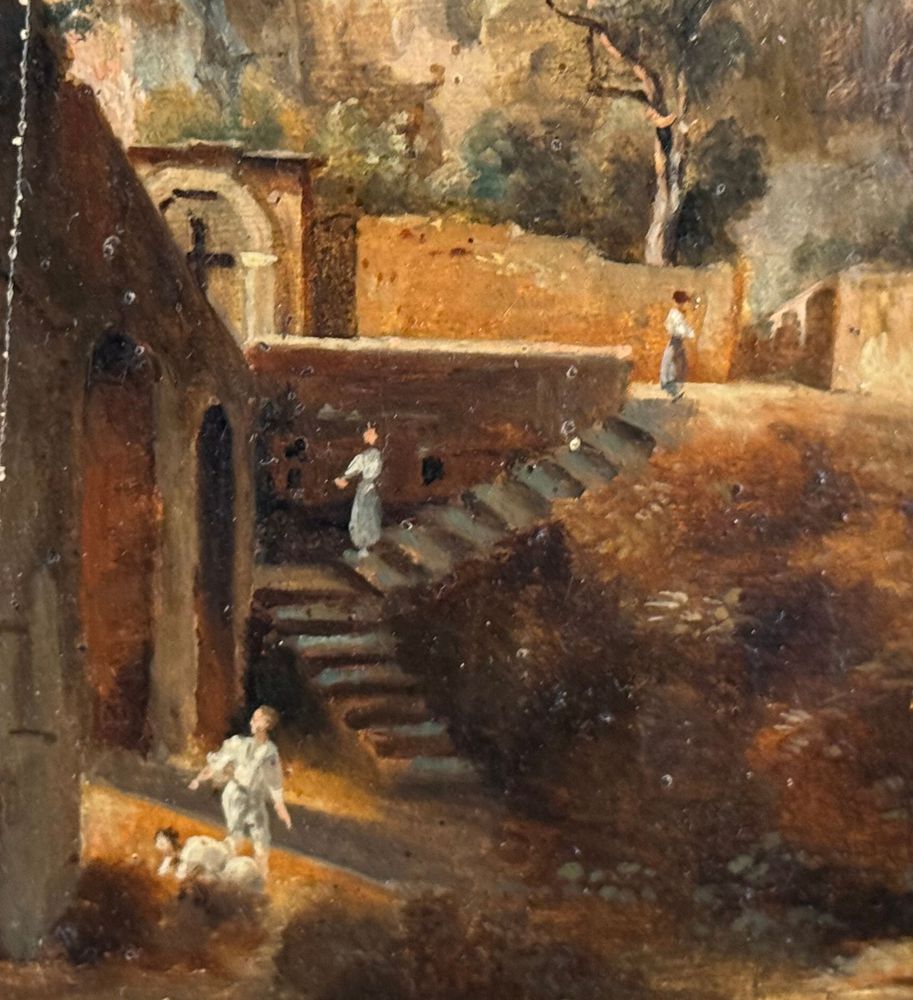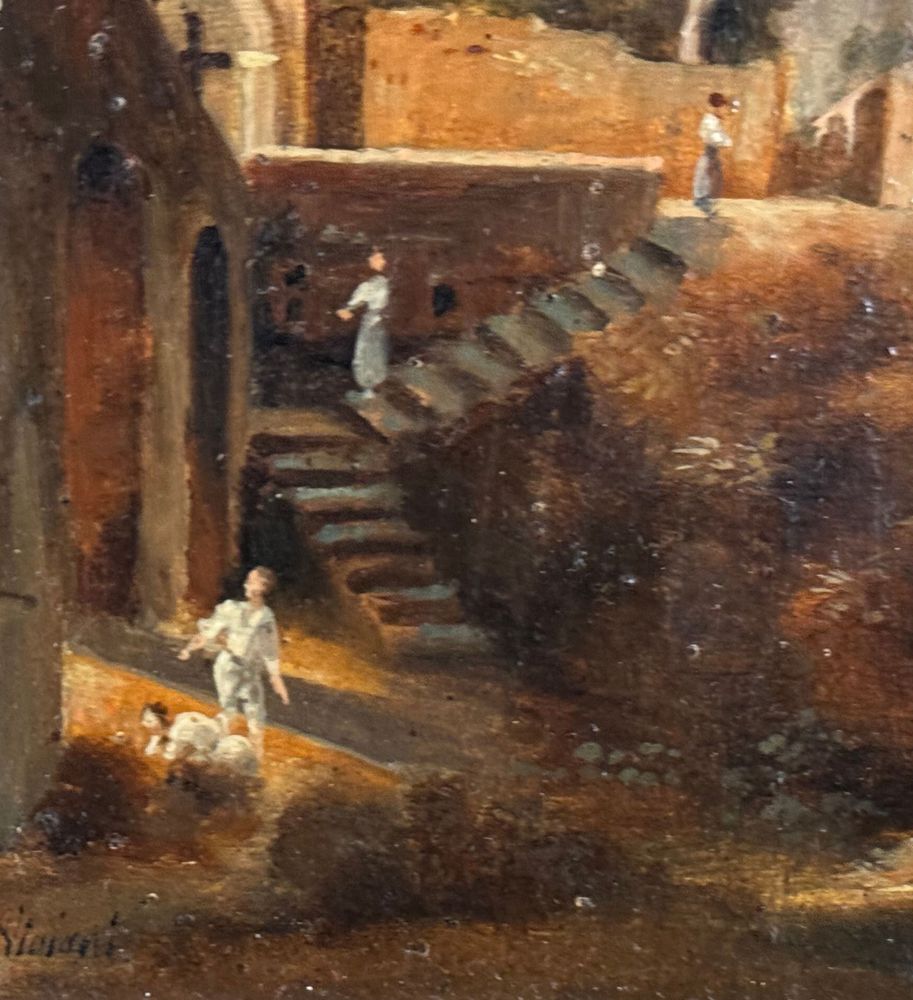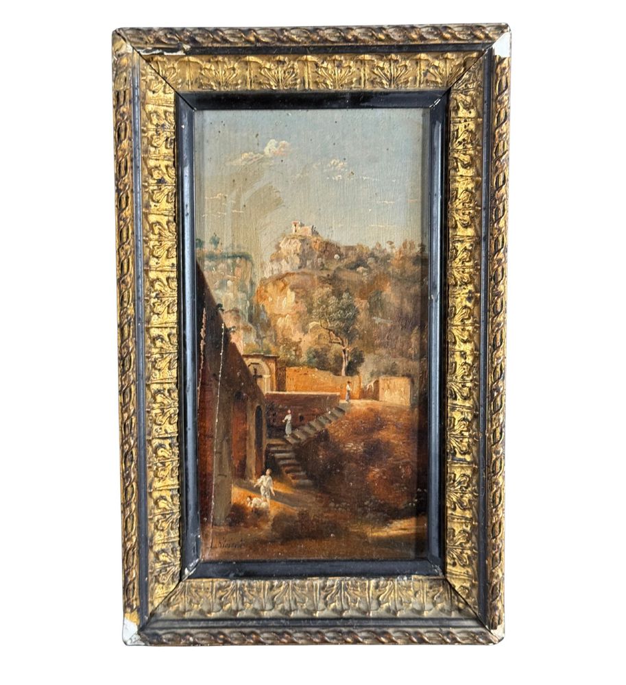 Dipinto olio su tavola, periodo XIX/XX secolo, scuola Italiana raffigurante Paesaggio con personaggi. Dimensioni compreso cornice: 15x24 cm. Dimensioni interno cornice: 19x10 cm. Firmato in basso a sinistra Viviani. Segni di vissuto come da foto allegate.