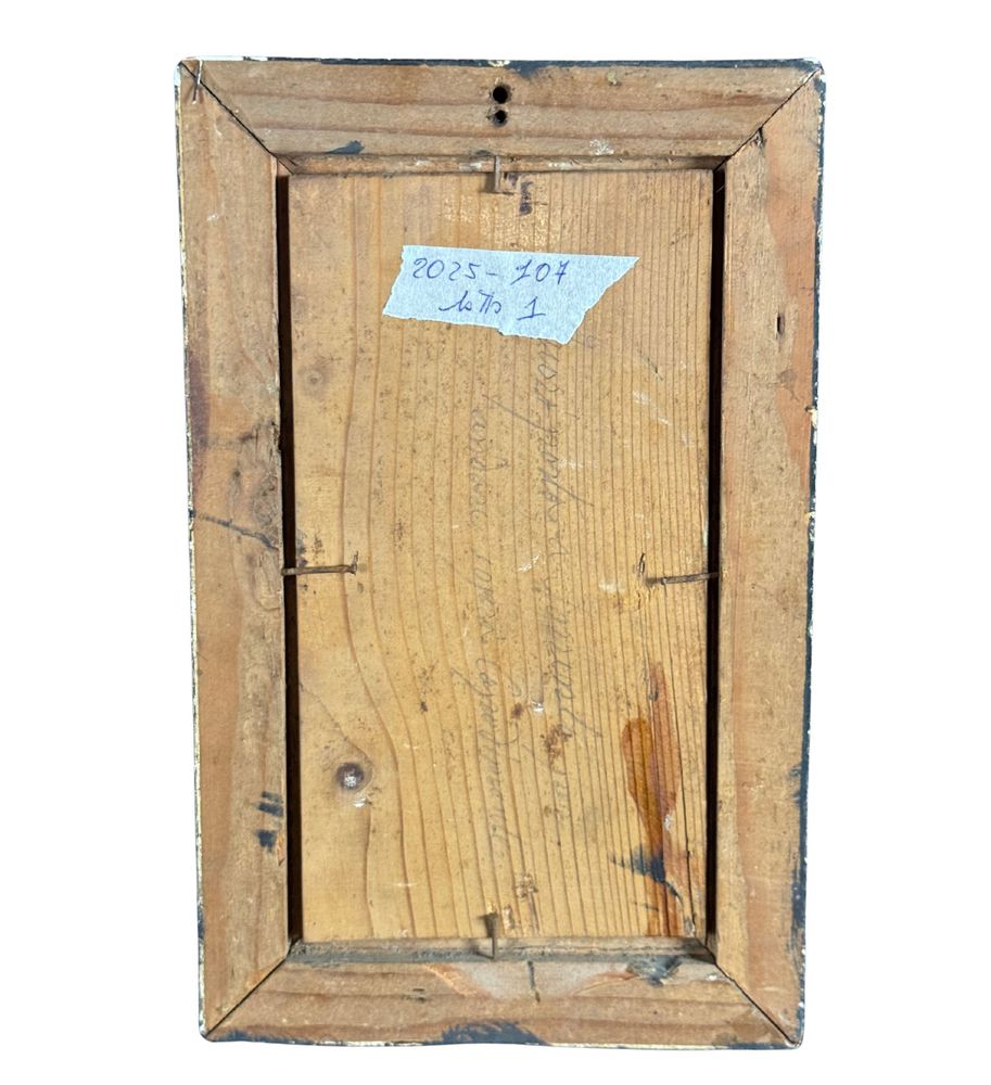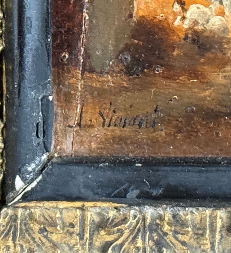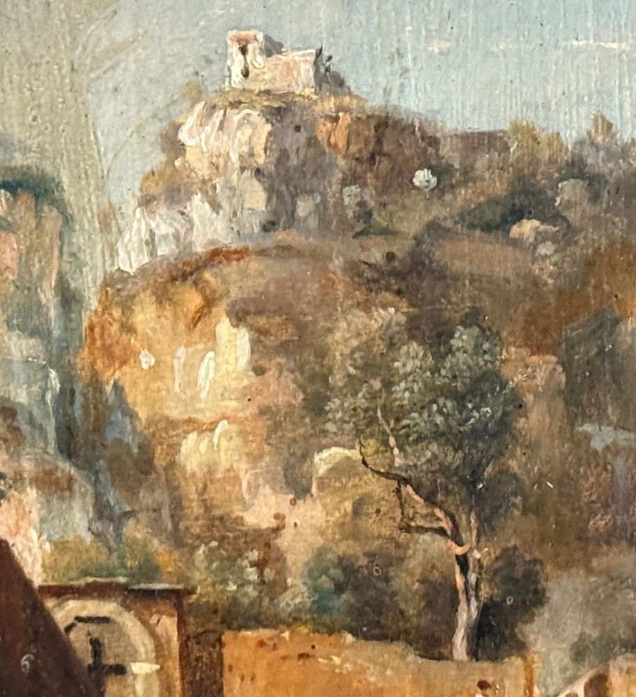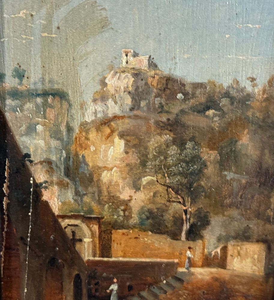 Dipinto olio su tavola, periodo XIX/XX secolo, scuola Italiana raffigurante Paesaggio con personaggi. Dimensioni compreso cornice: 15x24 cm. Dimensioni interno cornice: 19x10 cm. Firmato in basso a sinistra Viviani. Segni di vissuto come da foto allegate.