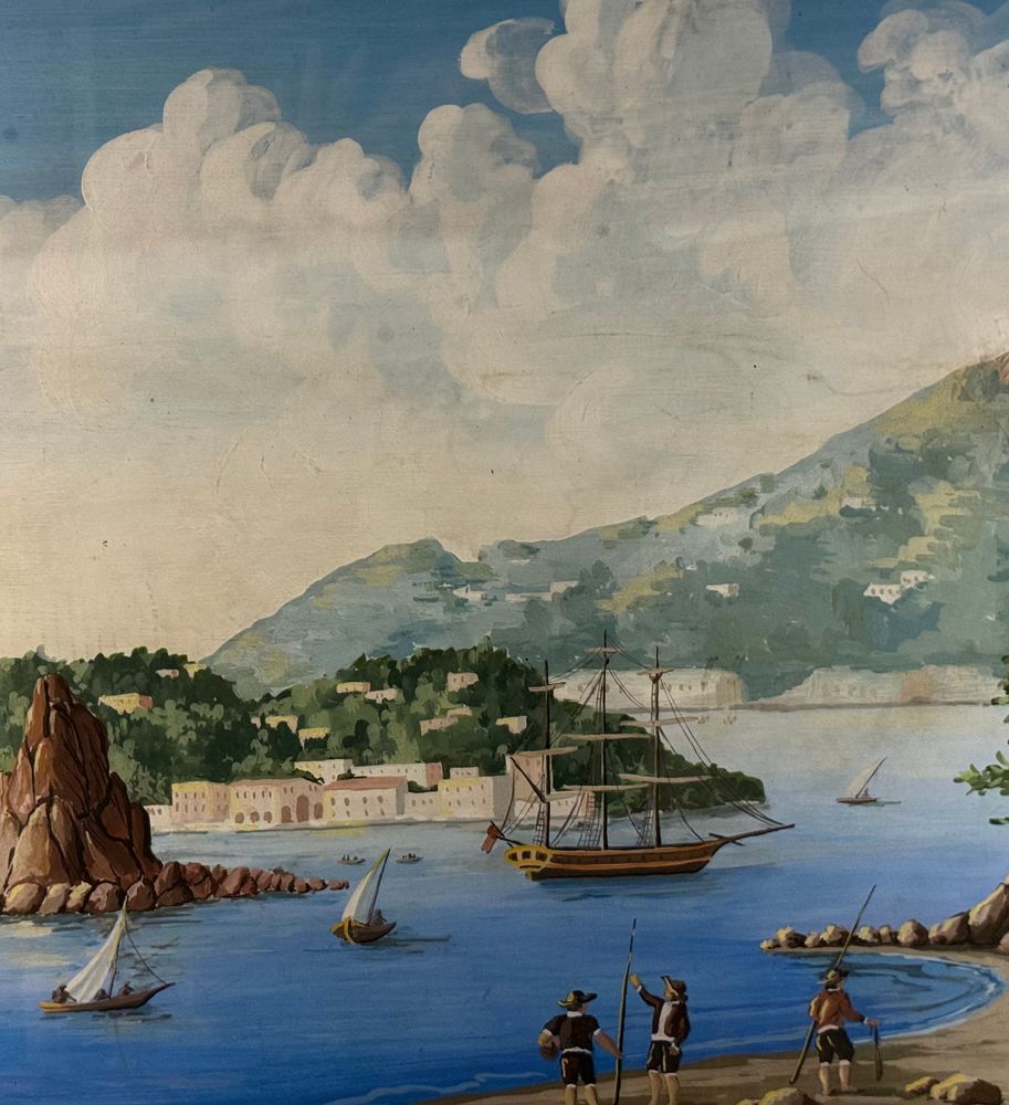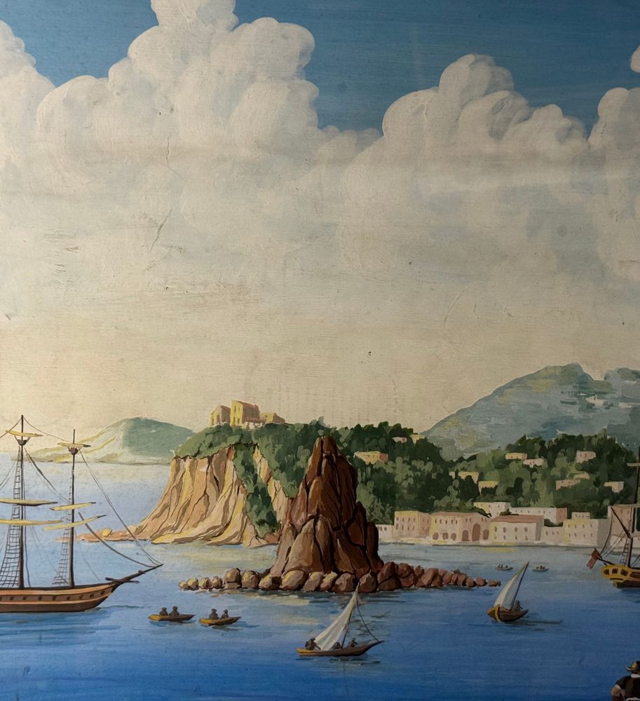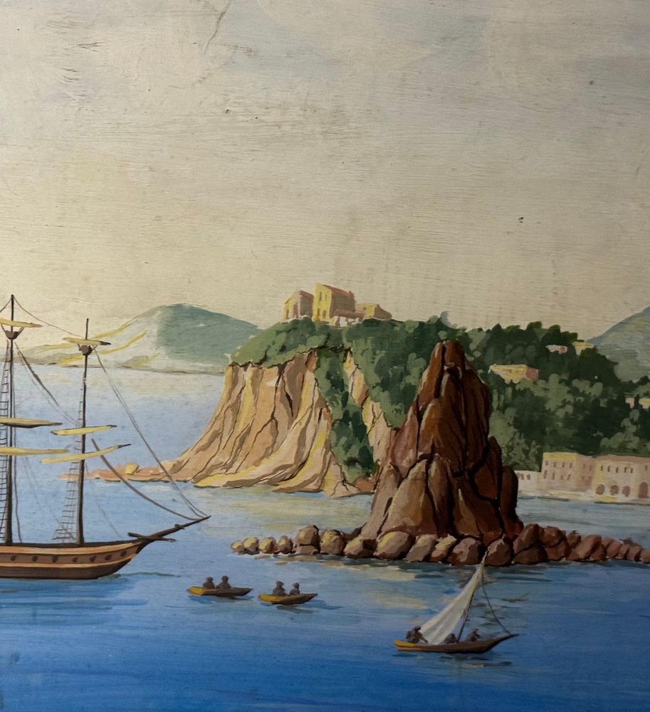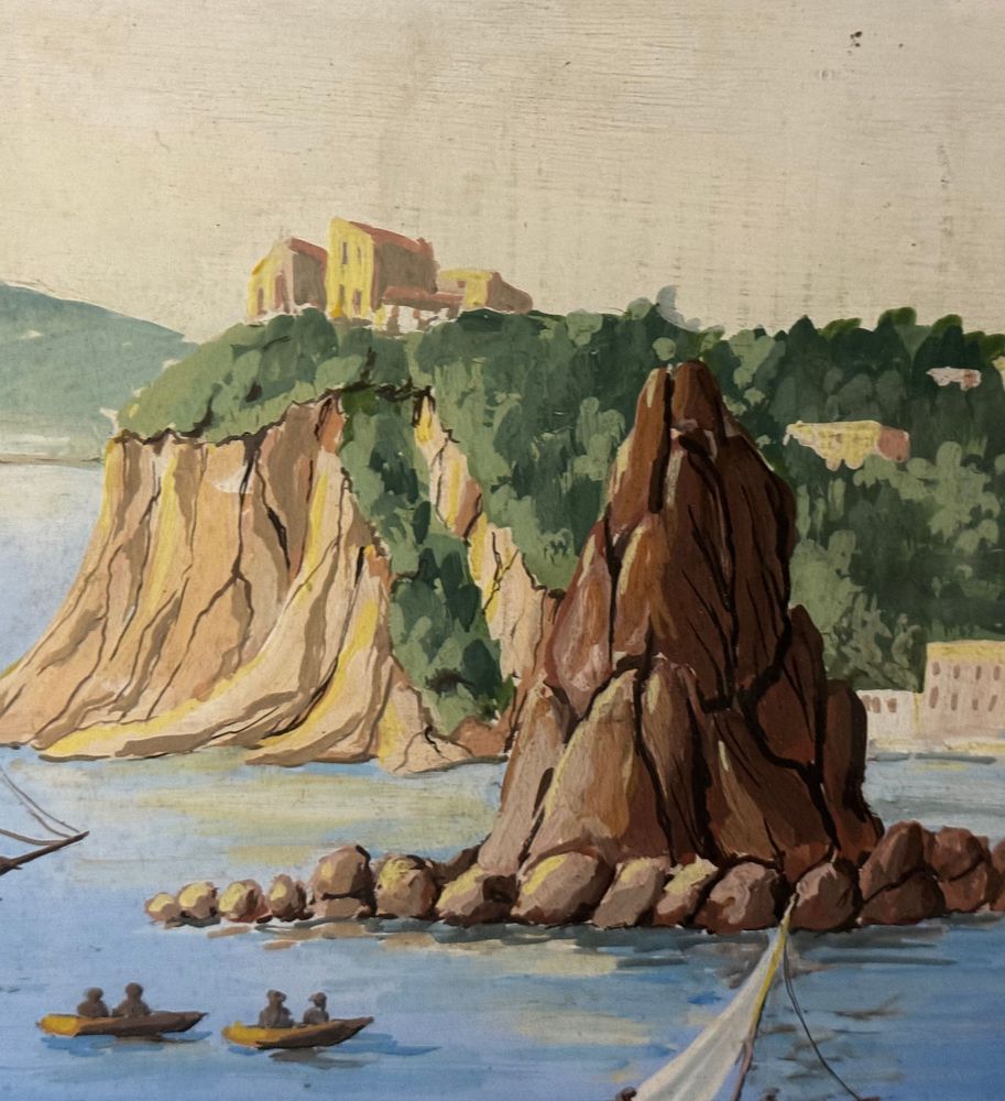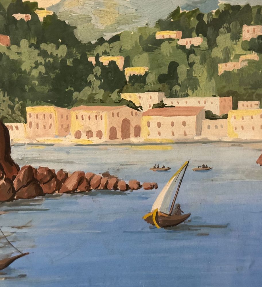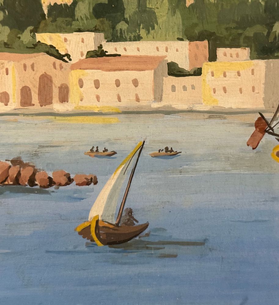 Dipinto guazzo (tempera su carta), periodo inizio XX secolo, scuola Italiana, raffigurante Scorcio marino con Isola di Procida e barche. Dimensioni compreso cornice: 86x116 cm. Dimensioni interno cornice: 68x98 cm. Da artista anonimo. Opera in buone condizioni e di ottima qualità.