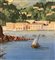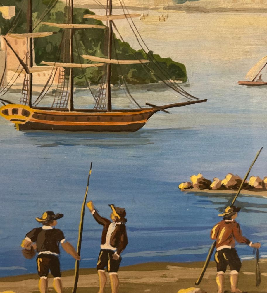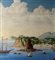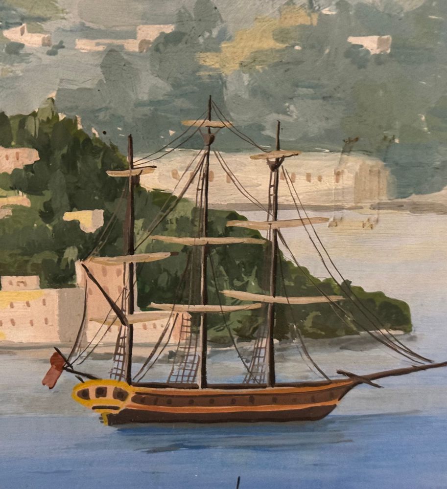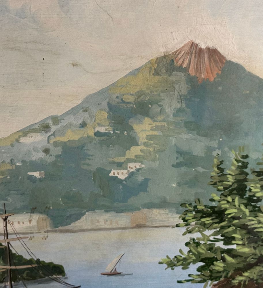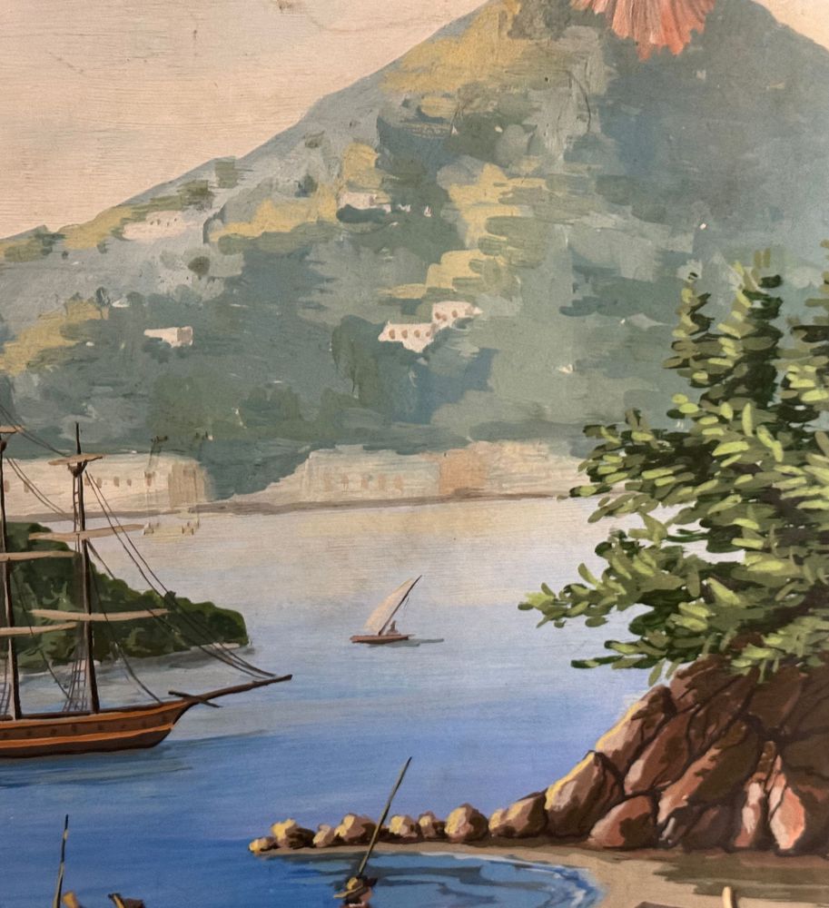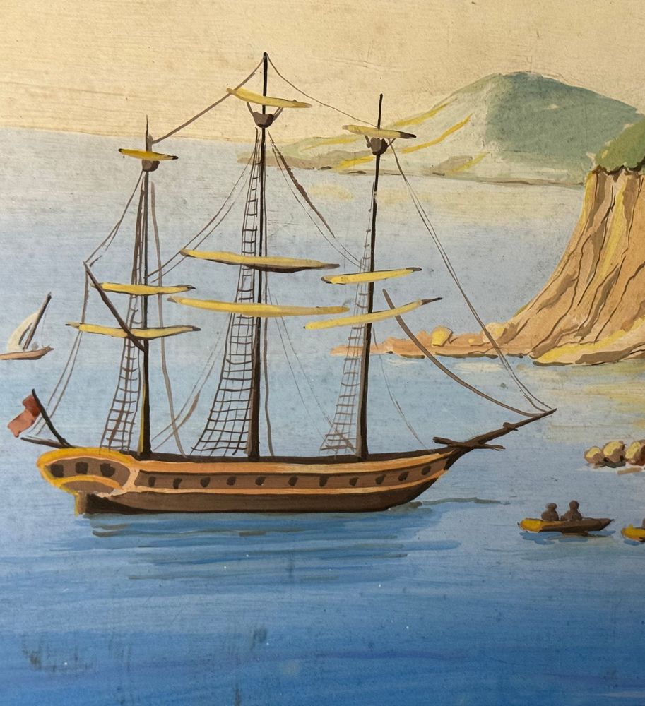Dipinto guazzo (tempera su carta), periodo inizio XX secolo, scuola Italiana, raffigurante Scorcio marino con Isola di Procida e barche. Dimensioni compreso cornice: 86x116 cm. Dimensioni interno cornice: 68x98 cm. Da artista anonimo. Opera in buone condizioni e di ottima qualità.