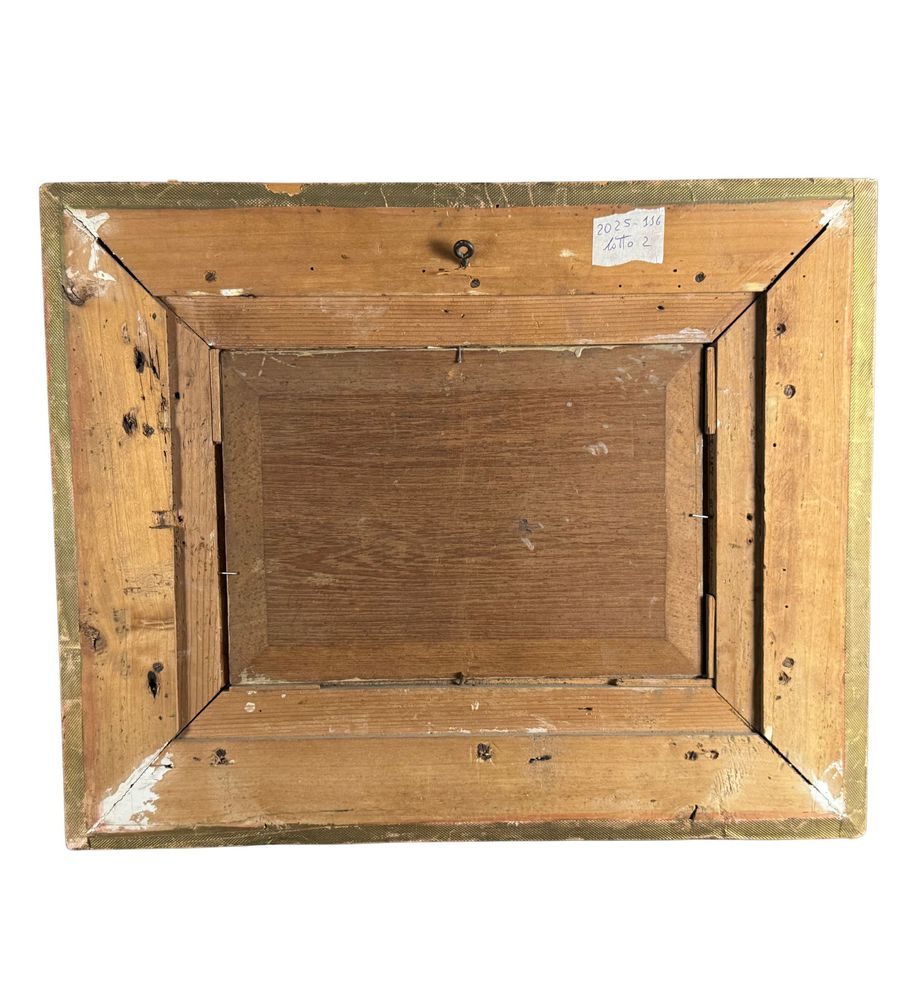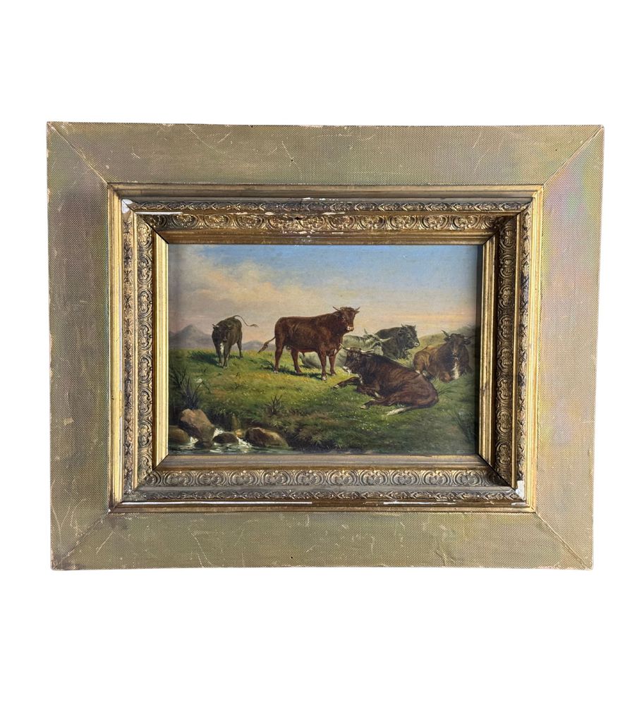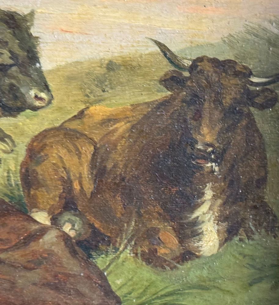 Dipinto olio su tavola, periodo XIX secolo, scuola Italiana, raffigurante Bestiame. Dimensioni compreso cornice: 57x47 cm. Dimensioni interno cornice: 24x35 cm. Artista anonimo. Opera in buone condizioni. Cornice con segni di vissuto come da foto allegate.