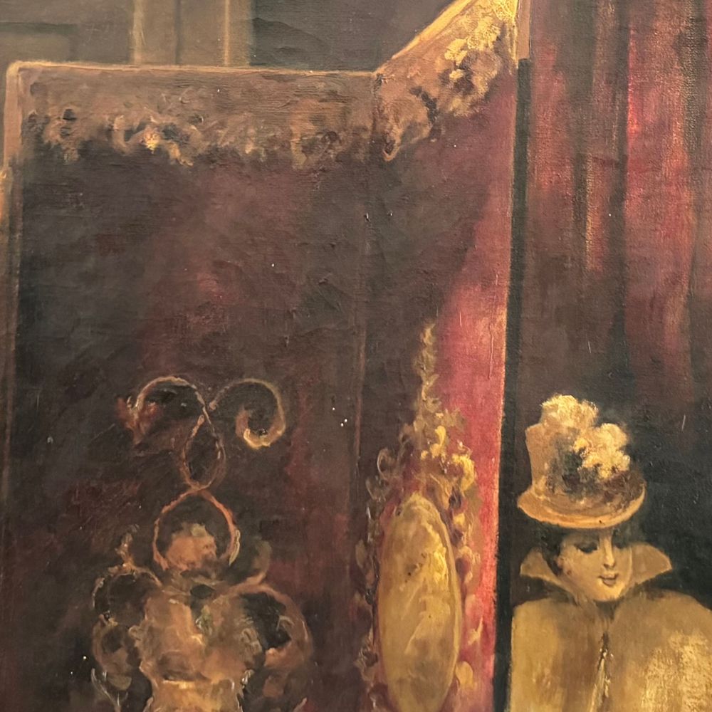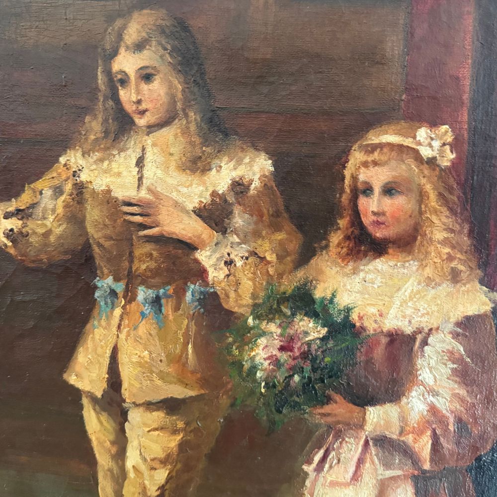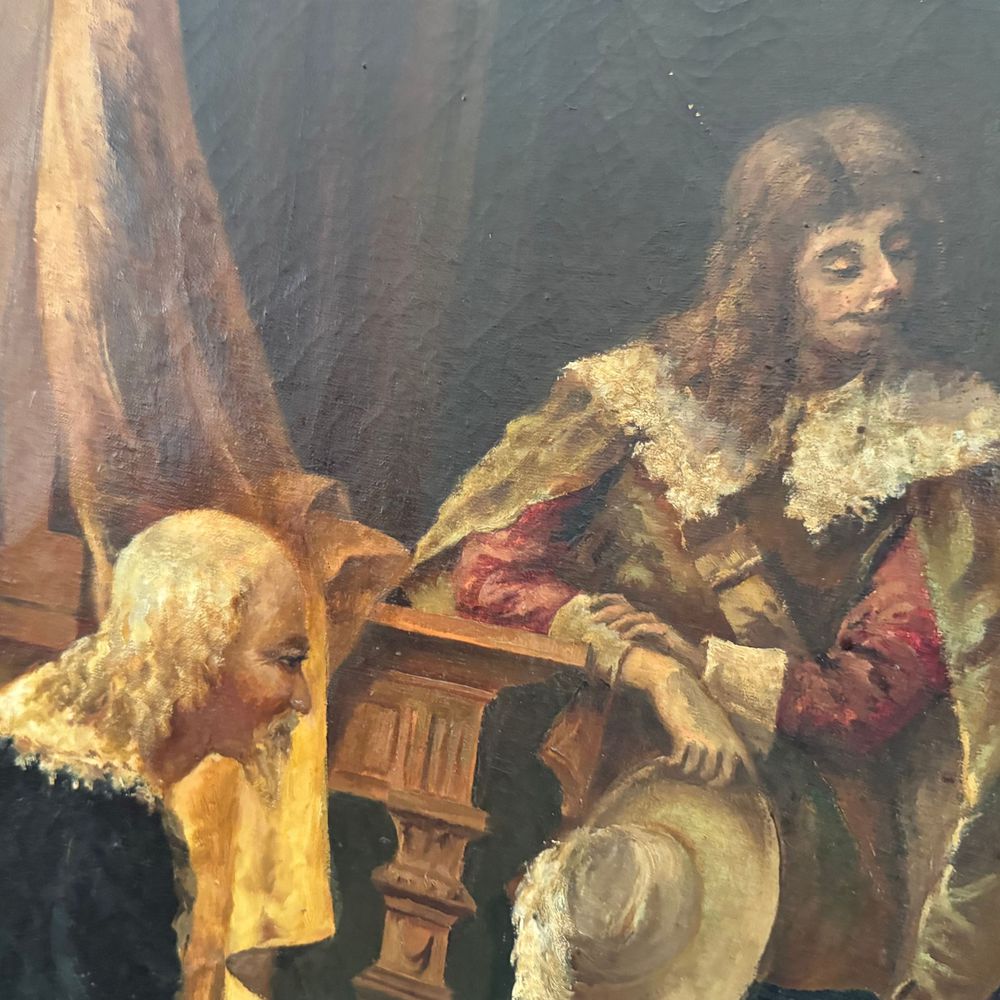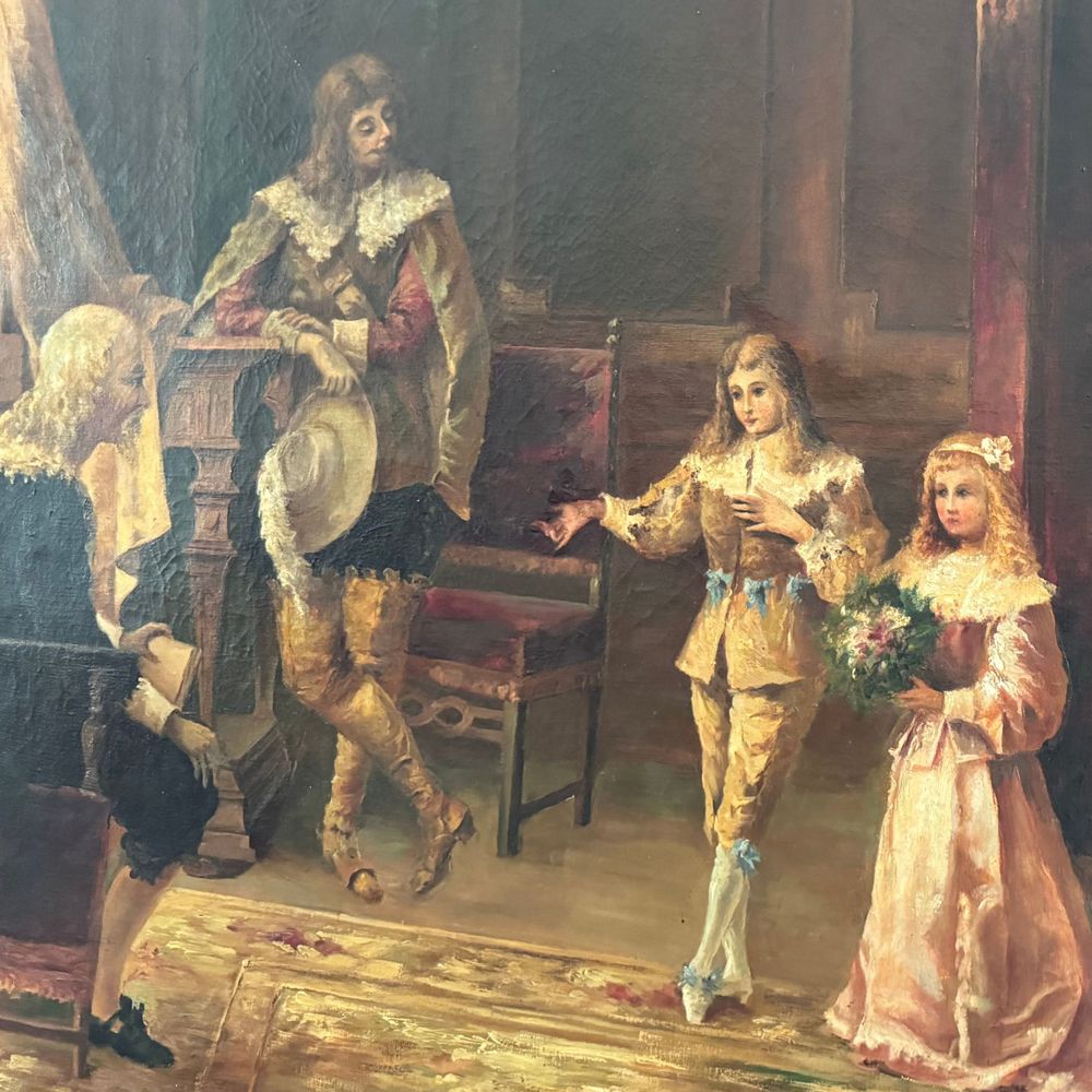 Dipinto olio su tela, periodo XIX/XX secolo scuola Italiana, raffigurante Scena cortese, il Precettore conosce i suoi giovani alunni. Copia d'autore. Dimensioni interno cornice: 120x80 cm . Restauro di 3 centimetri nella parte destra della tela. Reca firma in basso a destra da artista non identificato.