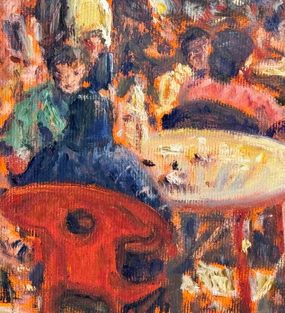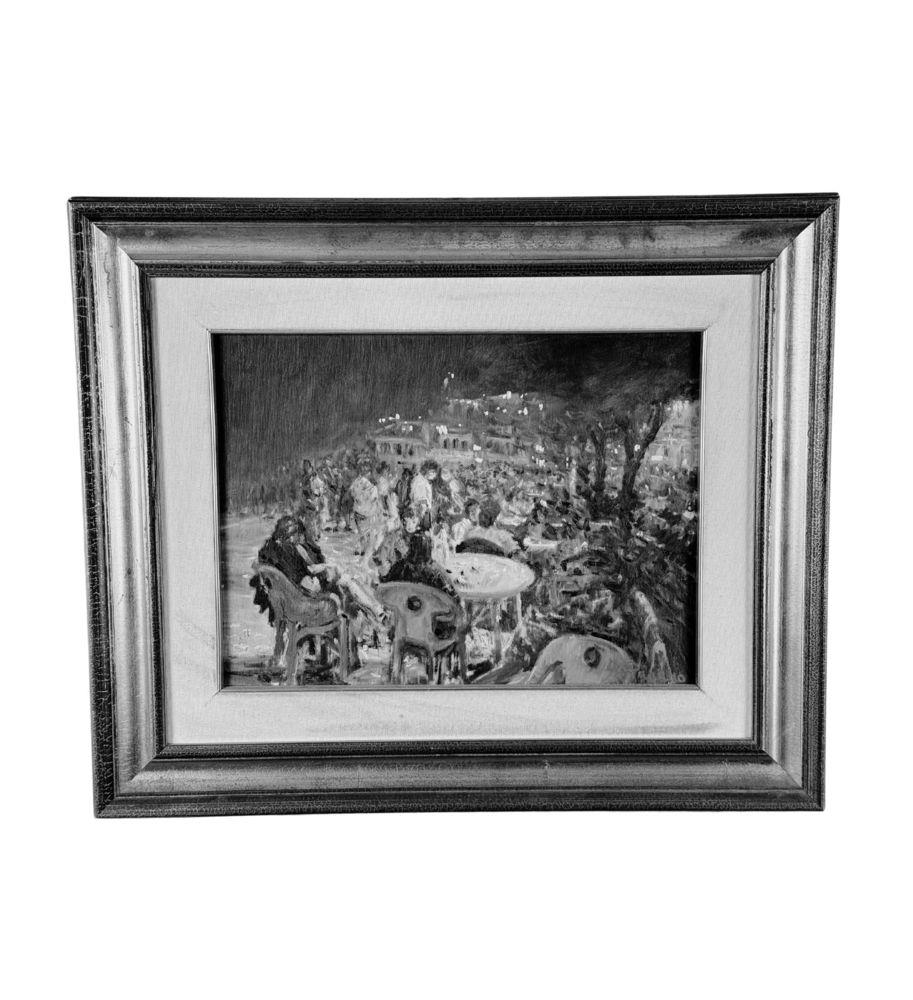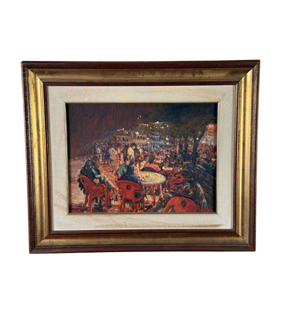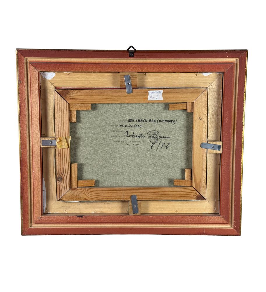 Dipinto olio su tela, periodo XX secolo scuola Italiana, raffigurante "Allo Snack bar (Diamante)". Dimensioni compreso cornice: 60x50 cm. Dimensioni interno cornice: 40x30 cm. Reca firma in basso a destra e autentica sul retro Roberto Pagano. Opera in buone condizioni.