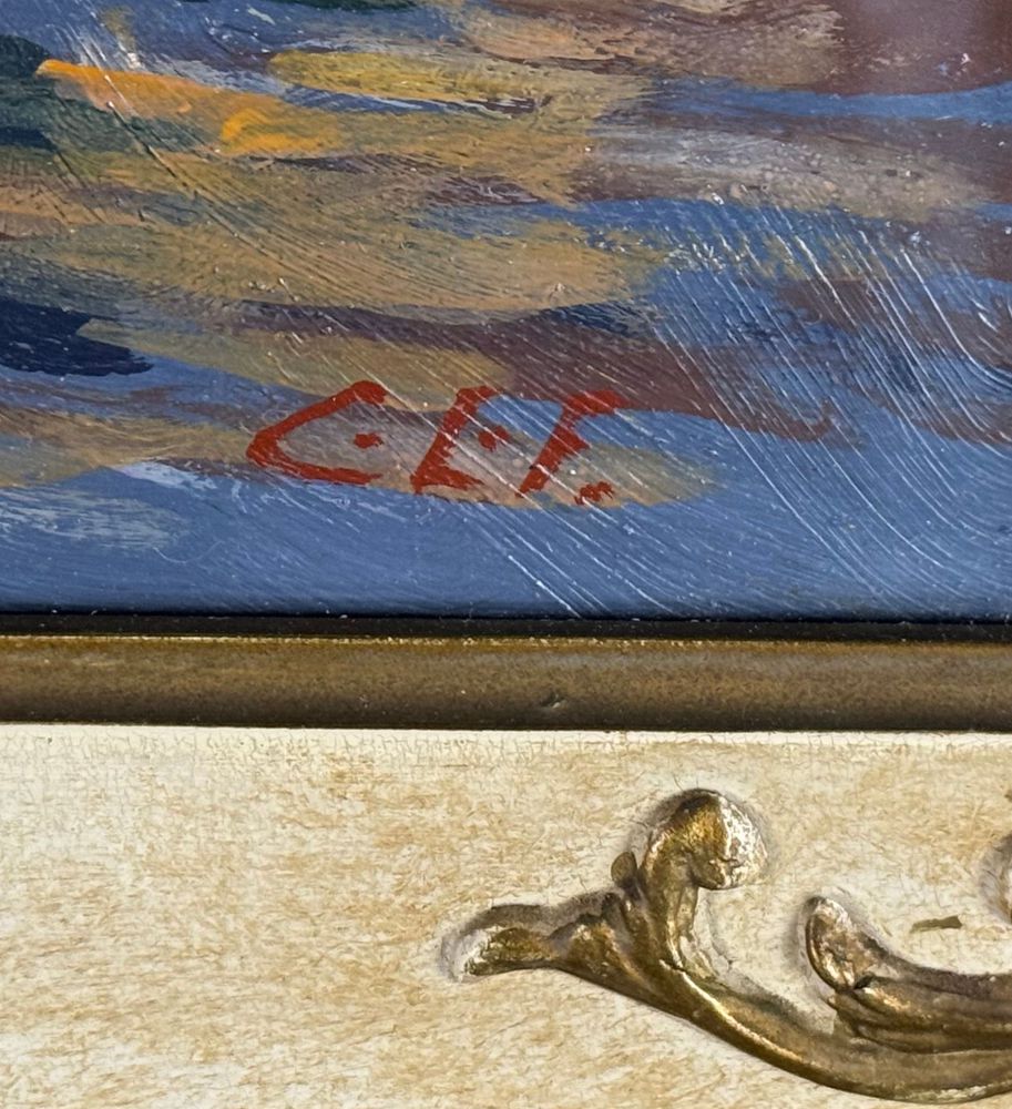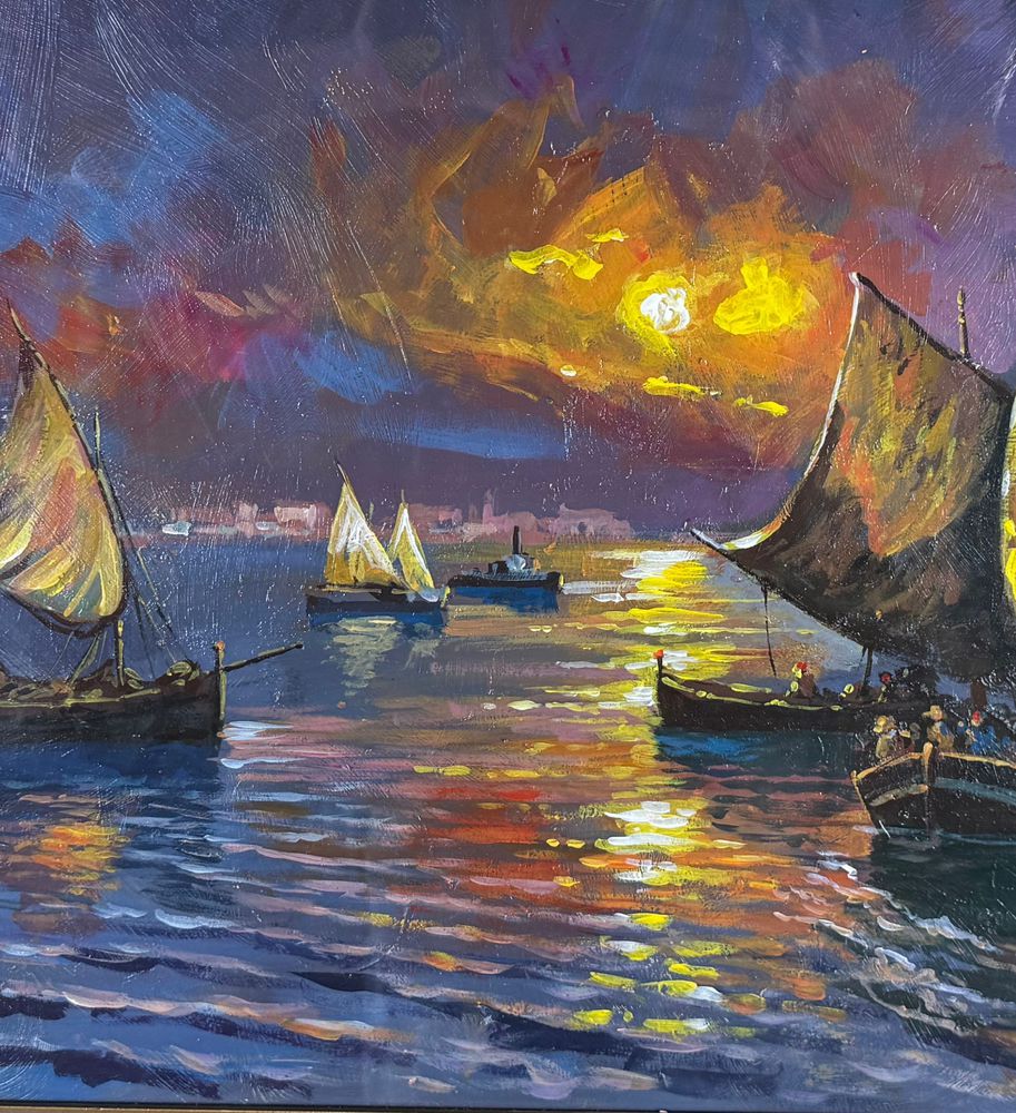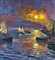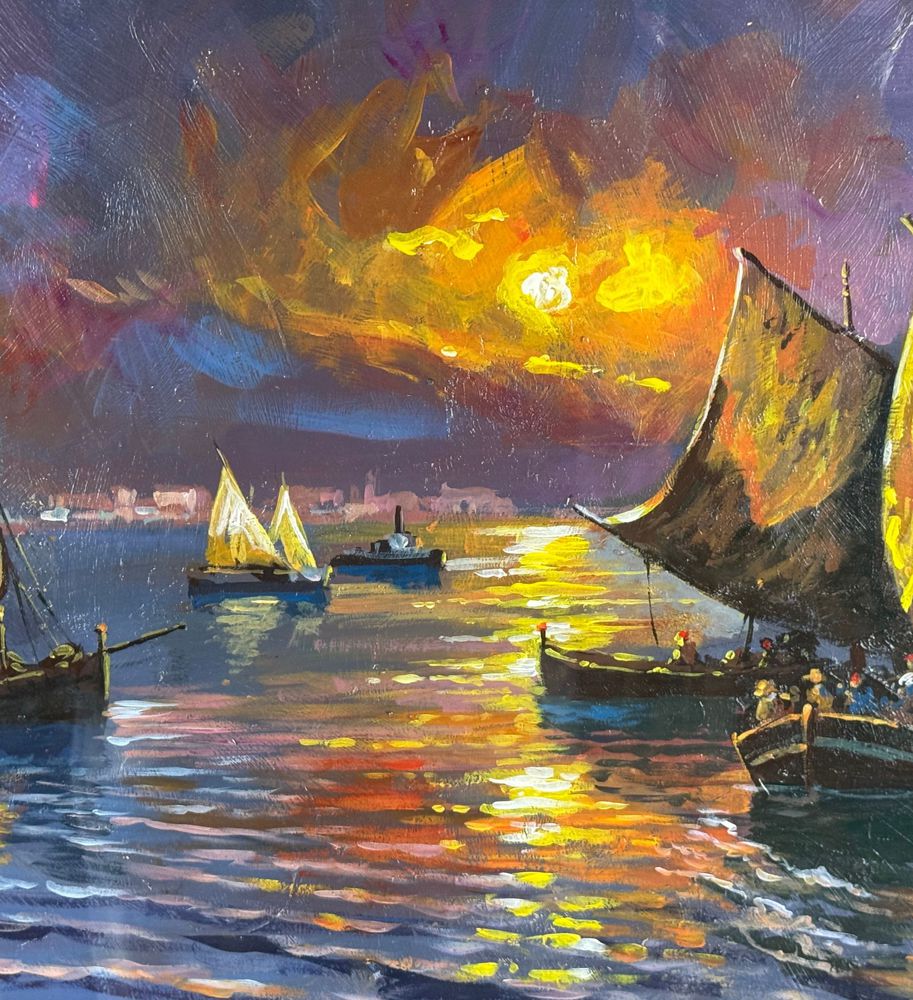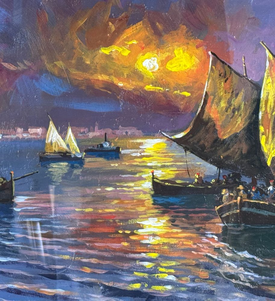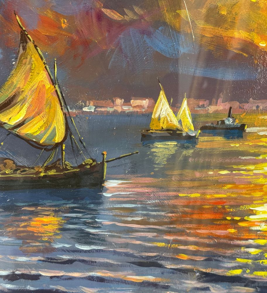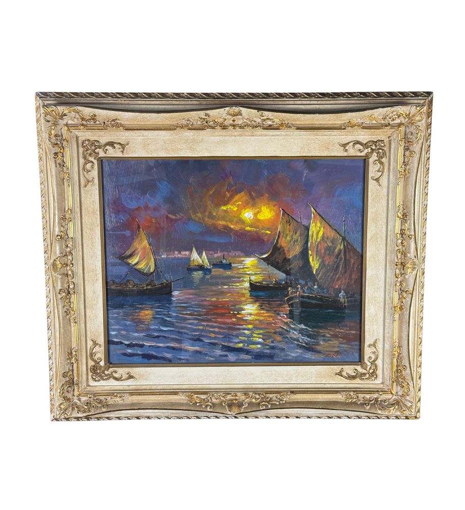 Dipinto olio su pannello, periodo XX secolo scuola Italiana, raffigurante Marina con barche al tramonto. Dimensioni compreso cornice: 72x63 cm. Dimensioni interno cornice: 50x40 cm . Siglato in basso a sinistra da artista non identificato. Opera in buone condizioni e di eccellente qualità artistica.