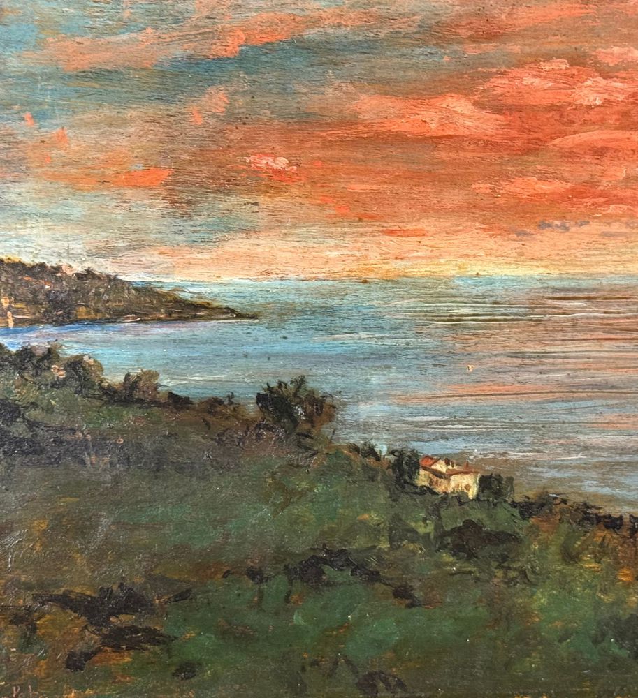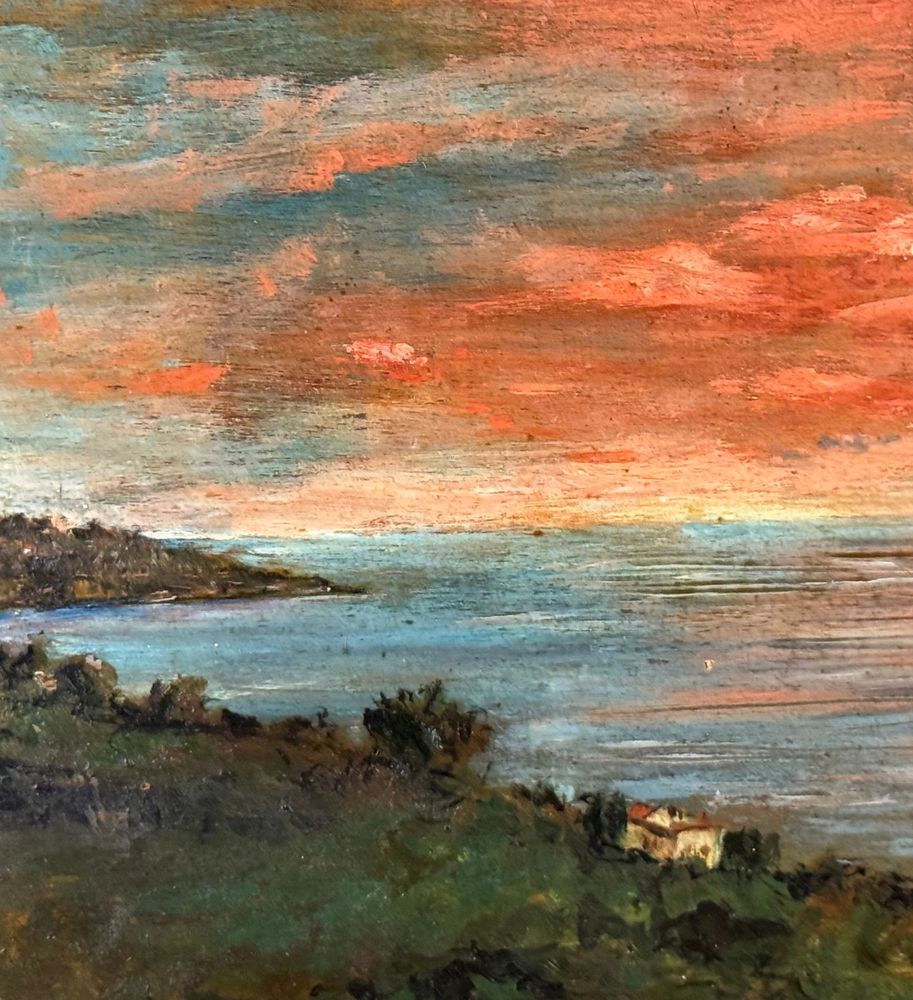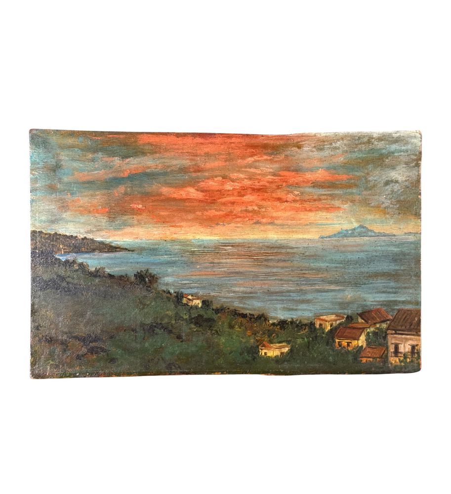 Dipinto olio su tavola, periodo XX secolo, scuola Europea, raffigurante Paesaggio marino. Dimensioni: 37,5x23,5 cm. Traccia di firma in basso a sinistra da artista non identificato. Opera in buone condizioni con lievi segni di vissuto come da foto allegate.