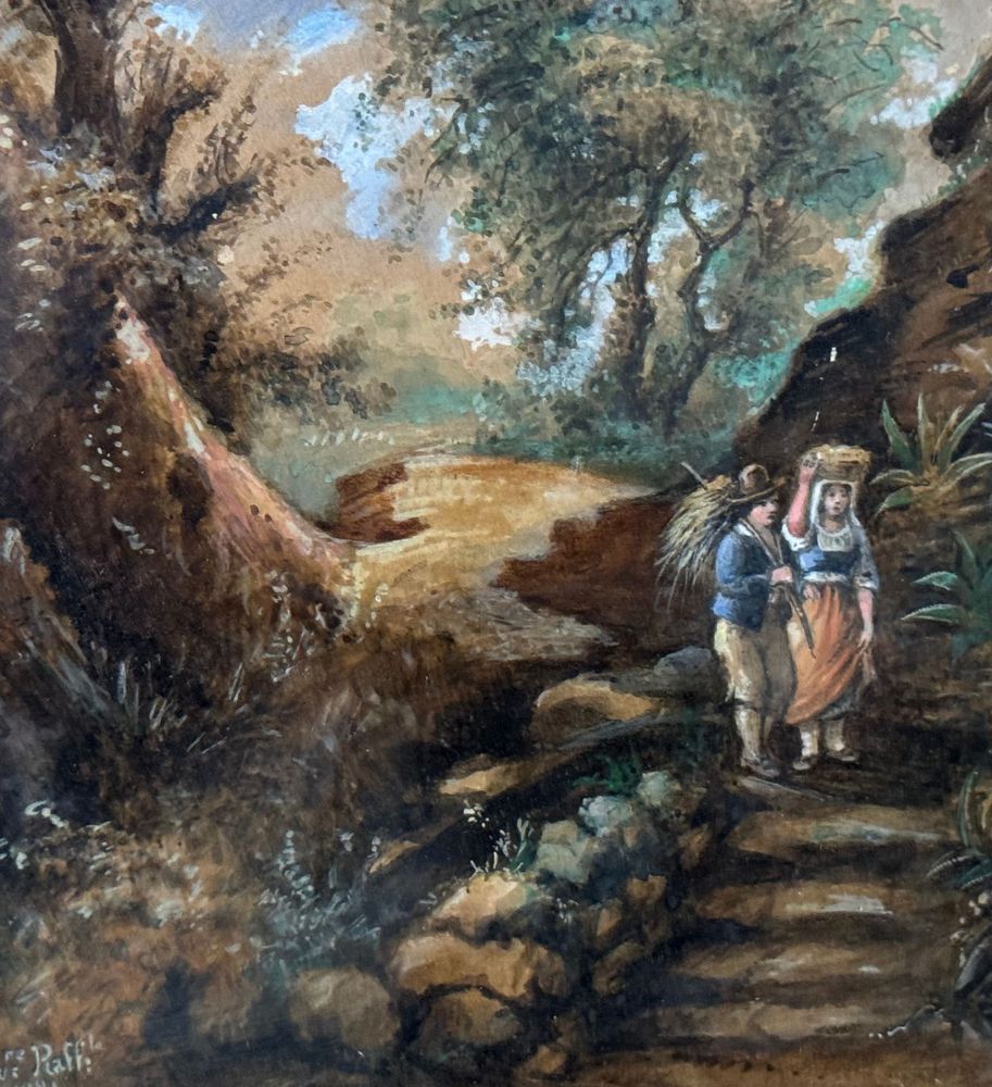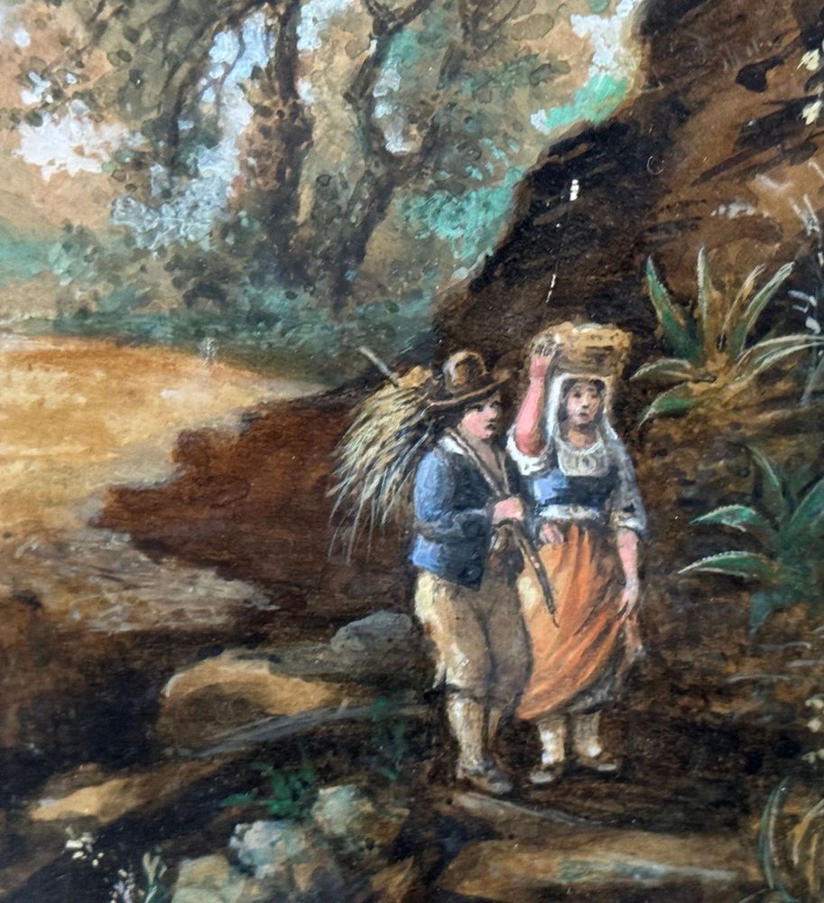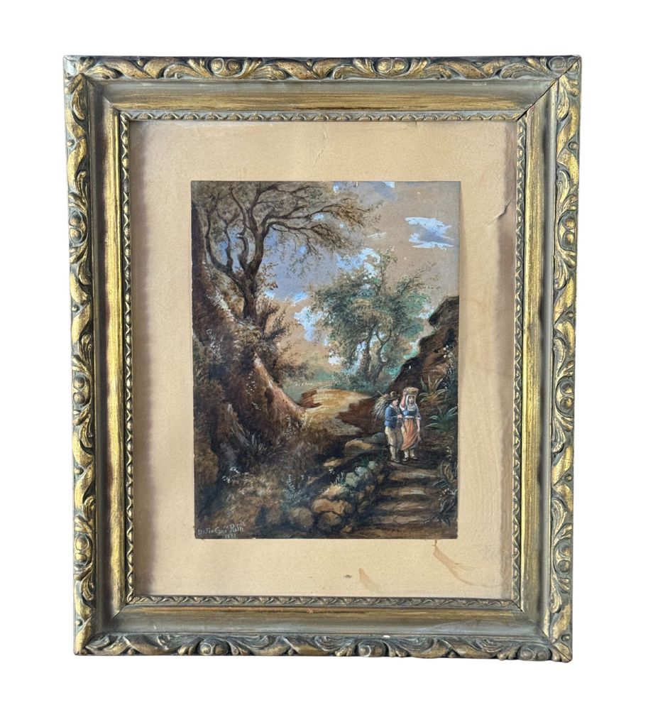 Dipinto olio su cartoncino, periodo XIX/XX secolo, scuola Italiana, raffigurante Paesaggio con personaggi. Dimensioni compreso cornice: 41x49 cm. Dimensioni interno cornice: 22x30 cm. Firmato in basso a sinistra artista non identificato. Opera in buone condizioni.