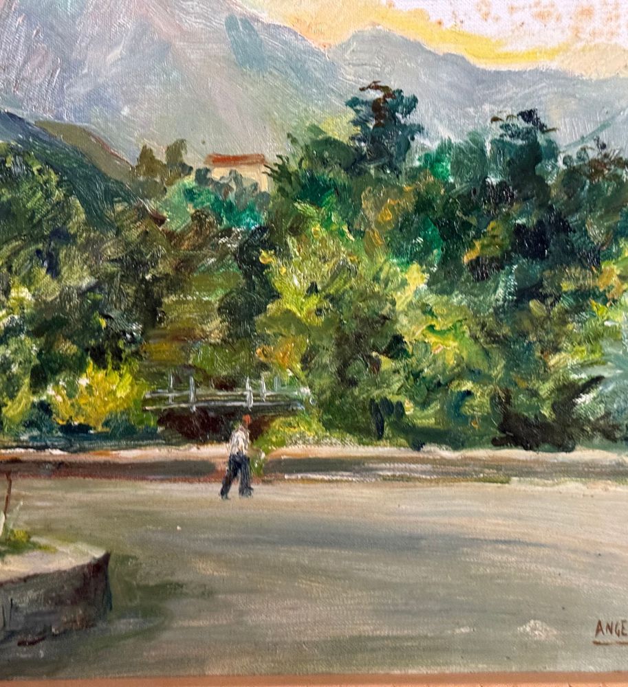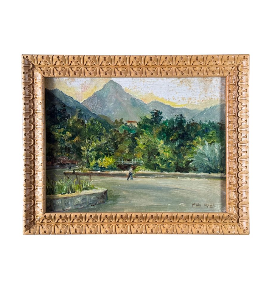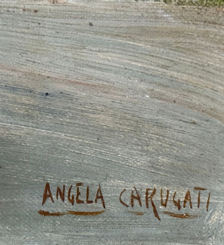 Dipinto olio su tela applicata su pannello, periodo XX secolo, scuola Italiana, raffigurante Paesaggio. Dimensioni compreso cornice: 48x38 cm. Dimensioni interno cornice: 30x40 cm. Firmato in basso a destra Angela Carugati. Opera in buone condizioni.