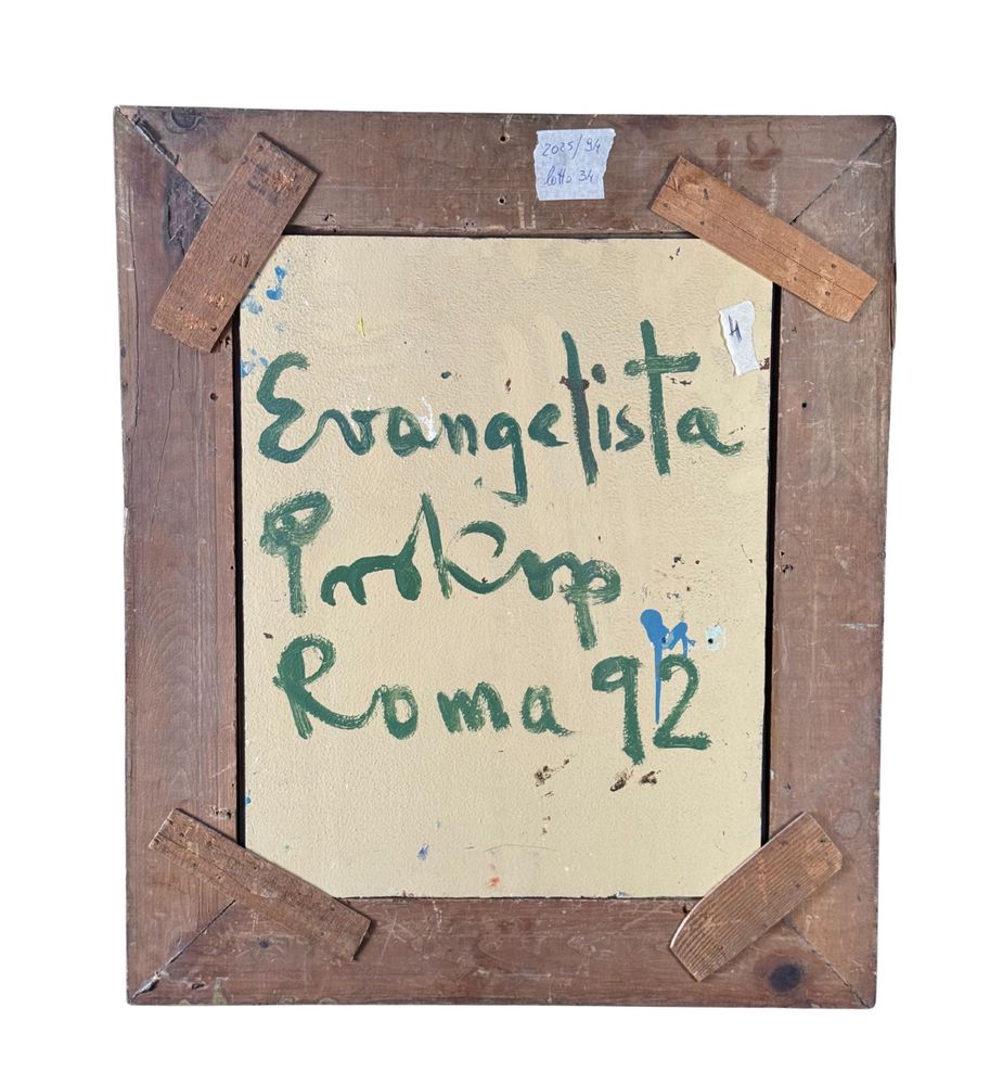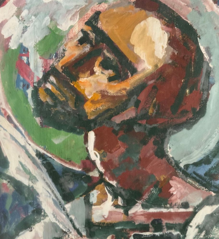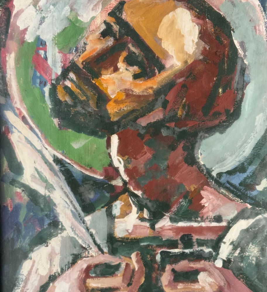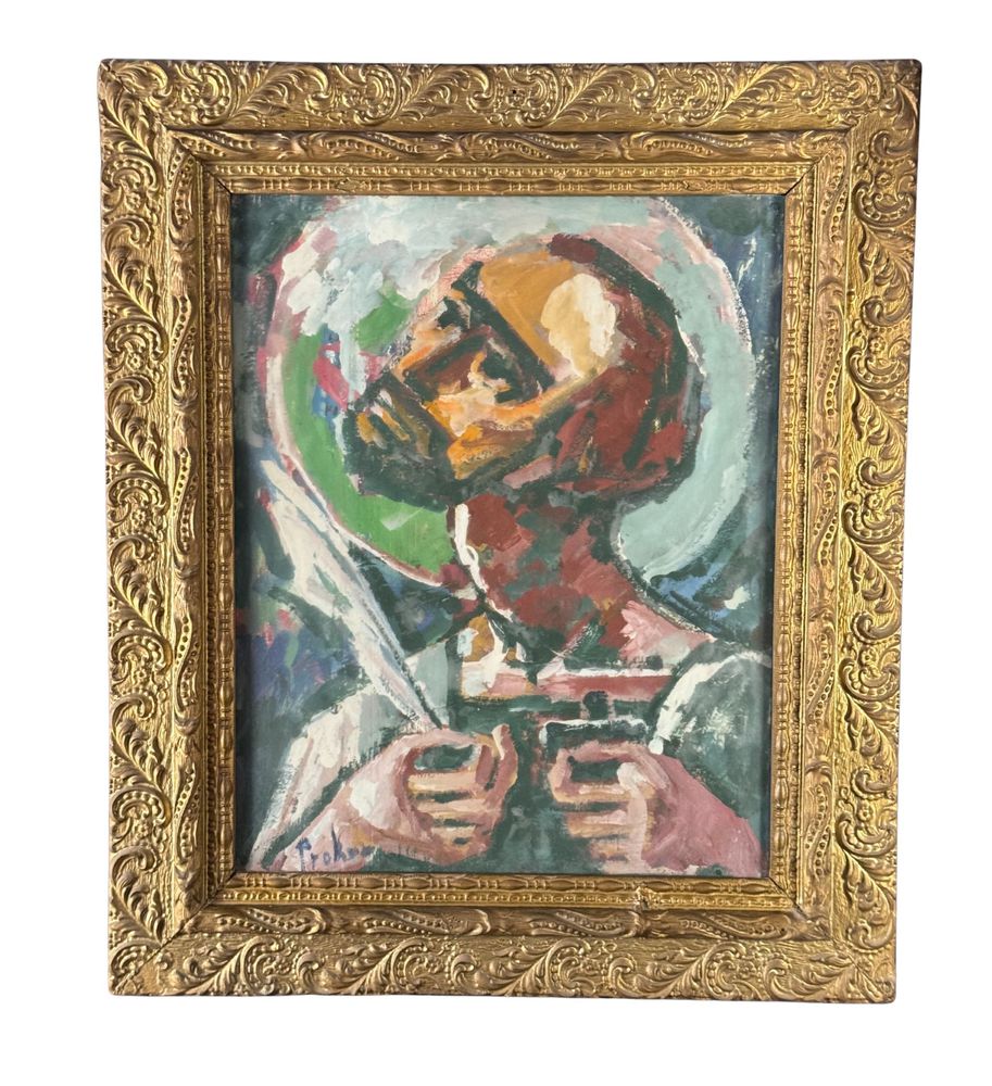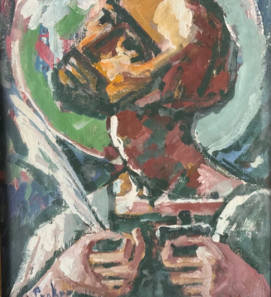 Dipinto olio su pannello, periodo XX secolo, scuola Italiana, raffigurante Personaggio nella maniera futuristica. Dimensioni compreso cornice: 58x68 cm. Dimensioni interno cornice: 40x50 cm. Firmato in basso a sinistra artista non identificato. Opera in buone condizioni.