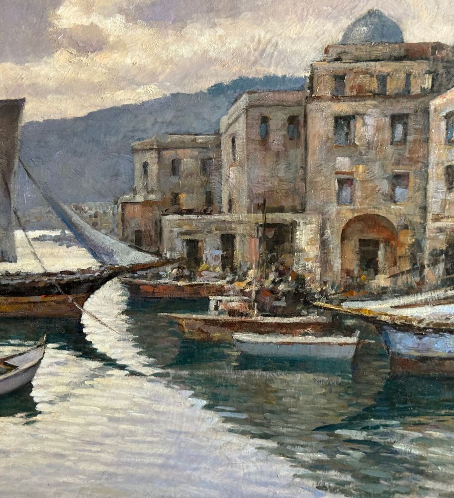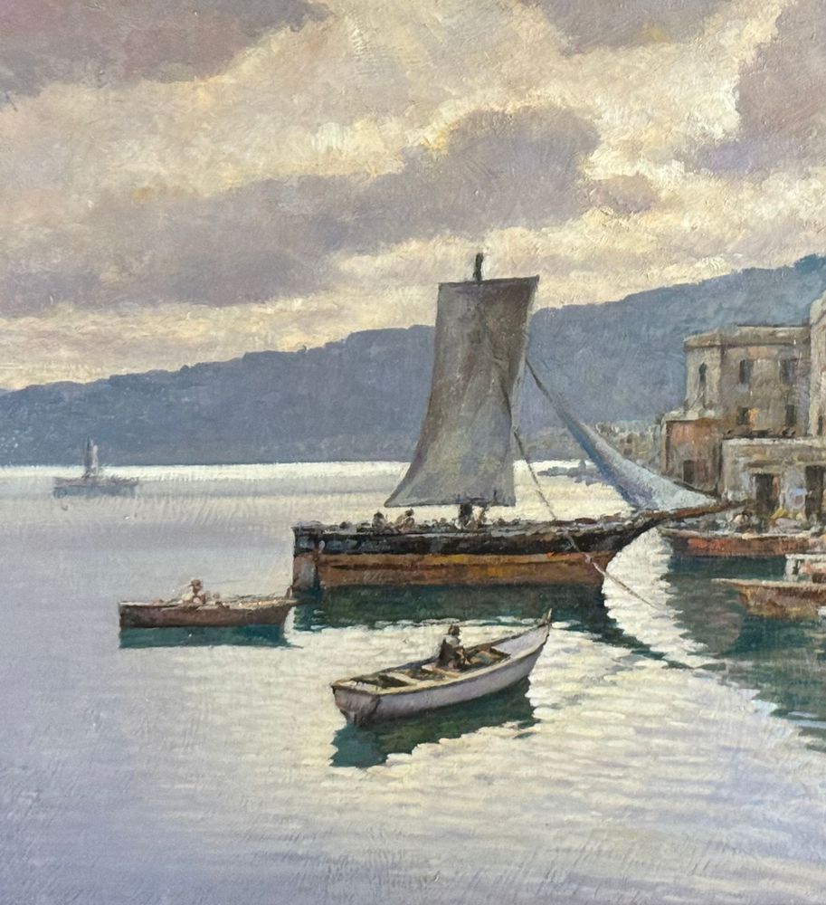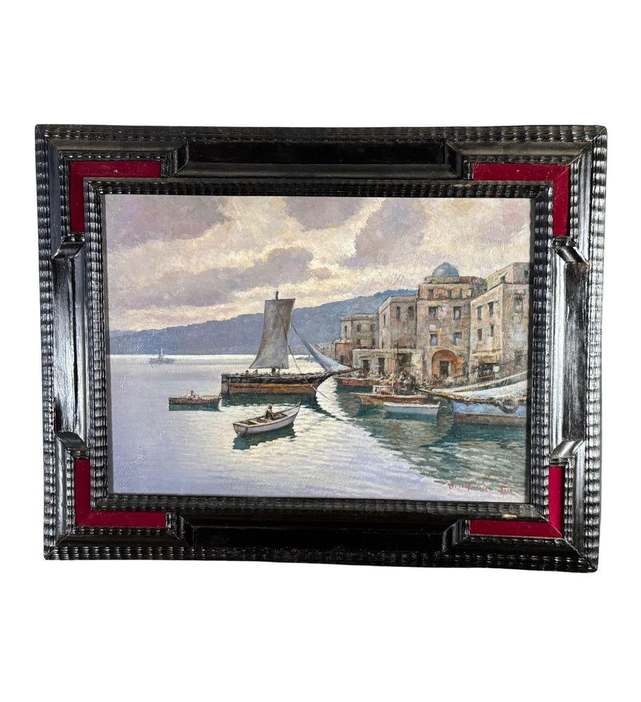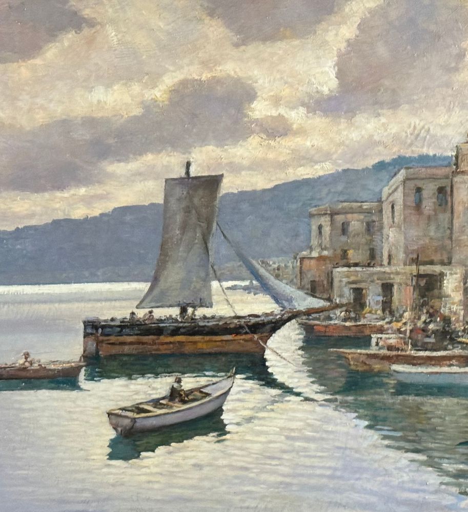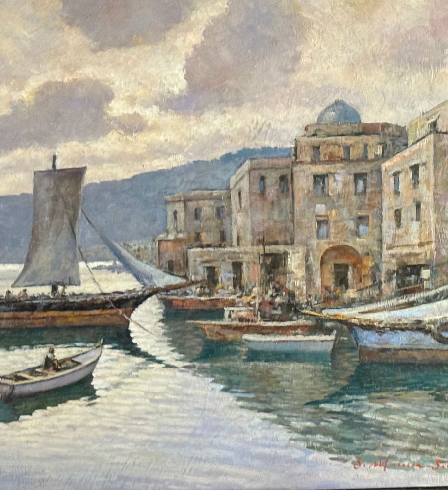 Dipinto olio su pannello, periodo XX secolo, scuola Italiana, raffigurante Scorcio di marina con barche e pescatori. Dimensioni compreso cornice: 91x72 cm. Dimensioni interno cornice: 71x50 cm. Firmato in basso a destra S. Maresca Serra. Opera in buone condizioni e di ottima qualità artistica.