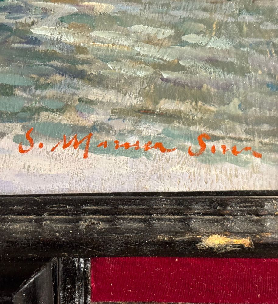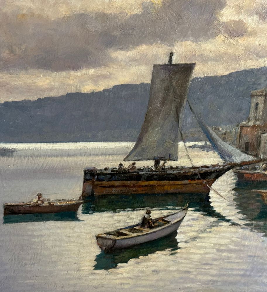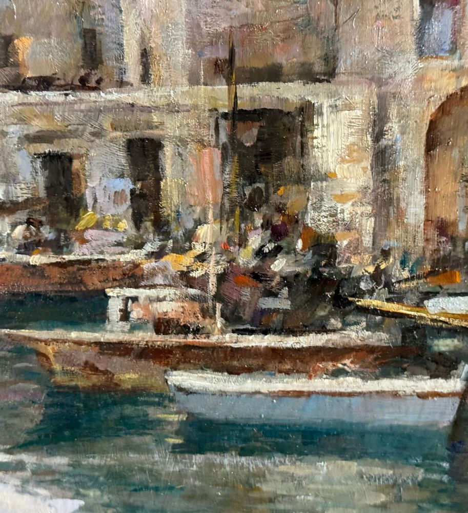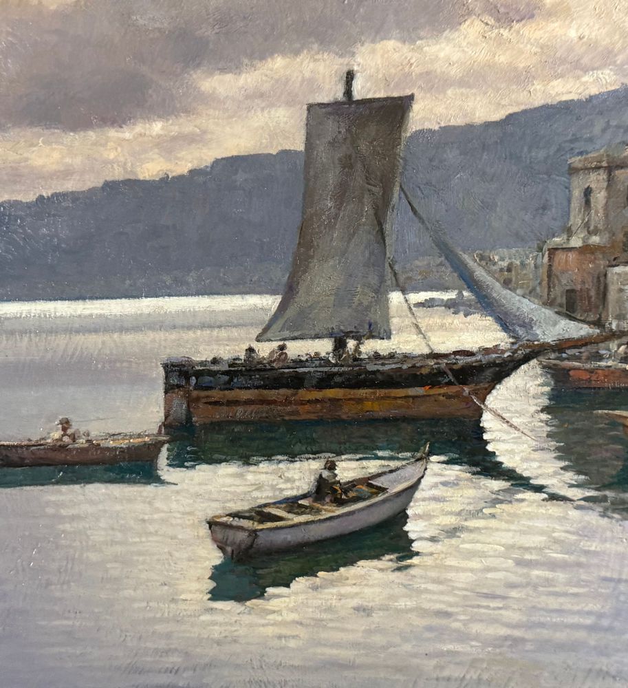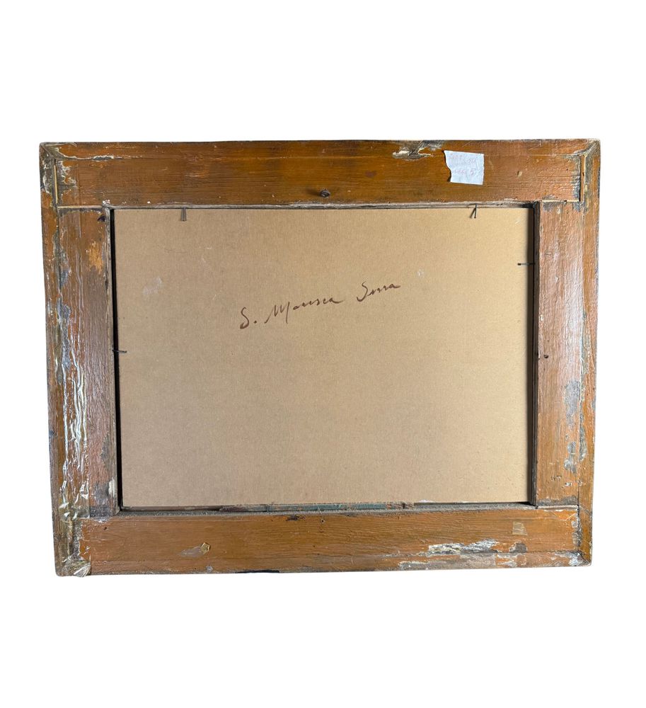 Dipinto olio su pannello, periodo XX secolo, scuola Italiana, raffigurante Scorcio di marina con barche e pescatori. Dimensioni compreso cornice: 91x72 cm. Dimensioni interno cornice: 71x50 cm. Firmato in basso a destra S. Maresca Serra. Opera in buone condizioni e di ottima qualità artistica.