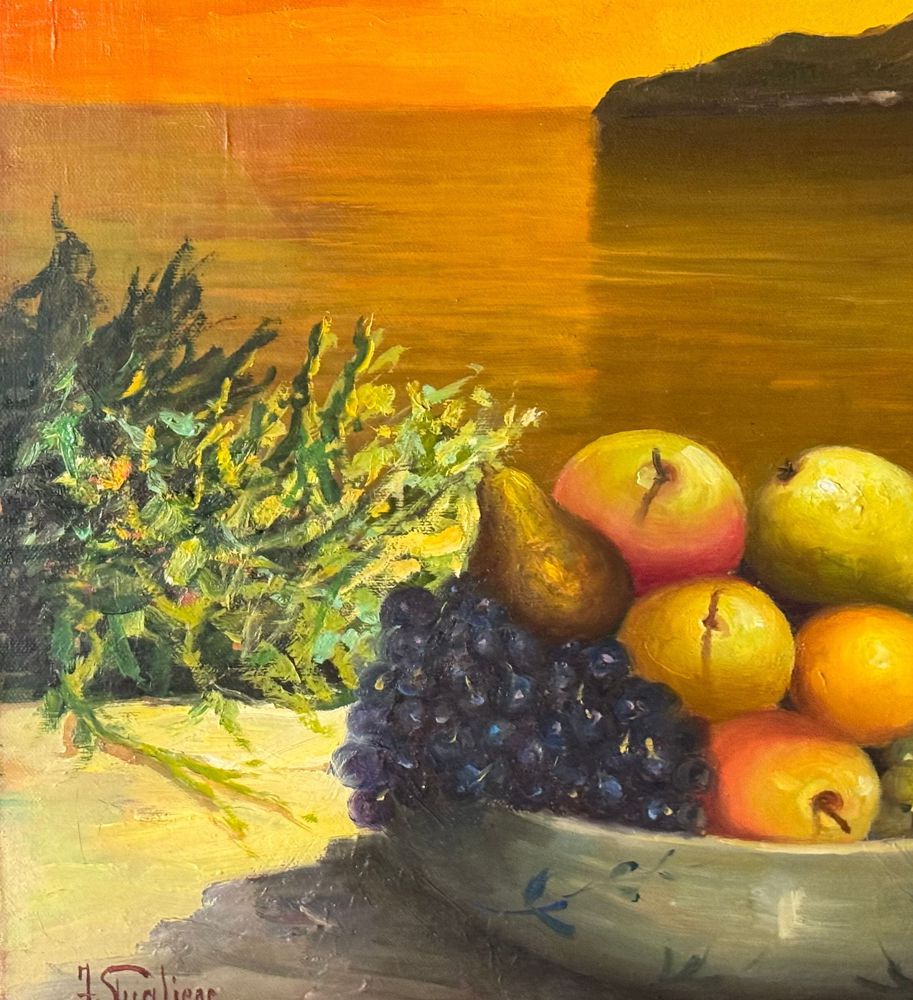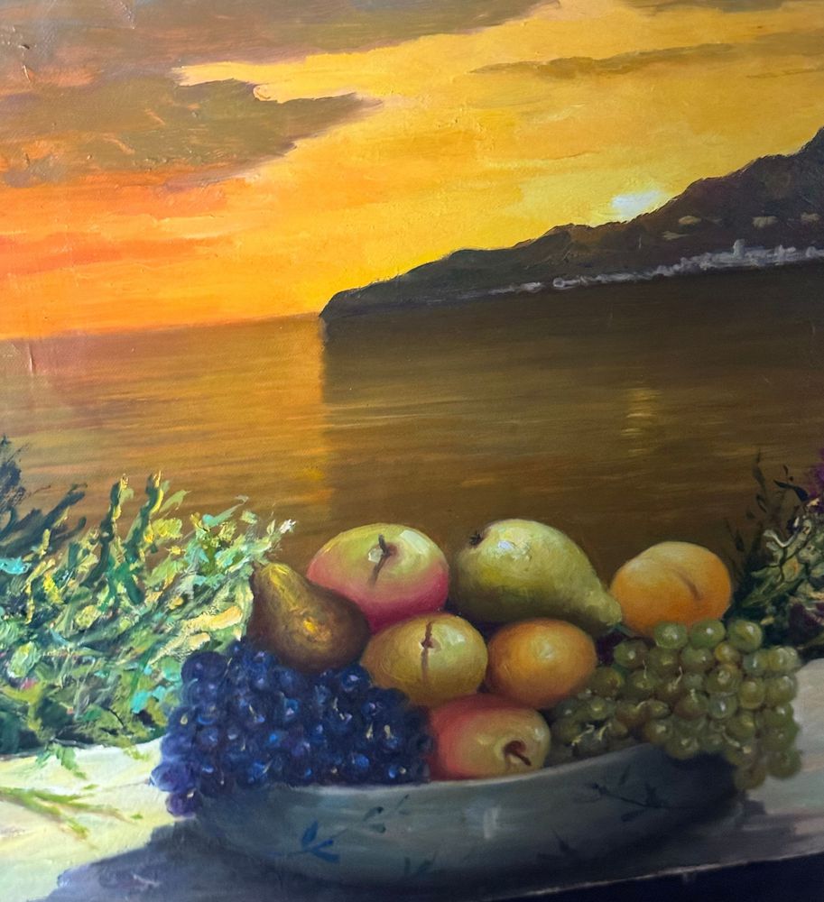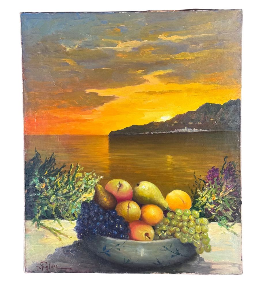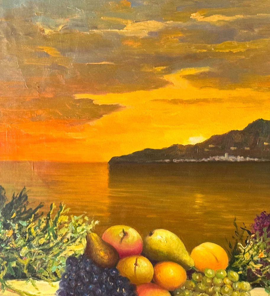 Dipinto olio su tela, periodo XX secolo, scuola Italiana, raffigurante Natura morta con paesaggio marino al tramonto. Dimensioni: 50x60 cm. Firmato in basso a sinistra Fortunato Pugliese. Opera in buone condizioni con lievi segni di vissuto come da foto allegate.