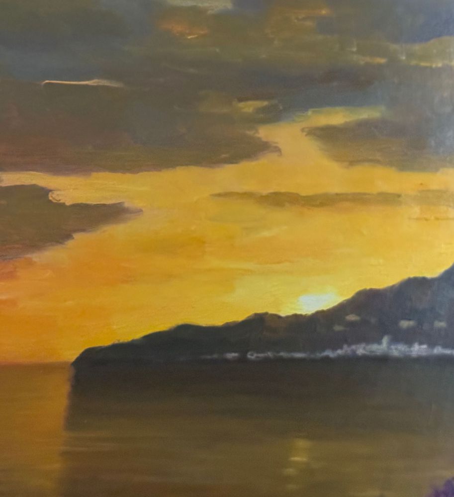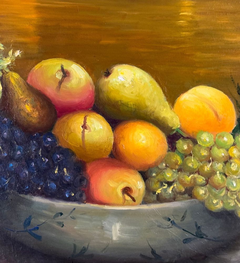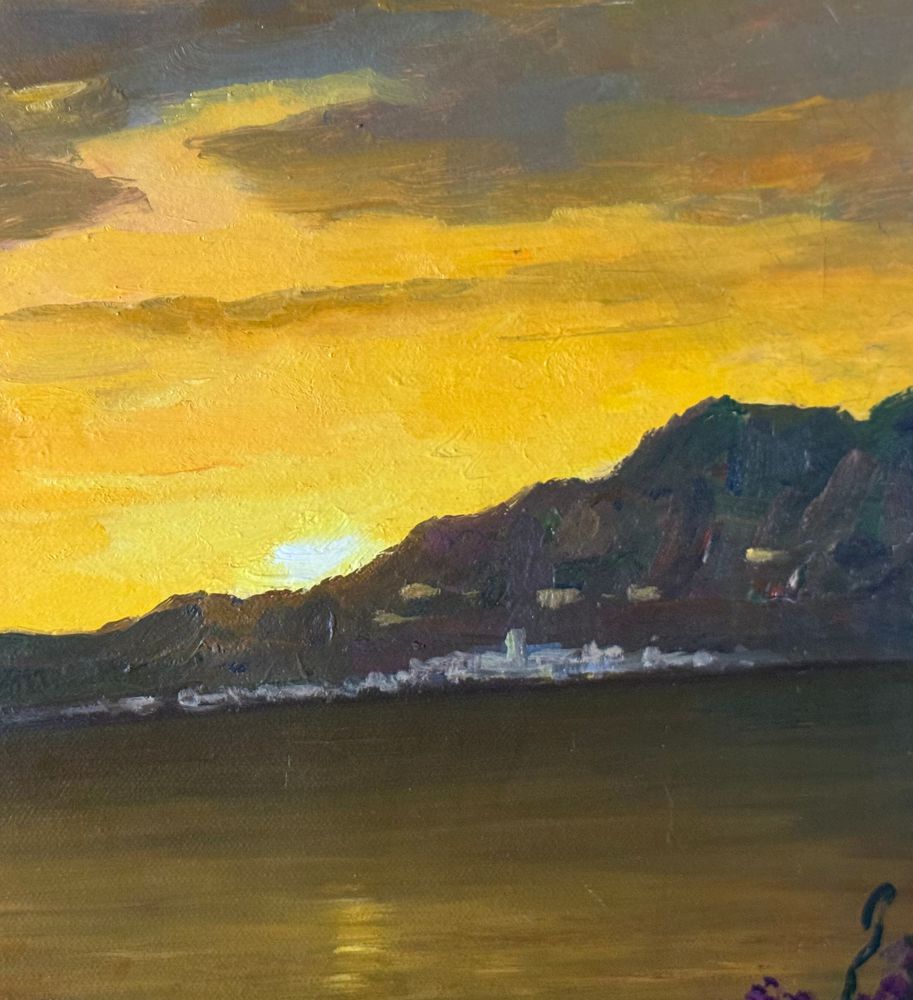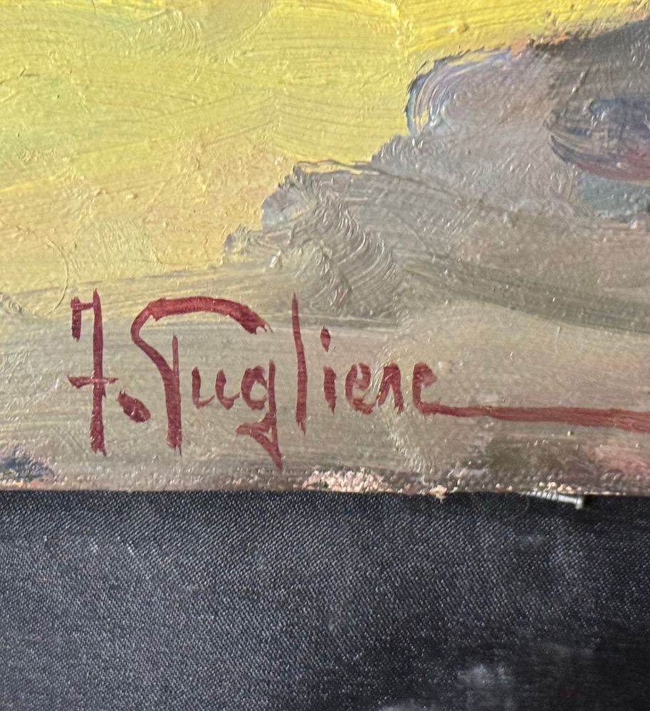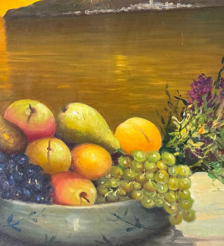 Dipinto olio su tela, periodo XX secolo, scuola Italiana, raffigurante Natura morta con paesaggio marino al tramonto. Dimensioni: 50x60 cm. Firmato in basso a sinistra Fortunato Pugliese. Opera in buone condizioni con lievi segni di vissuto come da foto allegate.