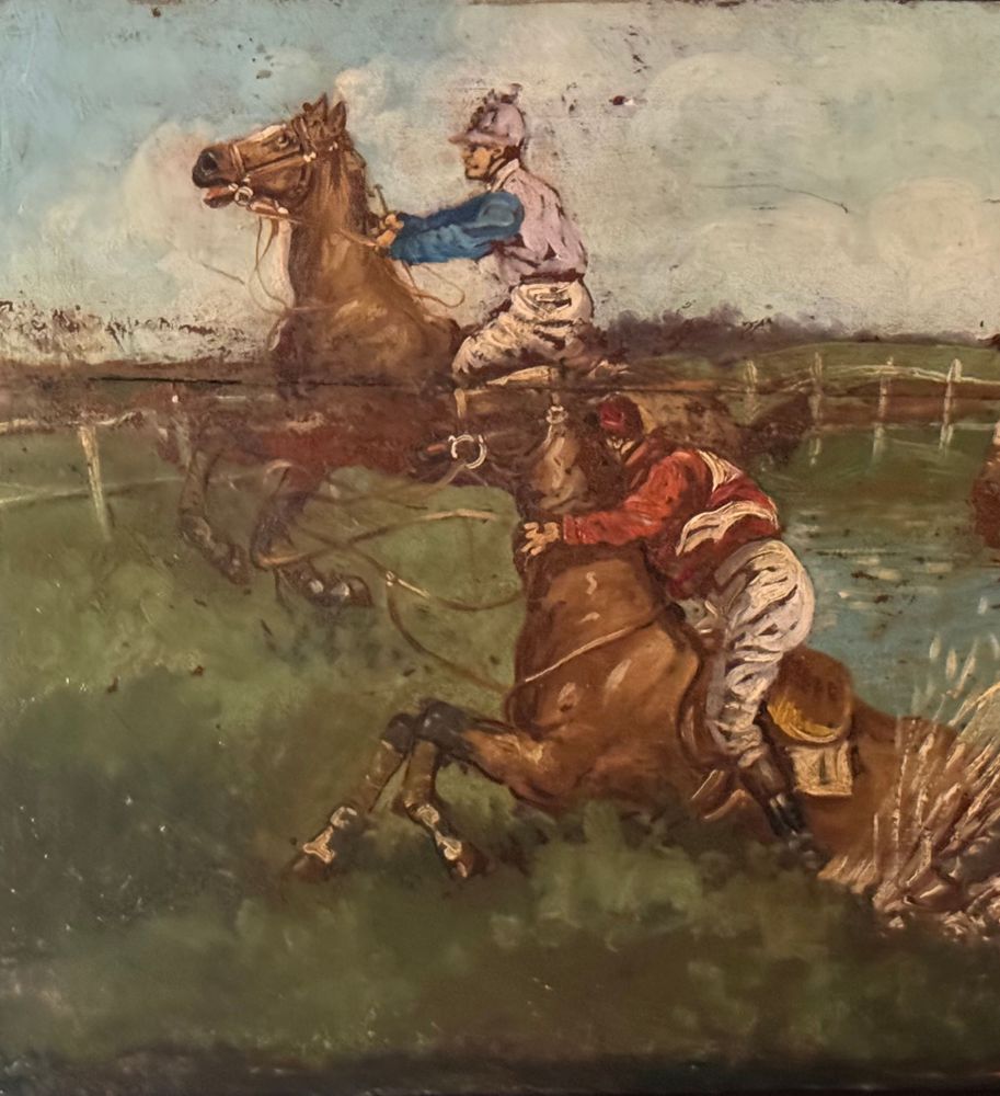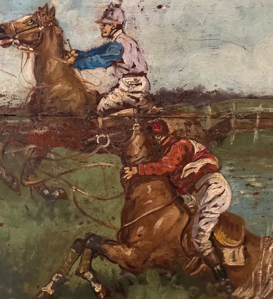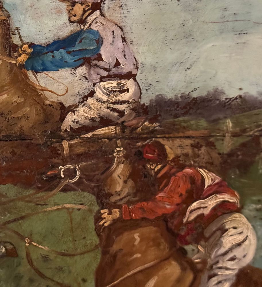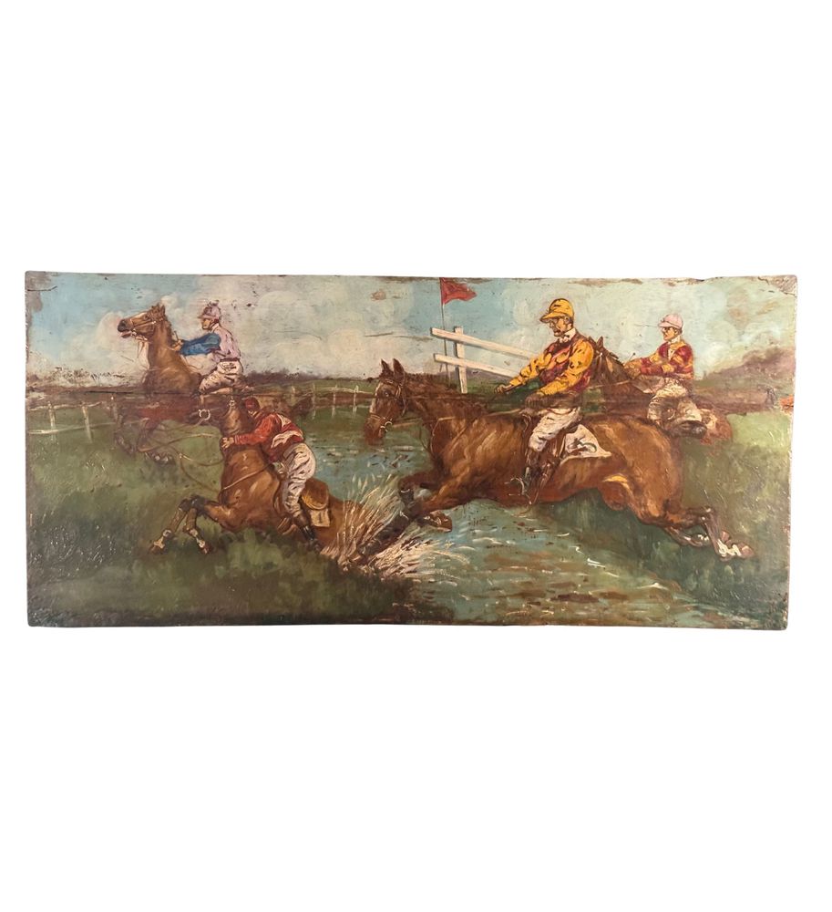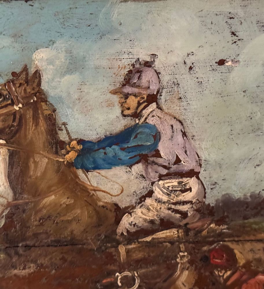 Dipinto olio su tavola, periodo XX secolo scuola italiana, raffigurante Scena Ippica. Dimensioni: 67x31 cm. Da artista anonimo. Opera in discrete condizioni come da foto allegate.