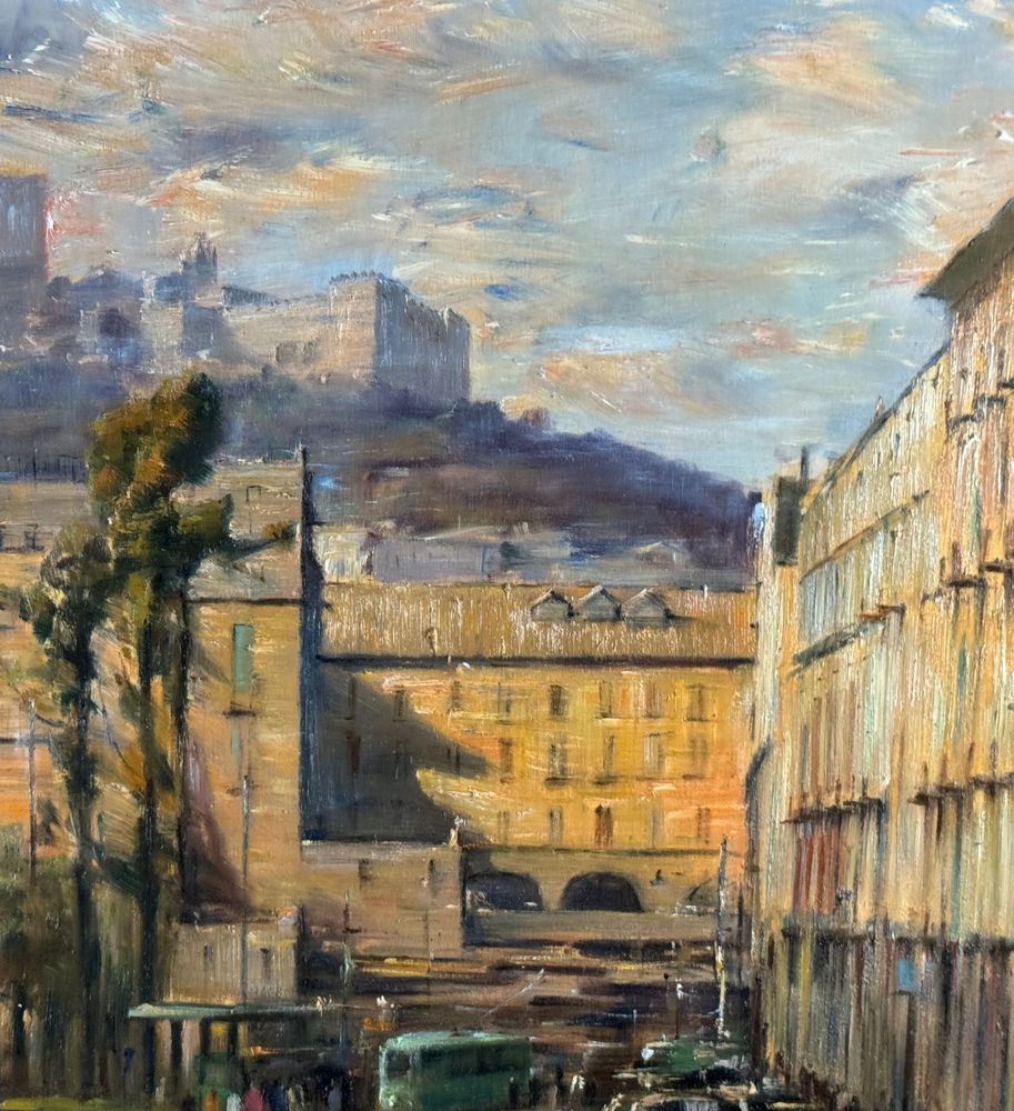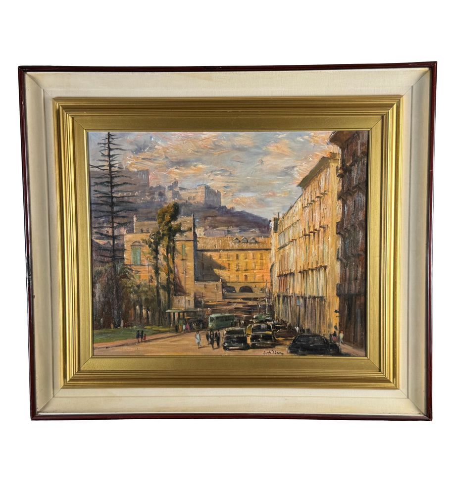 Dipinto olio su tavola, periodo XX secolo, scuola Italiana, raffigurante Strada napoletana. Dimensioni compreso cornice: 79x70 cm. Dimensioni interno cornice: 55x45 cm. Firmato in basso a destra Antonio D'Urso. Opera in buone condizioni.