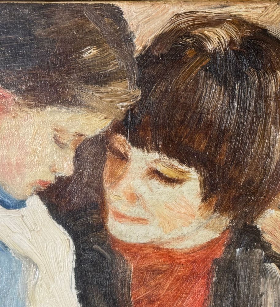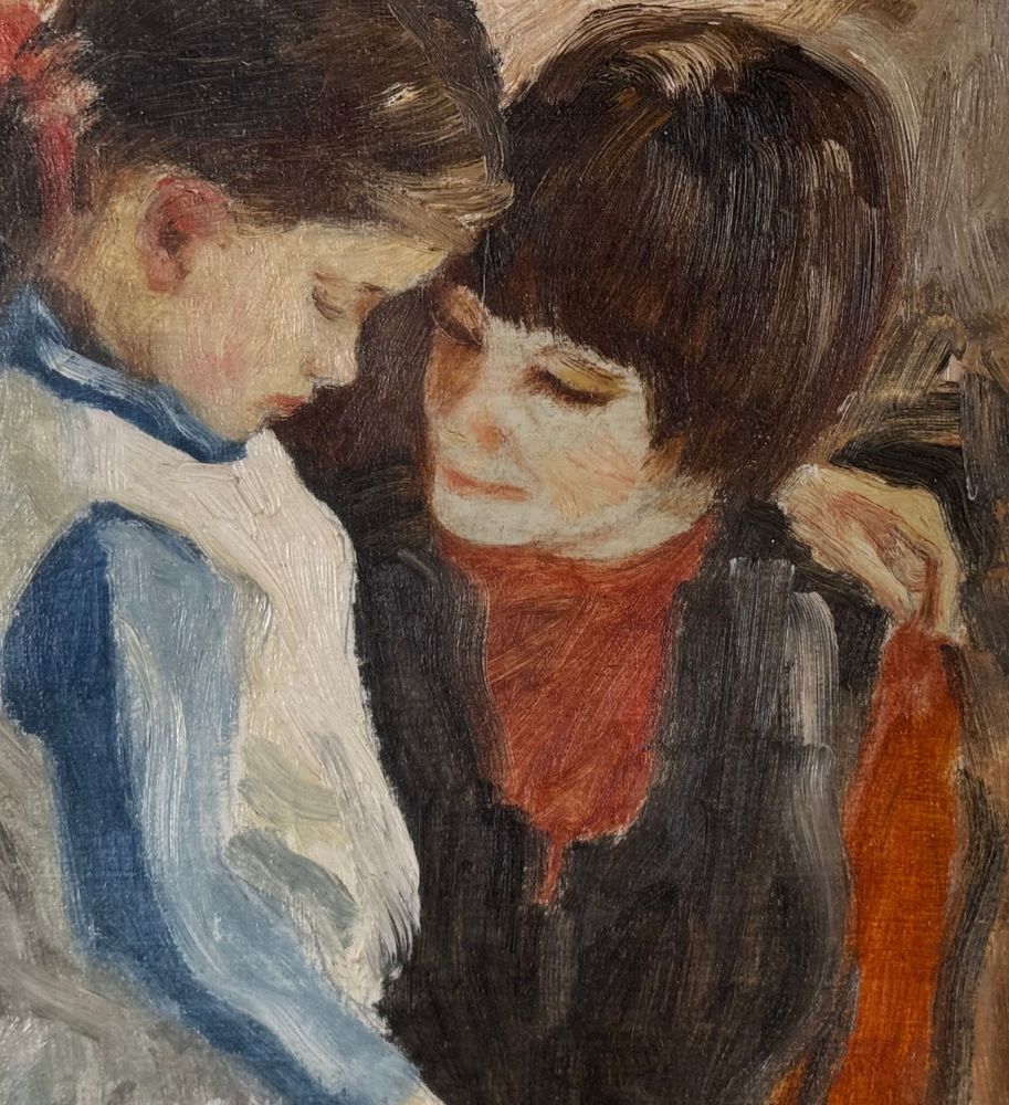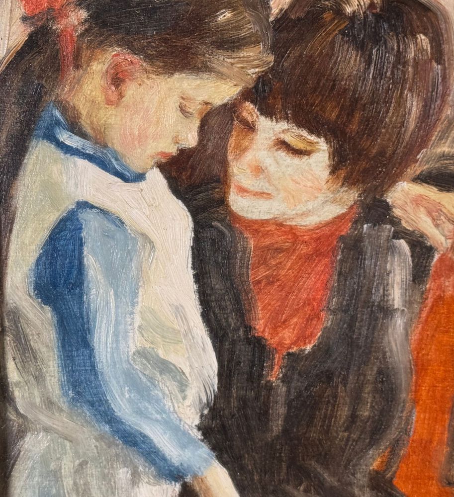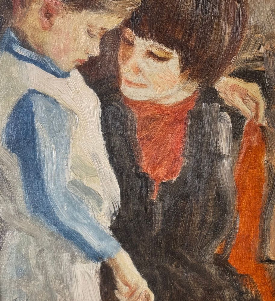 Dipinto olio su tela, periodo XX secolo, scuola Italiana, raffigurante Scena materna. Dimensioni compreso cornice: 47x53 cm. Dimensioni interno cornice: 24x30 cm. Firmato in basso a sinistra Antonio Asturi. Opera in buone condizioni.