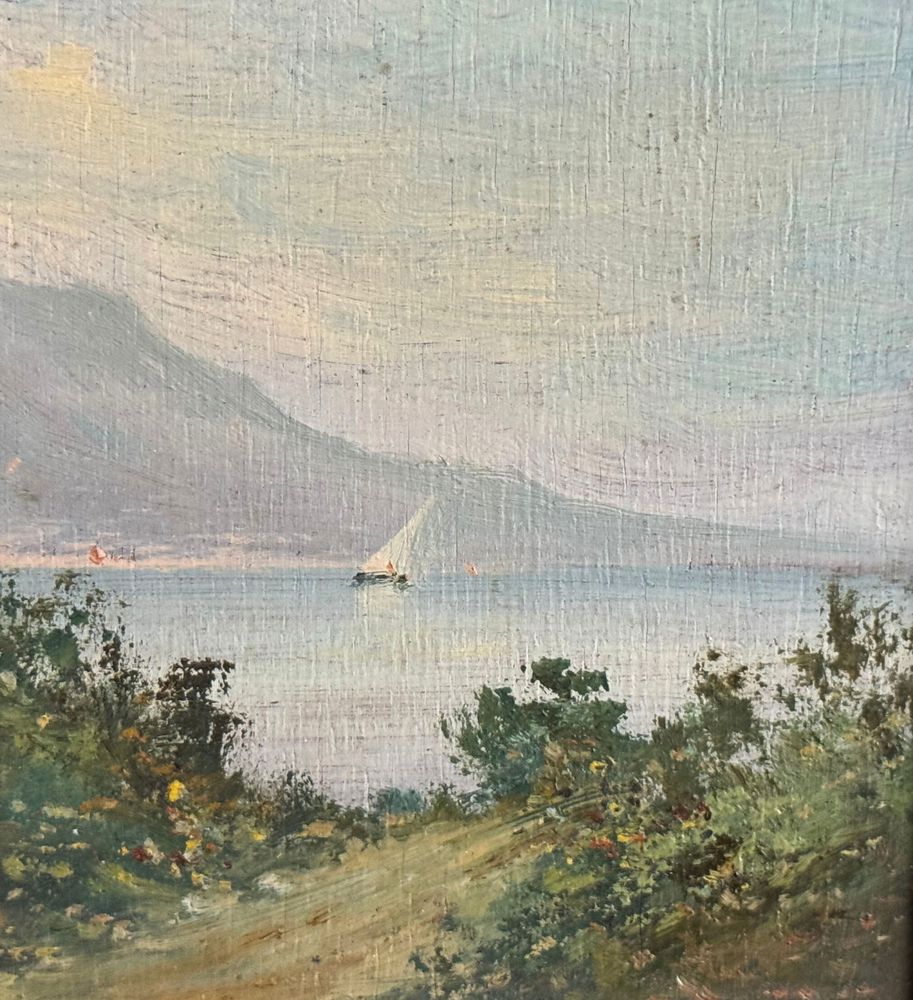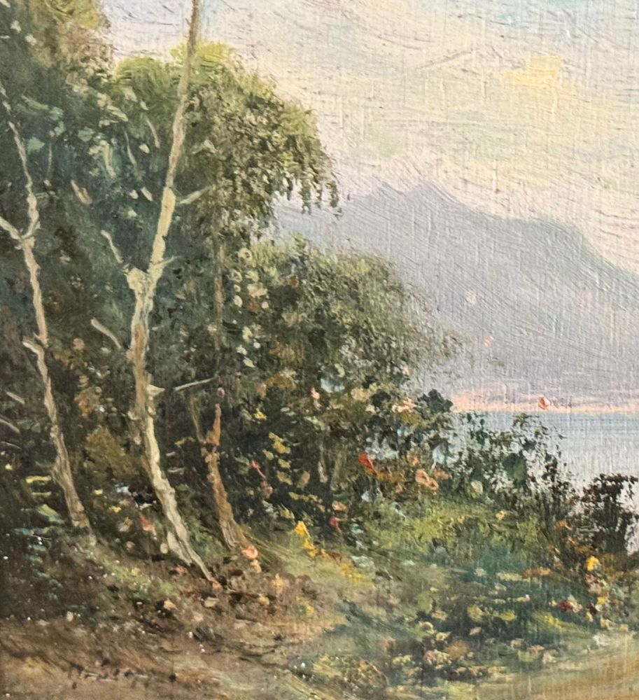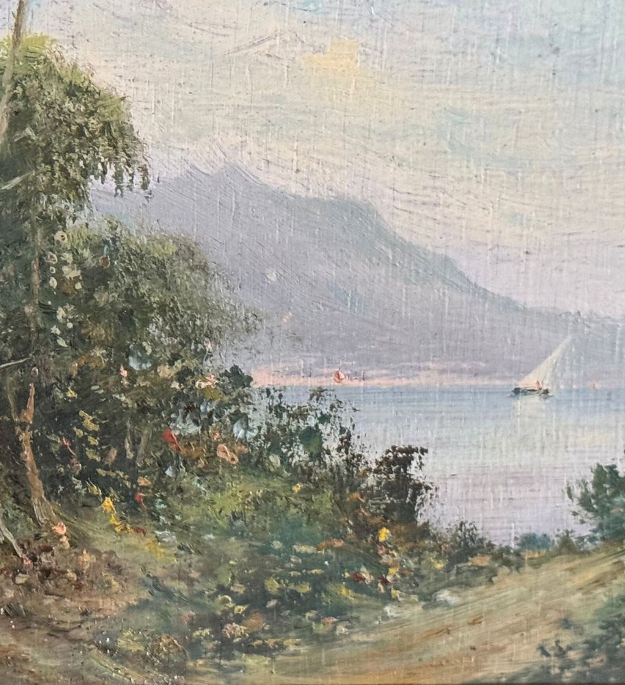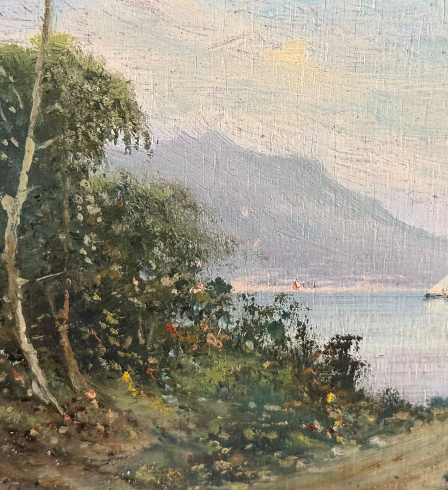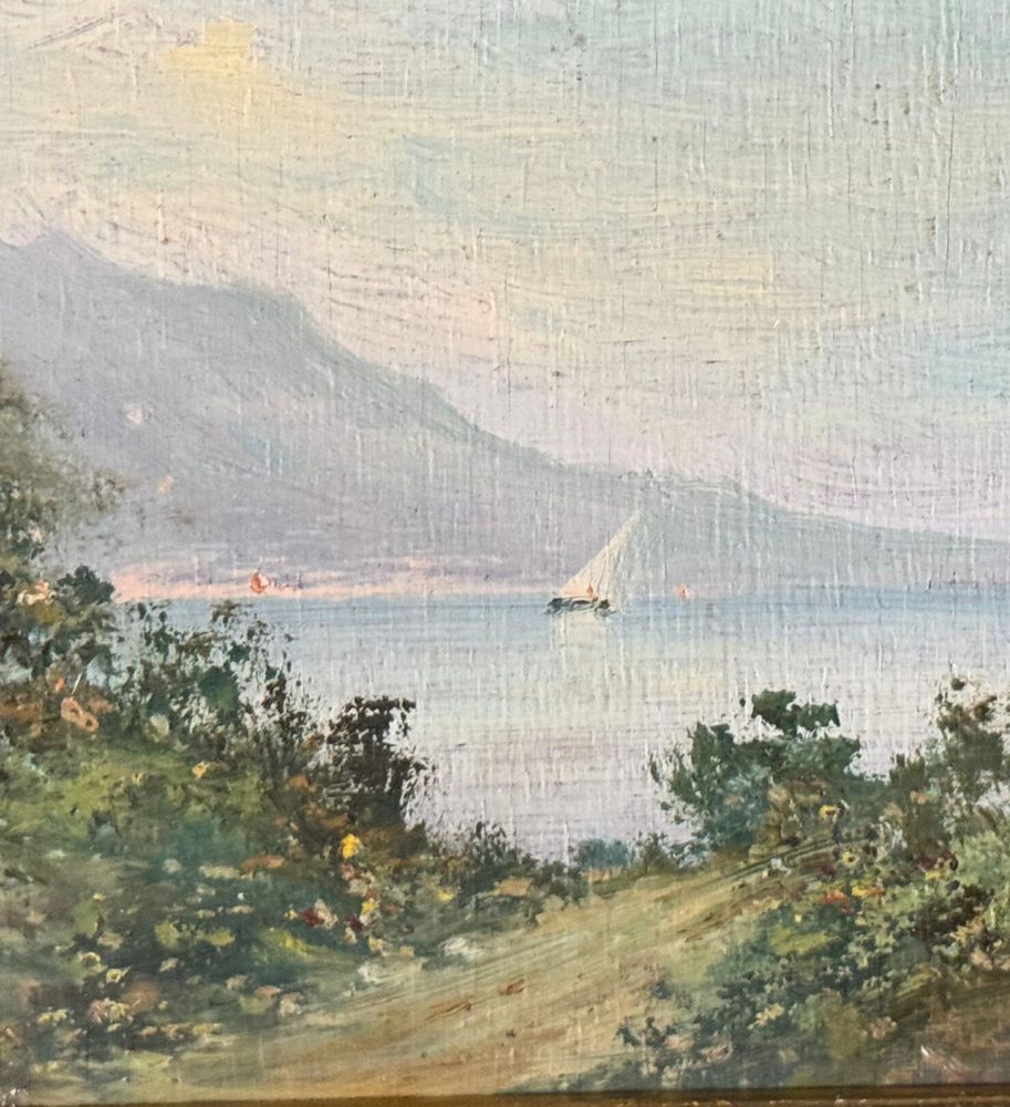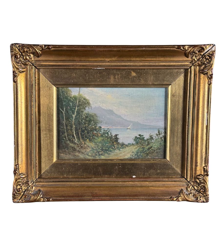 Dipinto olio su tavola, periodo inizio XX secolo, scuola Italiana raffigurante Paesaggio marino. Dimensioni compreso cornice: 30x24 cm. Dimensioni interno cornice: 12x18 cm. Firmato in basso a sinistra Radames Scoppa. Opera in buone condizioni.