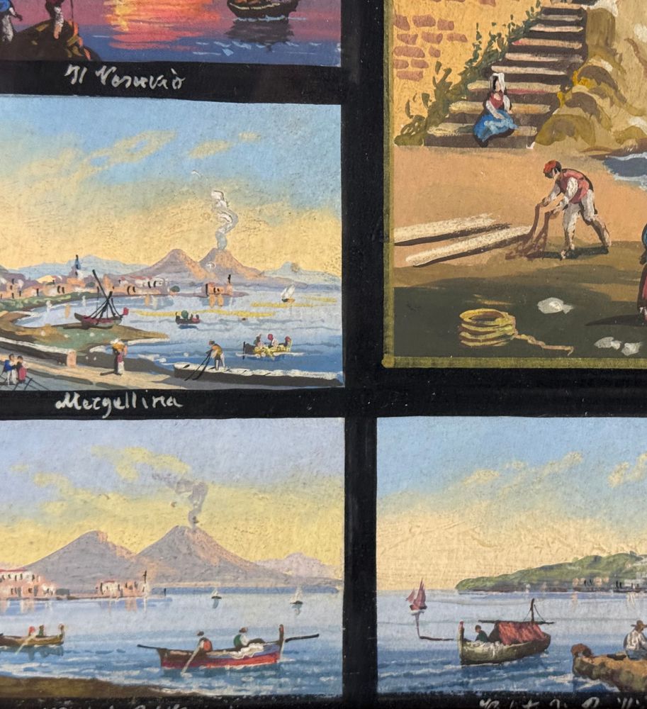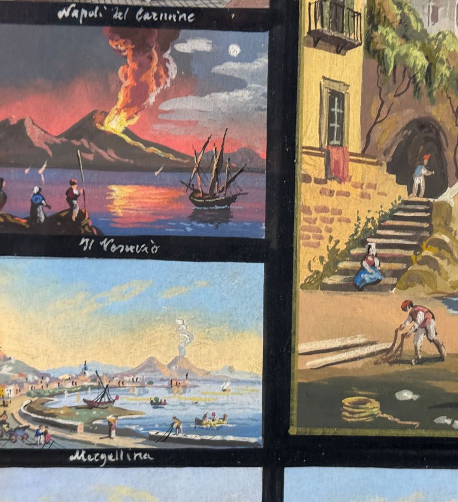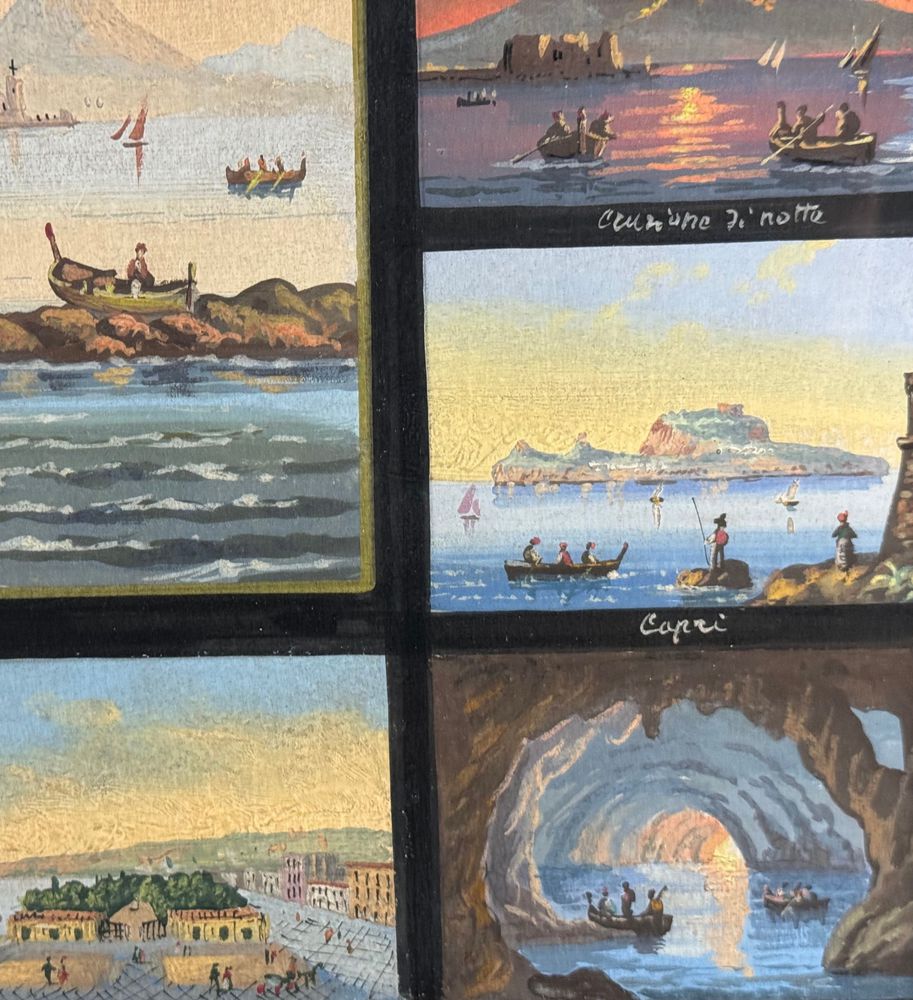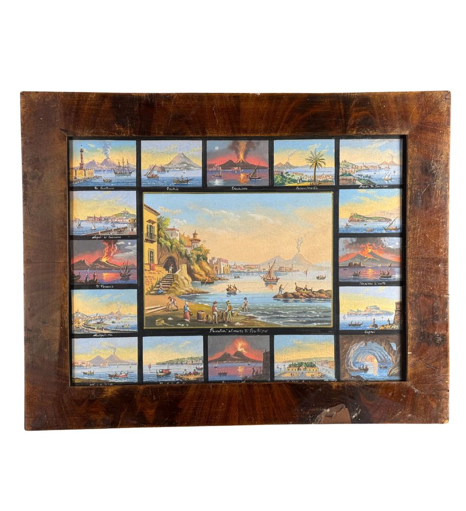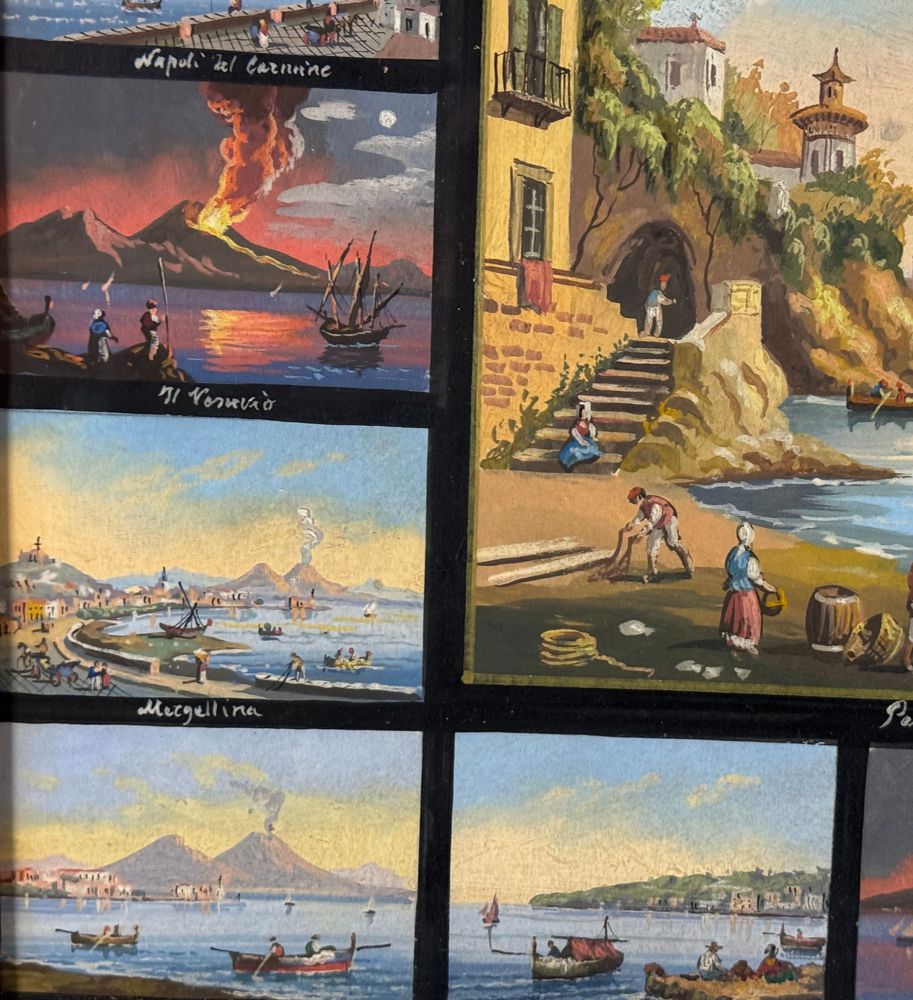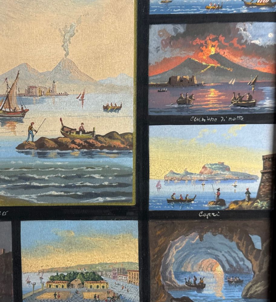 Dipinto guazzo (tempera su carta), periodo inizio XIX/XX secolo, scuola Italiana raffigurante Raggruppamento di 17 vedute di varie località partenopee. Dimensioni compreso cornice: 55,5x43,5 cm. Dimensioni interno cornice: 44x32 cm. Da artista anonimo. Opera in buone condizioni. Cornice difetti e mancanze.