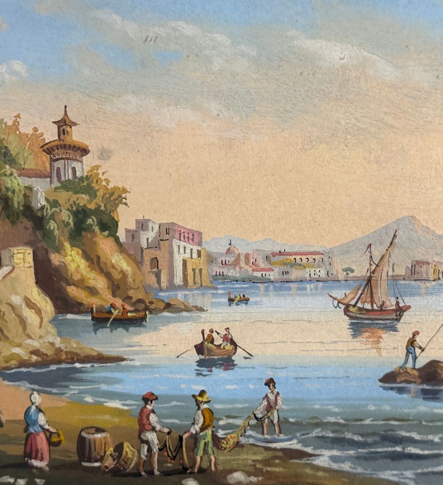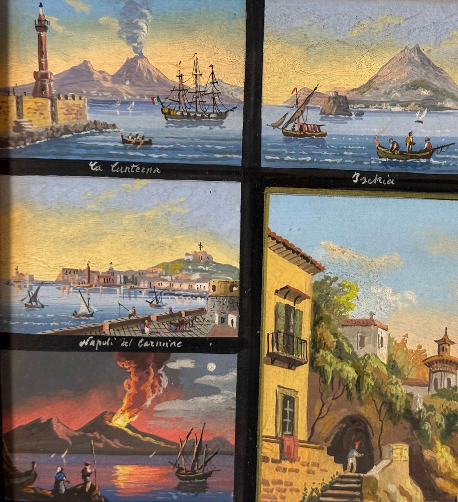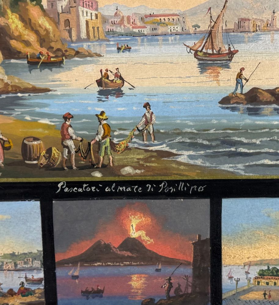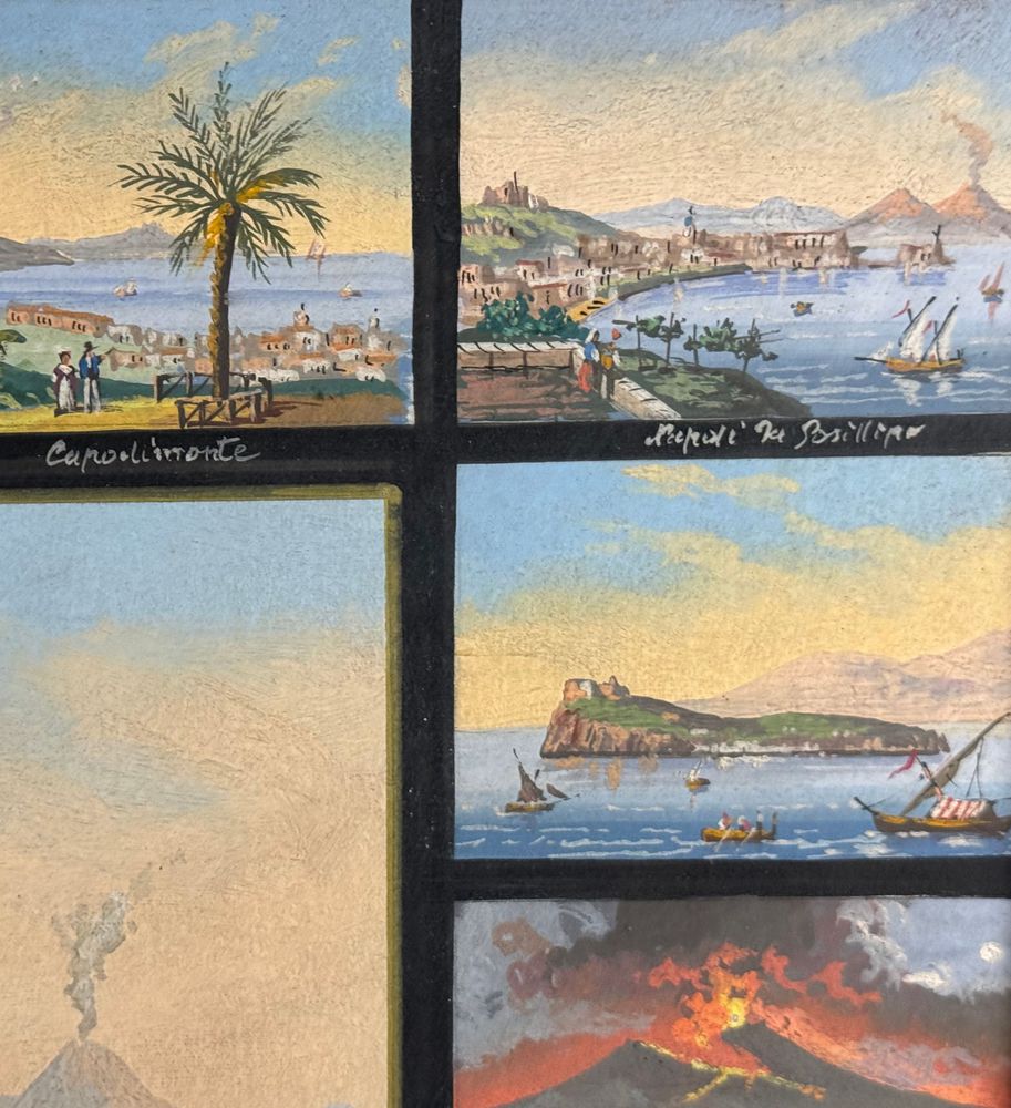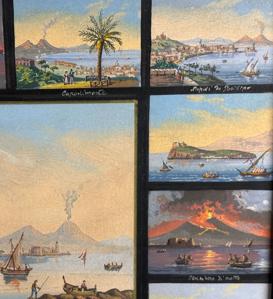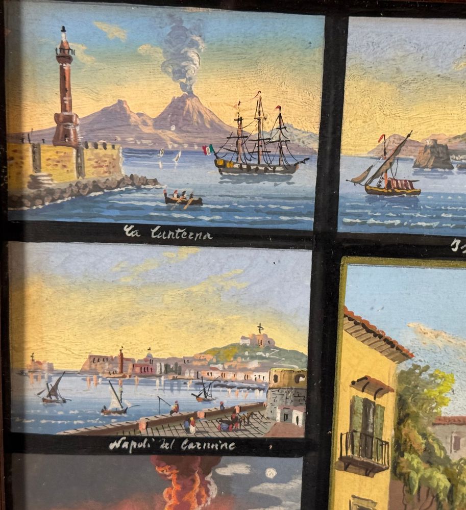 Dipinto guazzo (tempera su carta), periodo inizio XIX/XX secolo, scuola Italiana raffigurante Raggruppamento di 17 vedute di varie località partenopee. Dimensioni compreso cornice: 55,5x43,5 cm. Dimensioni interno cornice: 44x32 cm. Da artista anonimo. Opera in buone condizioni. Cornice difetti e mancanze.