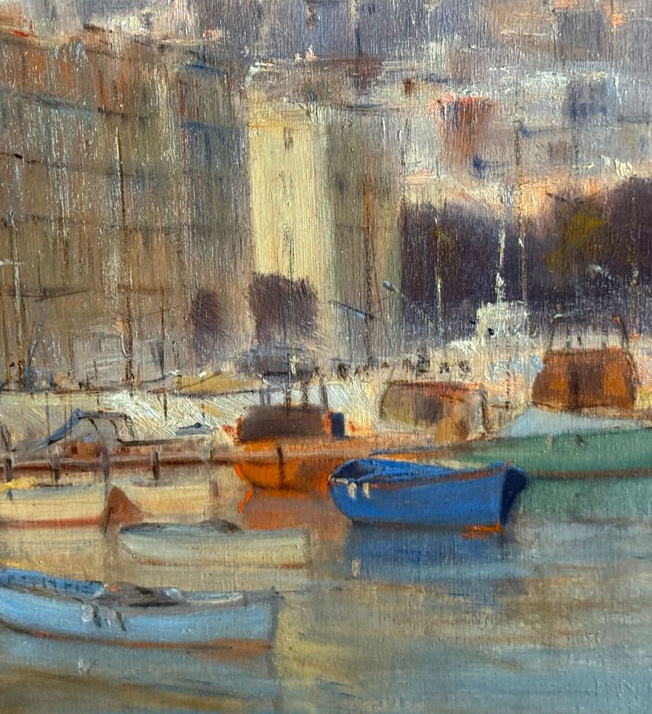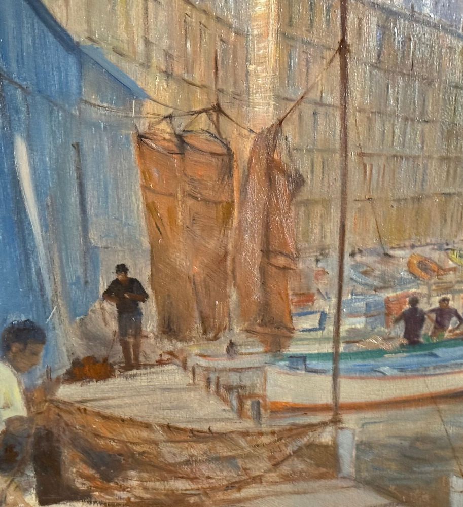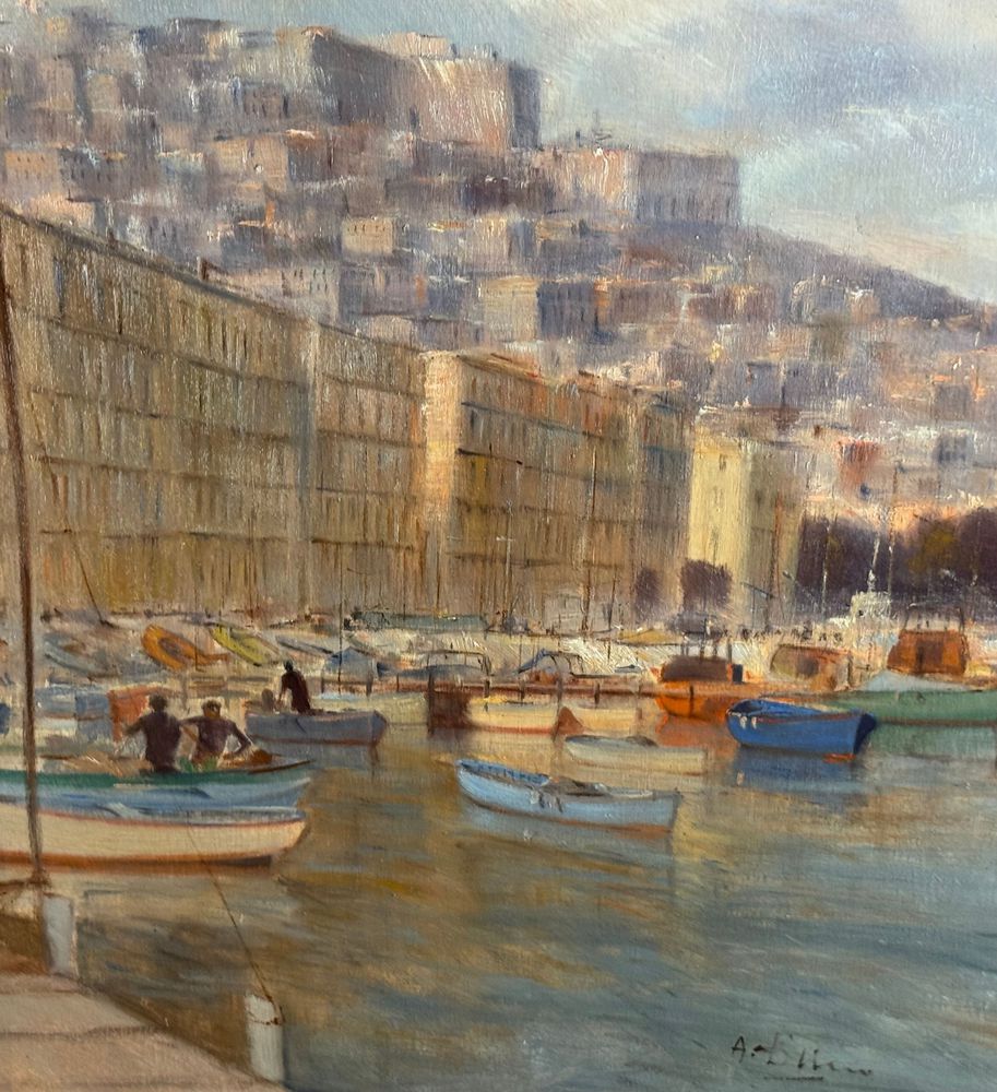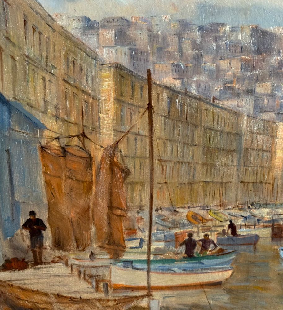 Dipinto olio su tavola, periodo XX secolo, scuola Italiana, raffigurante Scorcio di marina con barche e pescatori. Dimensioni compreso cornice: 68x58 cm. Dimensioni interno cornice: 60x50 cm. Firmato in basso a destra Antonio D'Urso. Opera in buone condizioni.